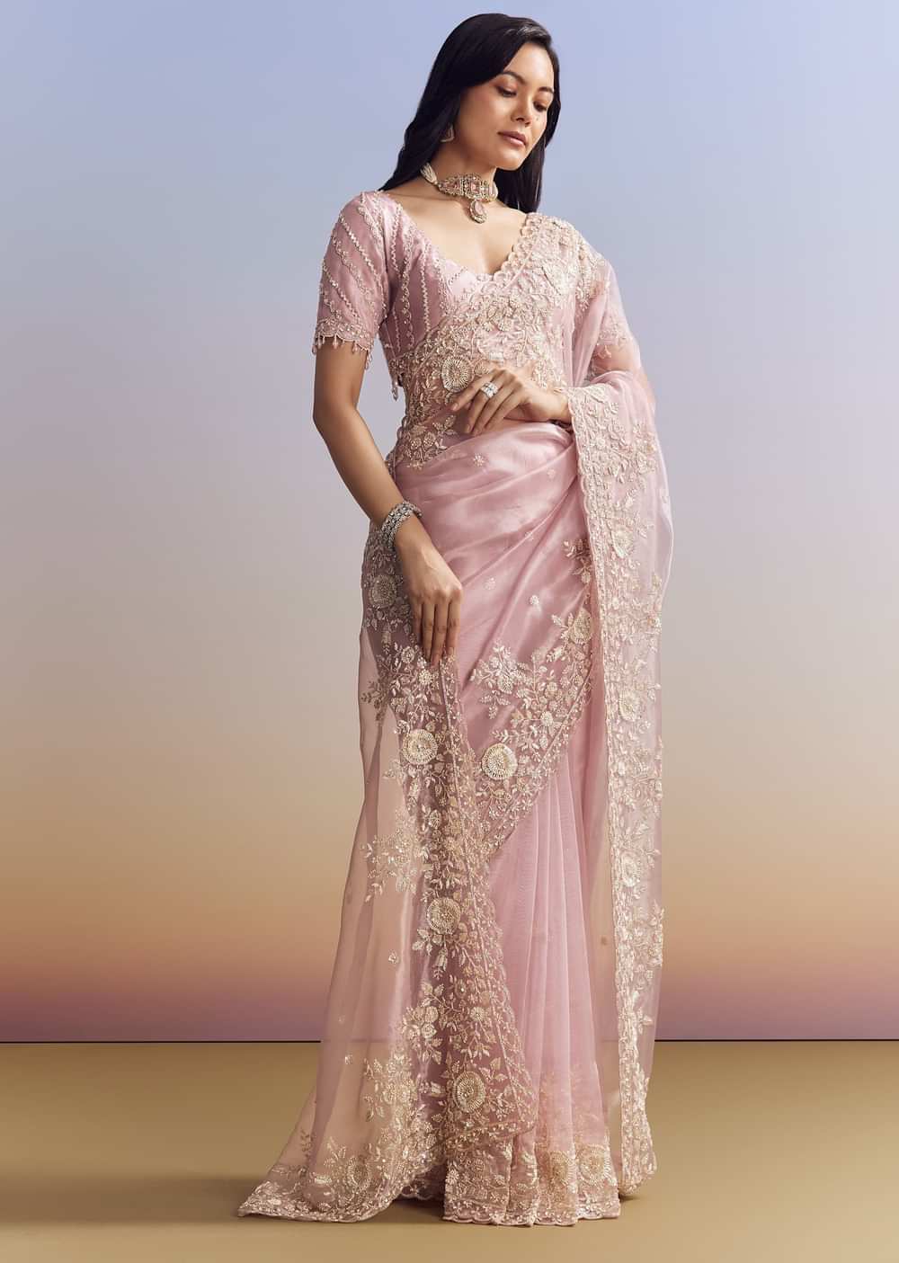 Perfect for engagement or sangeet, this pink tissue saree is intricately embroidered with cutdana, sequins, and beads. The scalloped border adds a dainty finish, while the matching blouse features rich detailing to complete the look. Includes an unstitched blouse. Awarded as the Most Trusted Brand, we're delivering styles you love, just as promised.