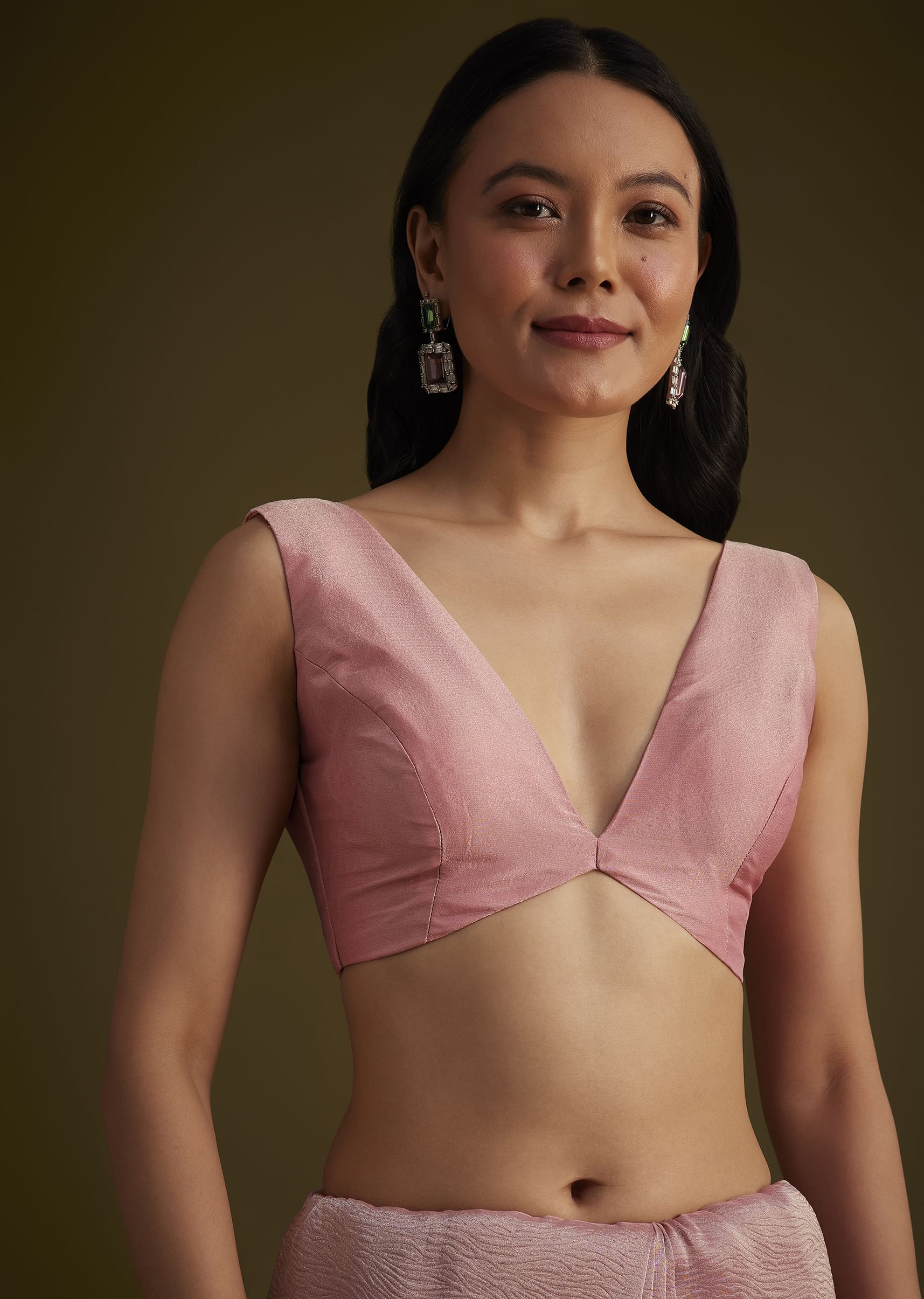 - Drape Yourself In Elegance With This Pink Tissue Saree Adorned With Intricate Floral Embroidery.