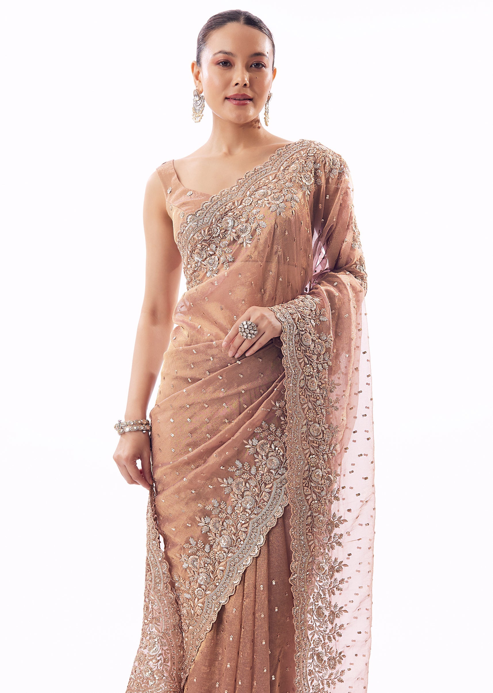 Pink Tissue Saree With Heavy Sequin And Cutdana Embroidered Border