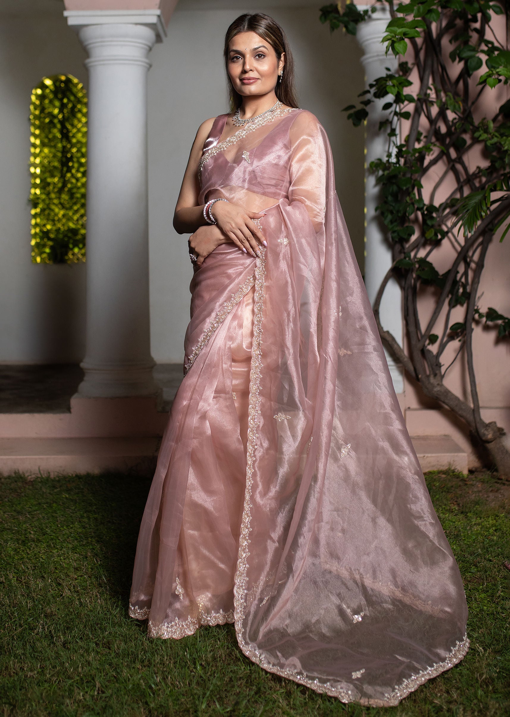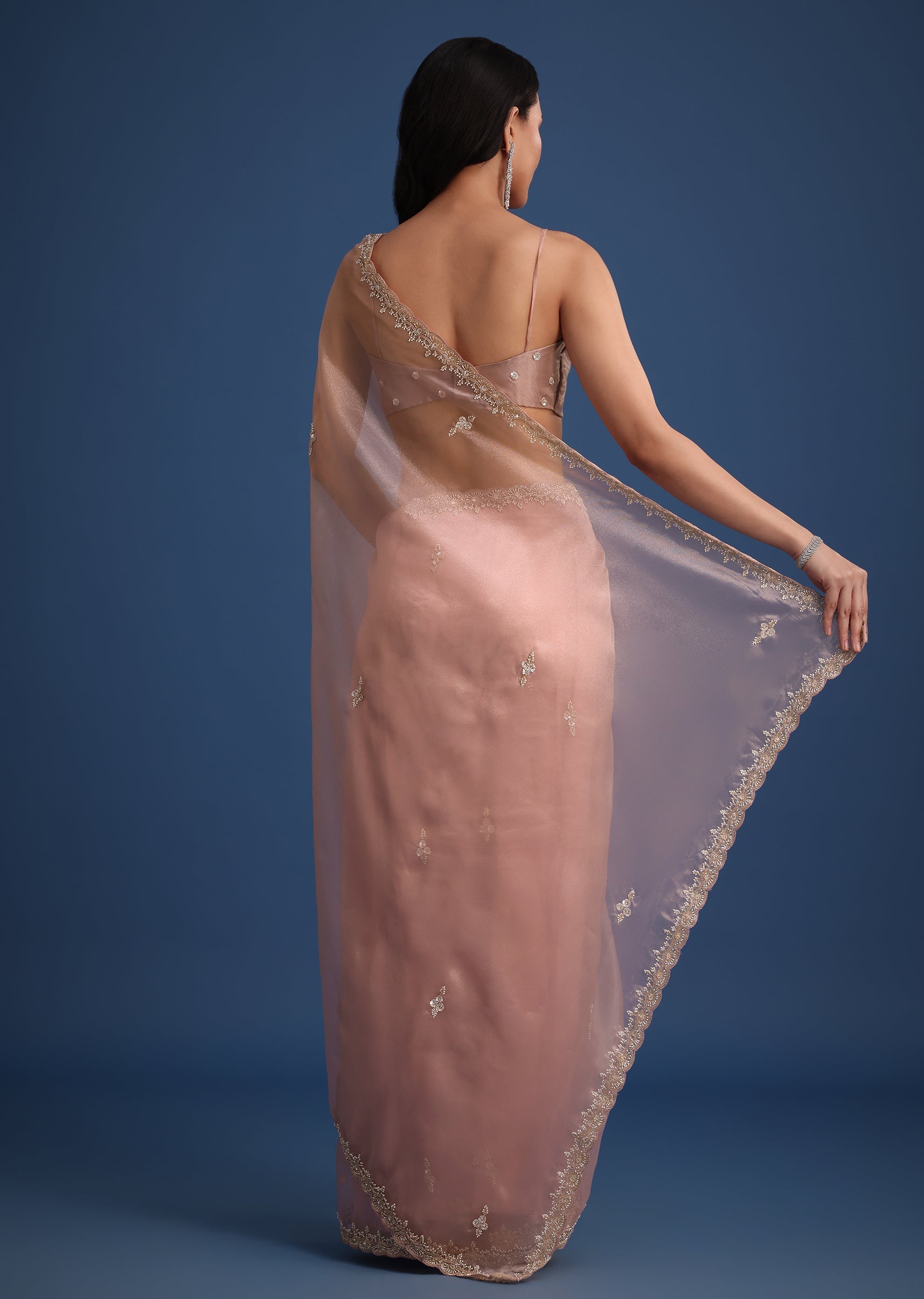 Pink Tissue Silk Cutdana Work Saree With Embellished Scallop Border