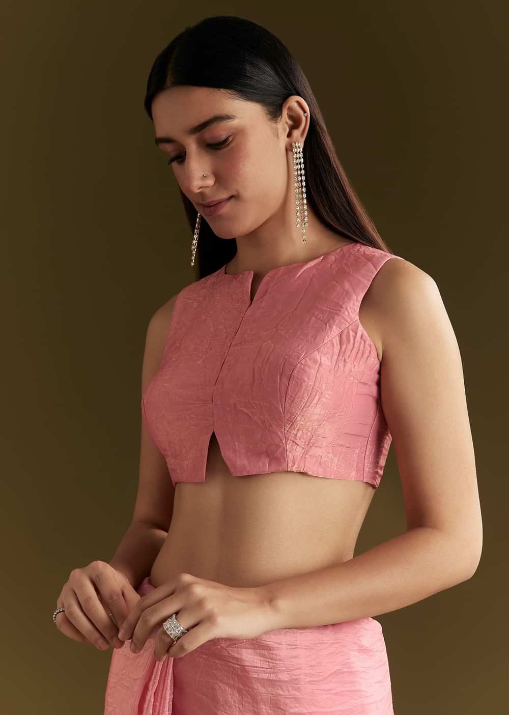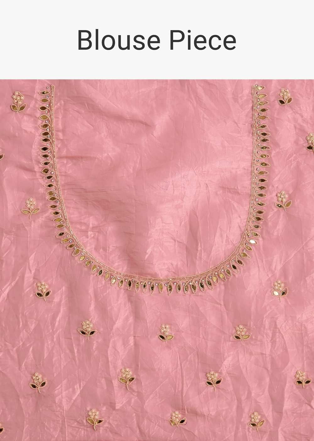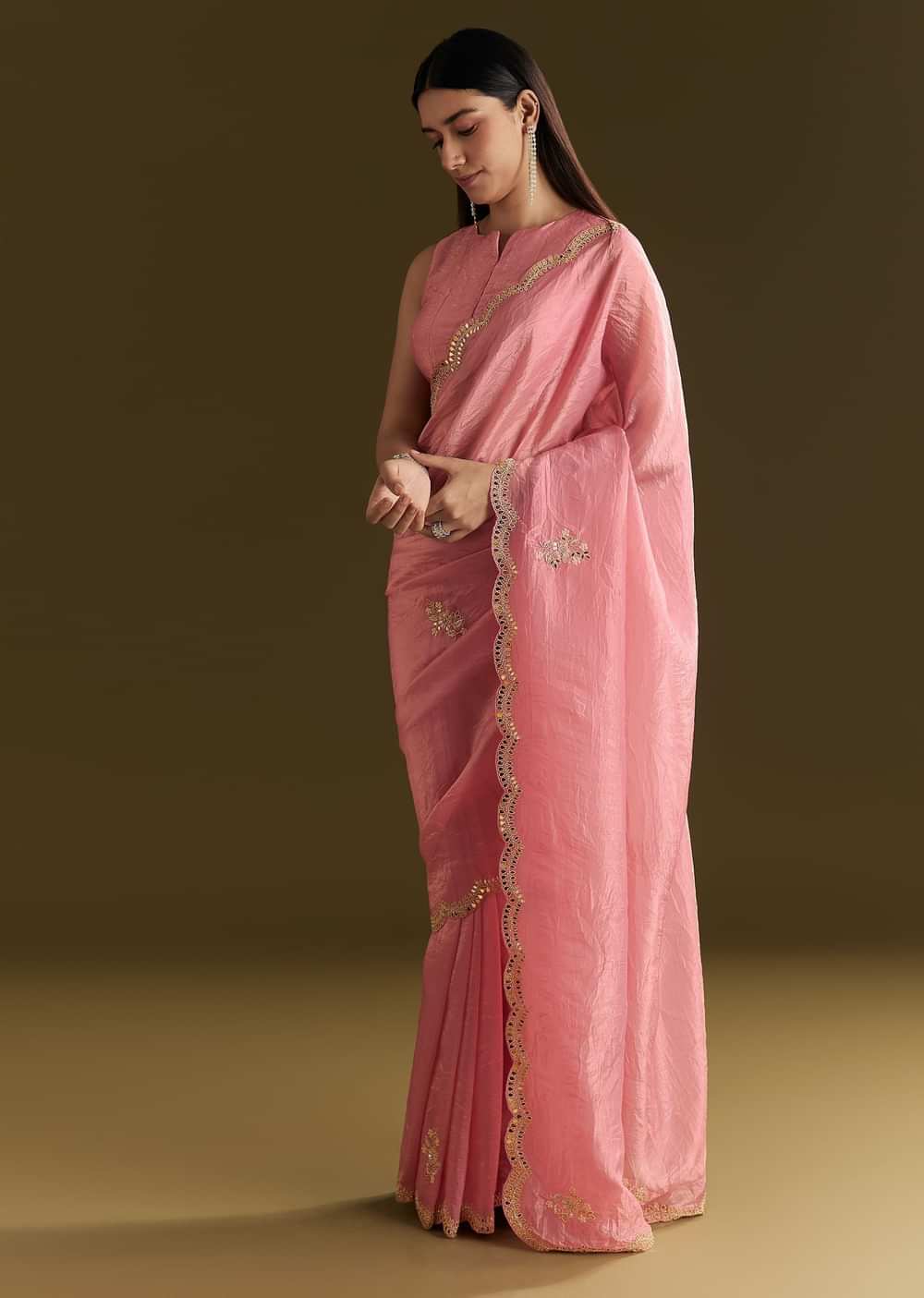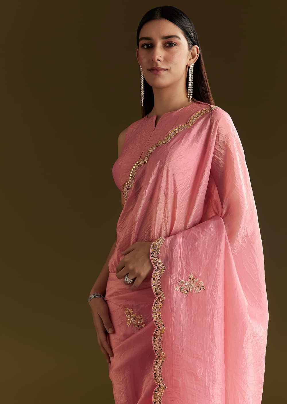 Steeped in tradition yet brimming with luxury, this pink tissue saree is poetry in motion. Embroidered with zardozi, gota patti, and cutdana, its scallop border adds the perfect finishing touch... More Product Details