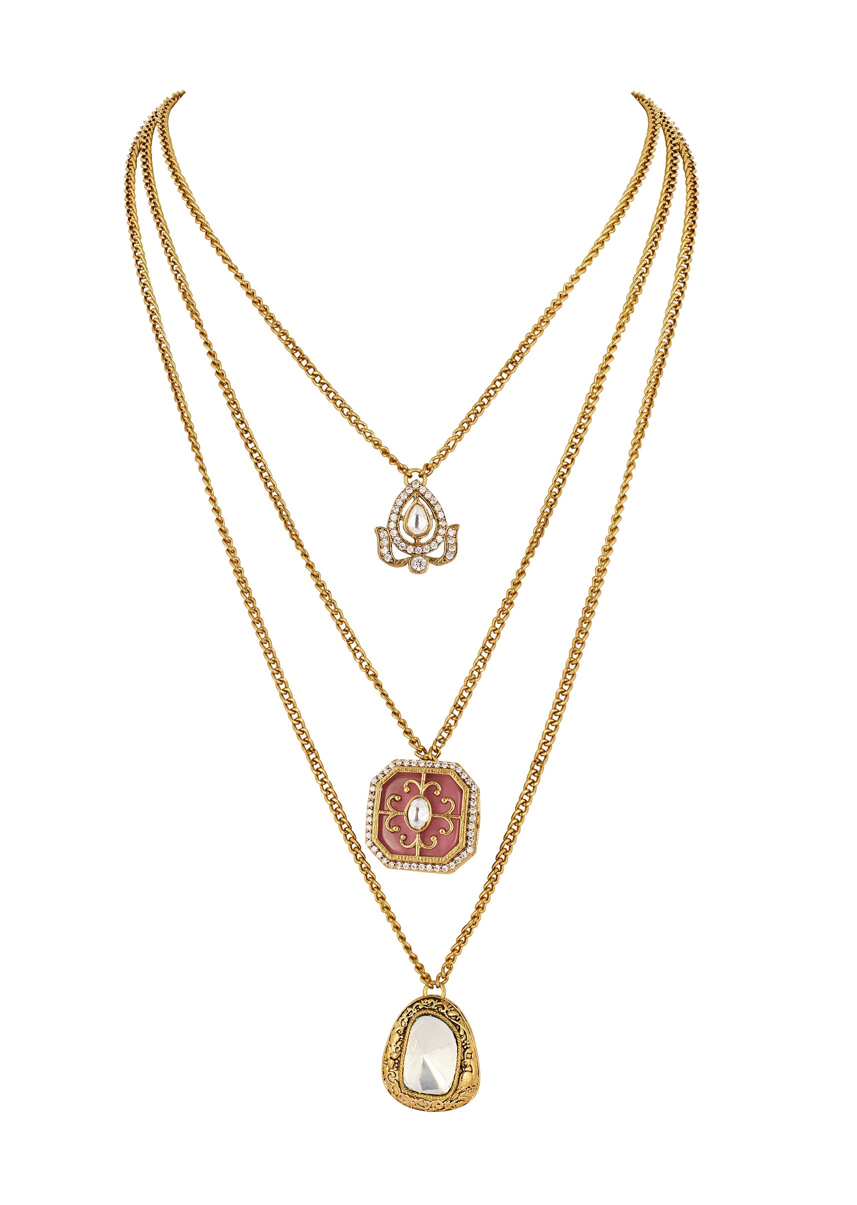 Graceful and statement making, this traditional gold tone kundan polki layered necklace is adorned with simulated coloured stones that add depth and royal charm to the design. The layered silhouette brings a rich festive appeal, perfect for elevating bridal and celebratory looks. Crafted to reflect timeless craftsmanship, it blends heritage aesthetics with elegant detailing. Awarded as the Most Trusted Brand, we're delivering styles you love, just as promised.