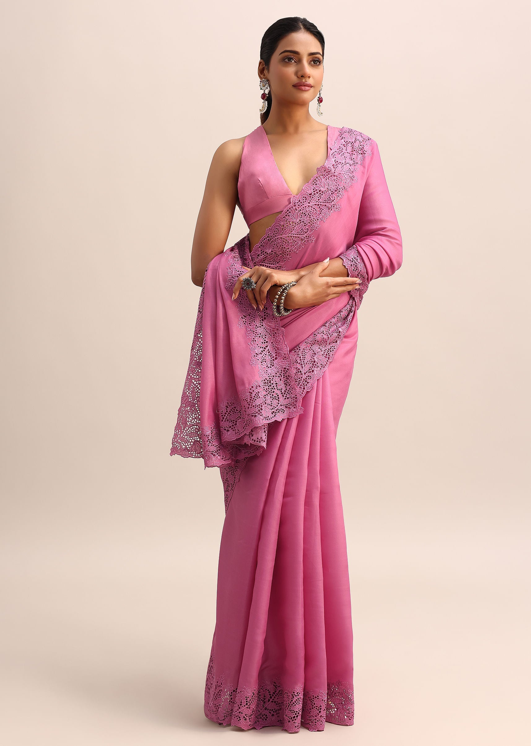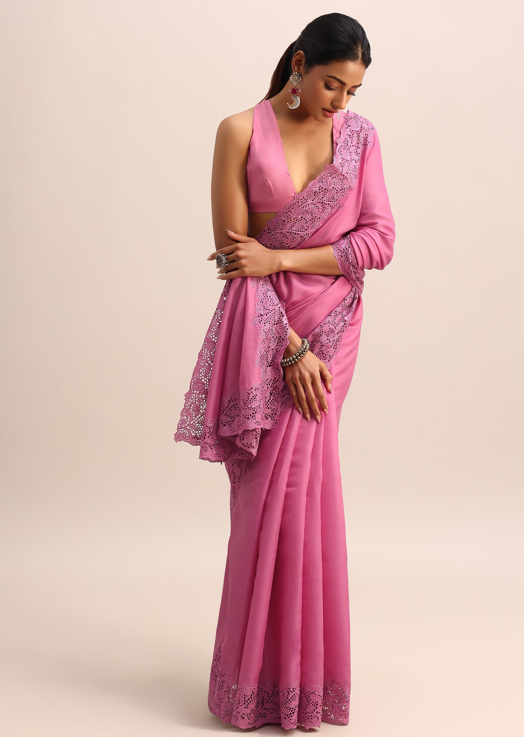 Pink Tussar Silk Saree With Thread And Cutwork On Border Pallu With Unstitched Blouse