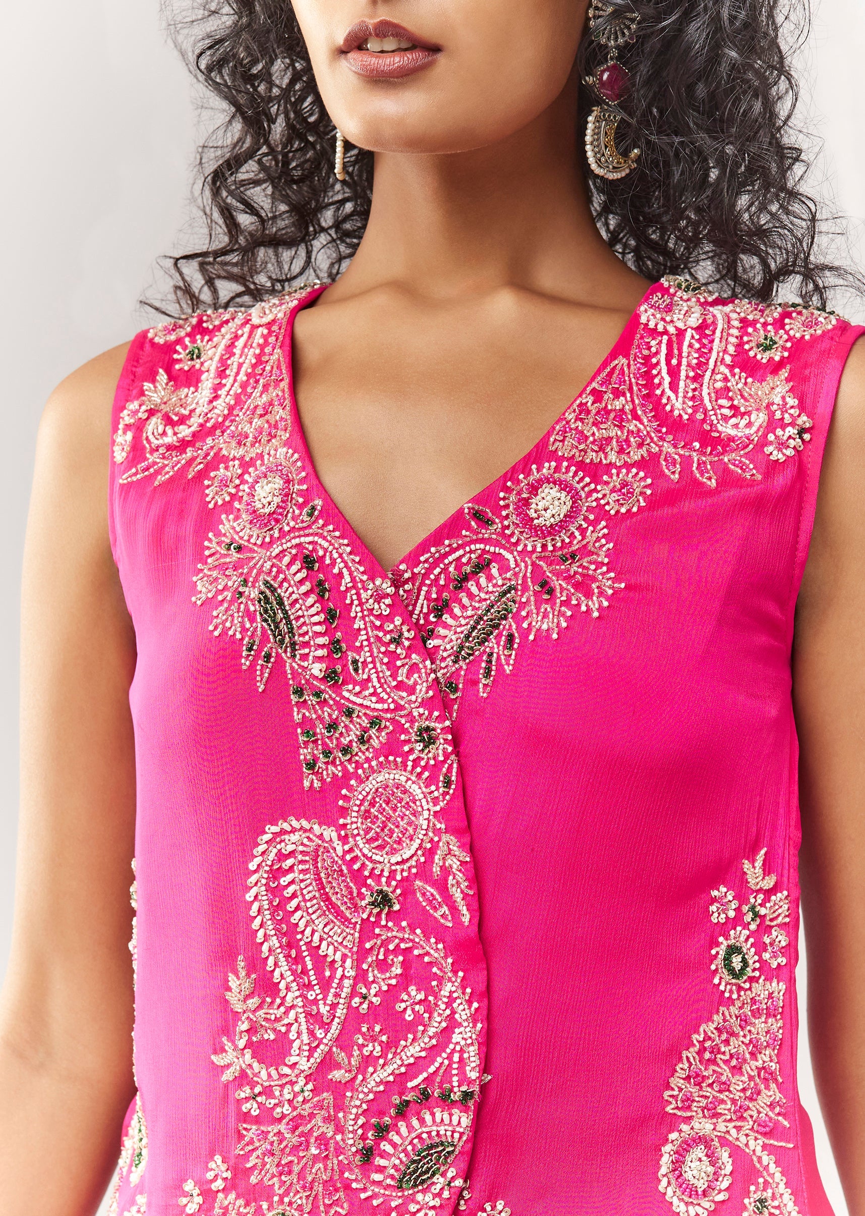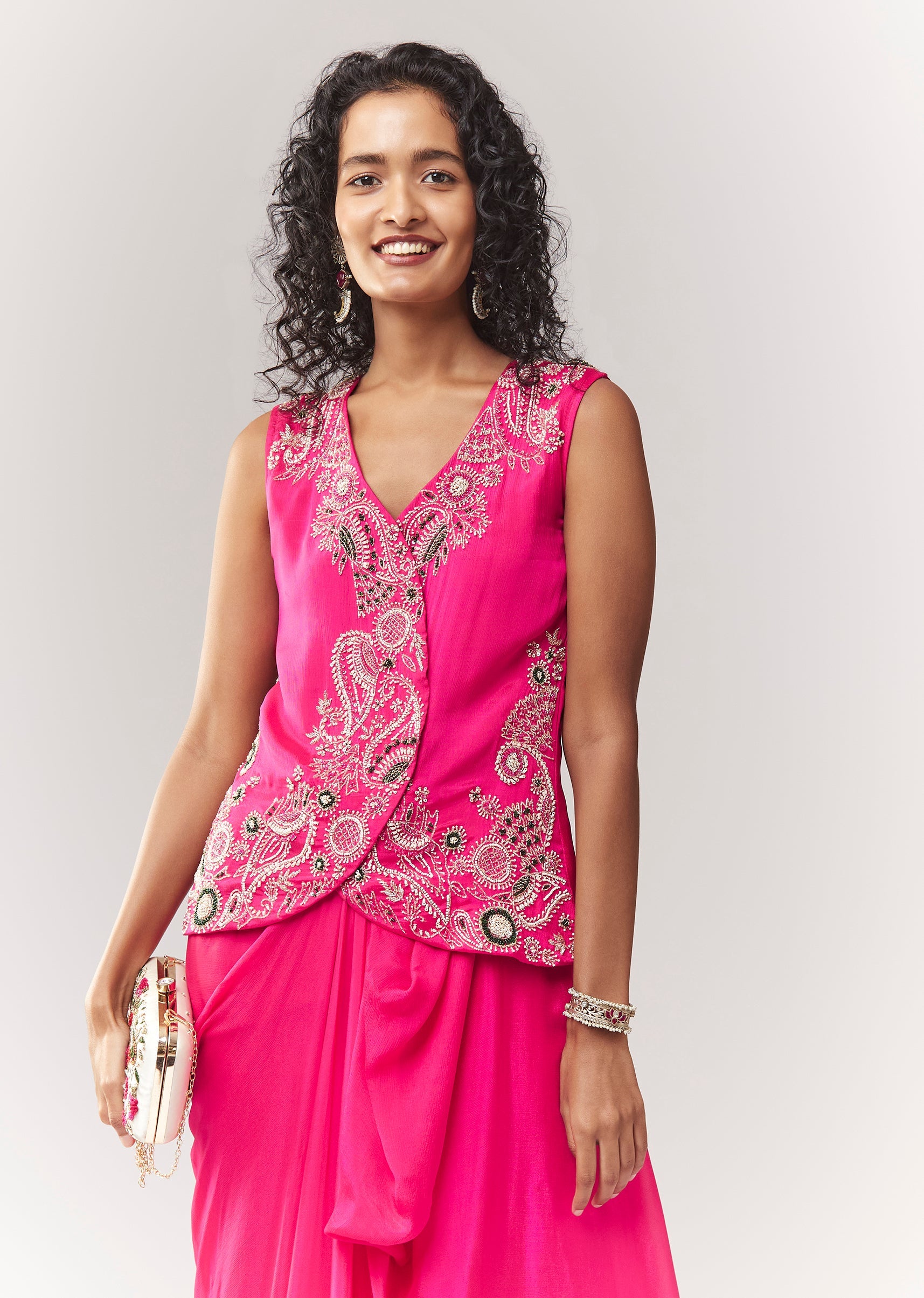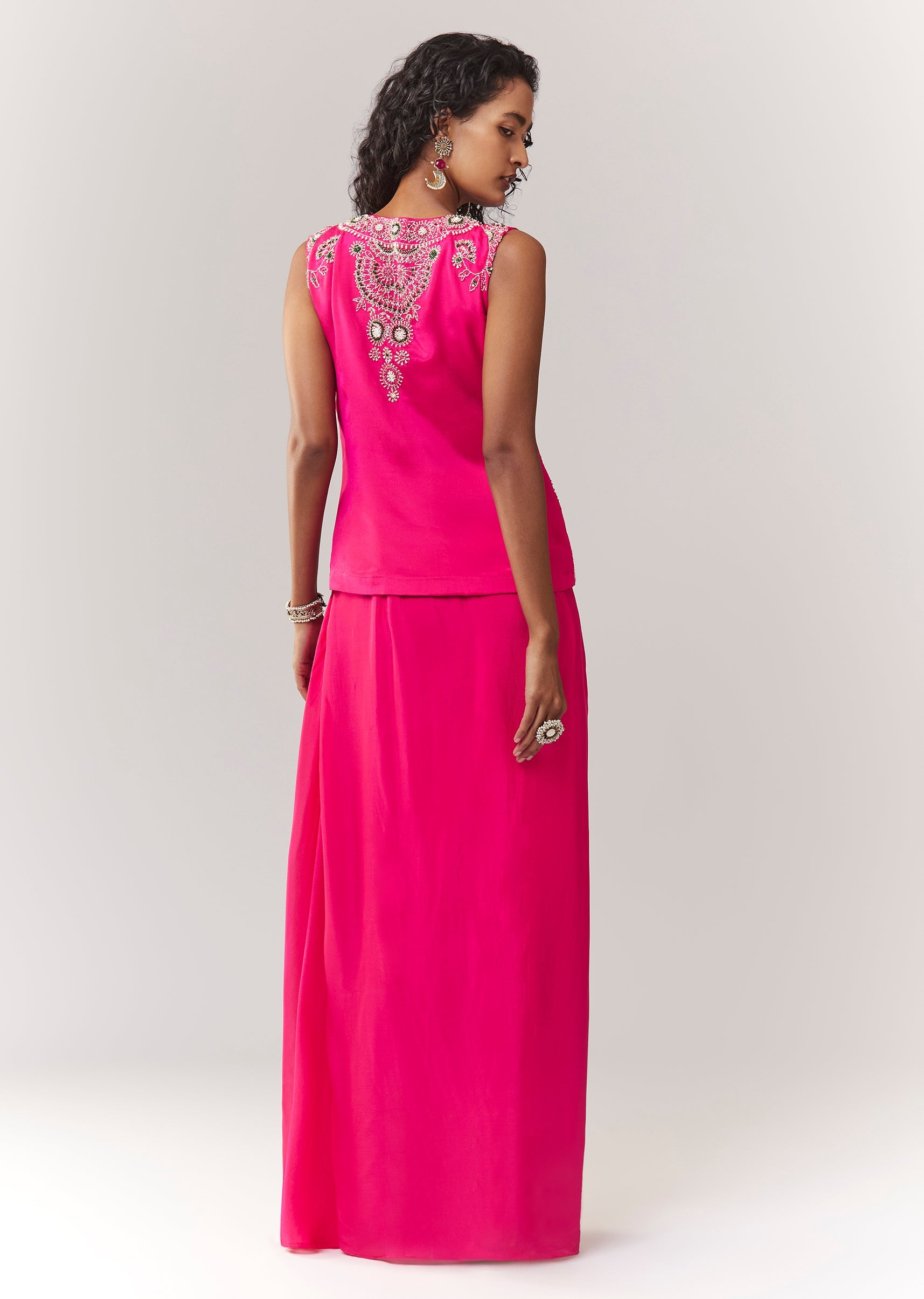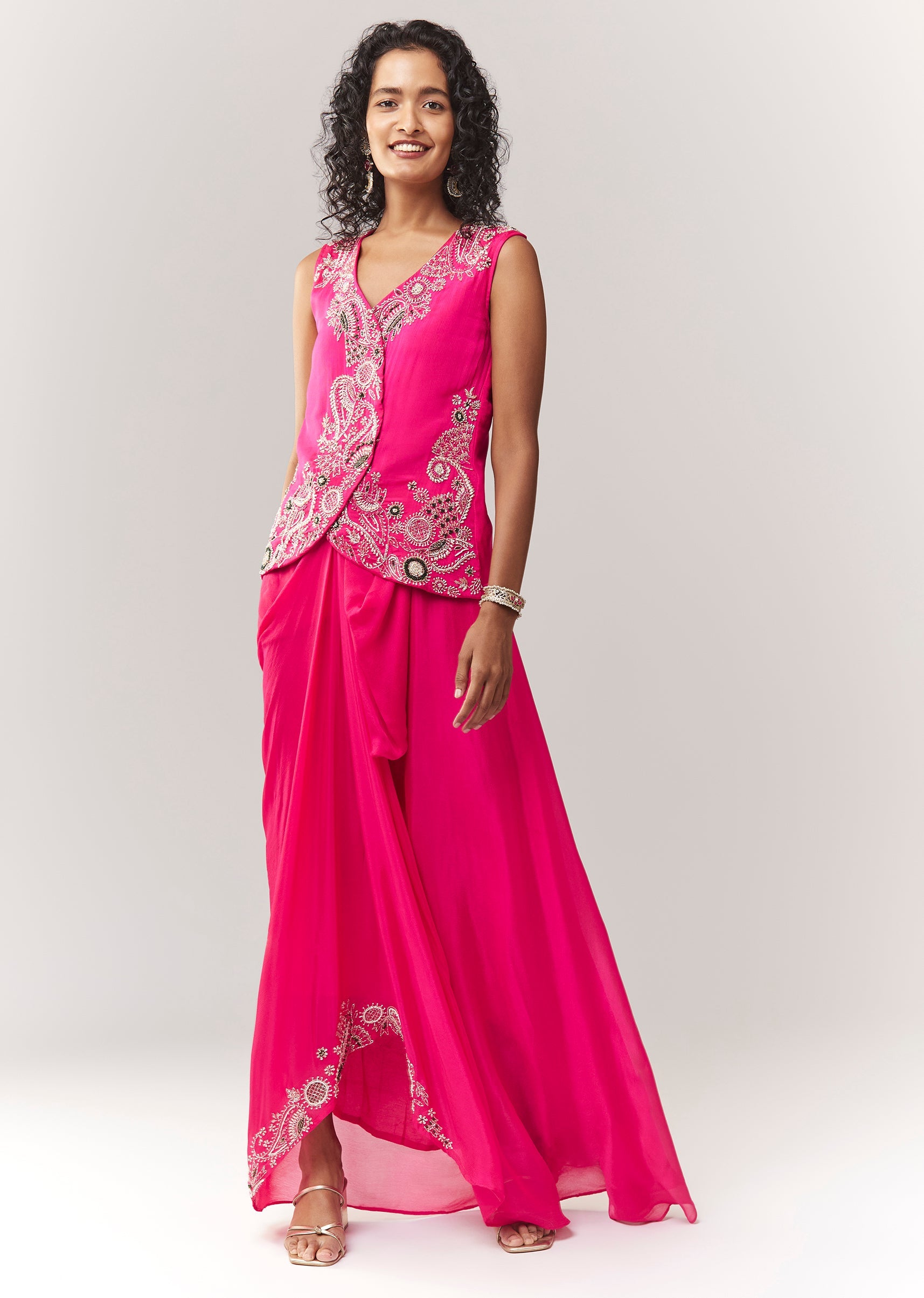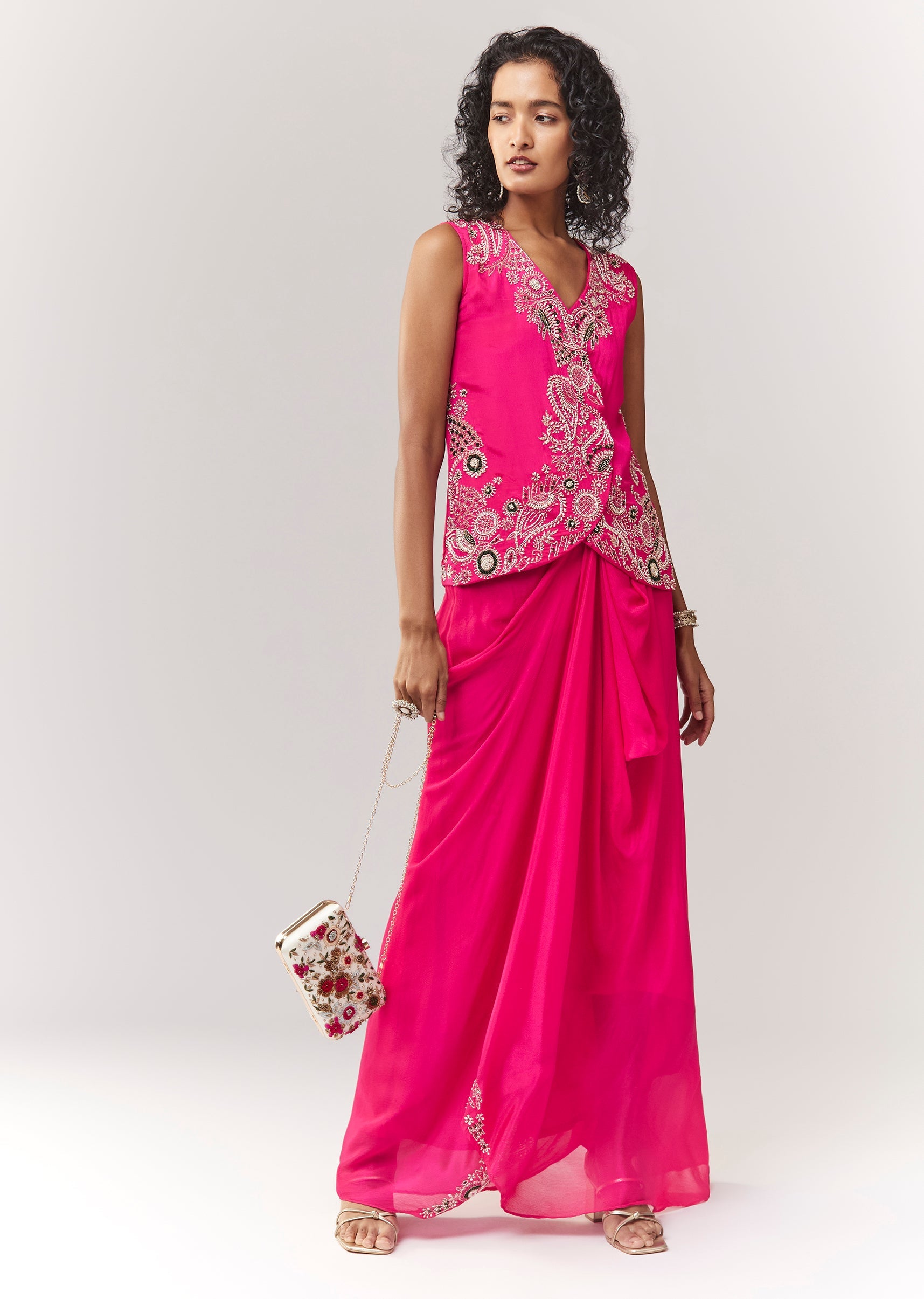 Pink Vest Style Croptop With Cutdana And Drape Skirt Set