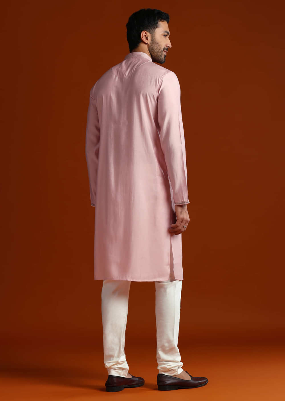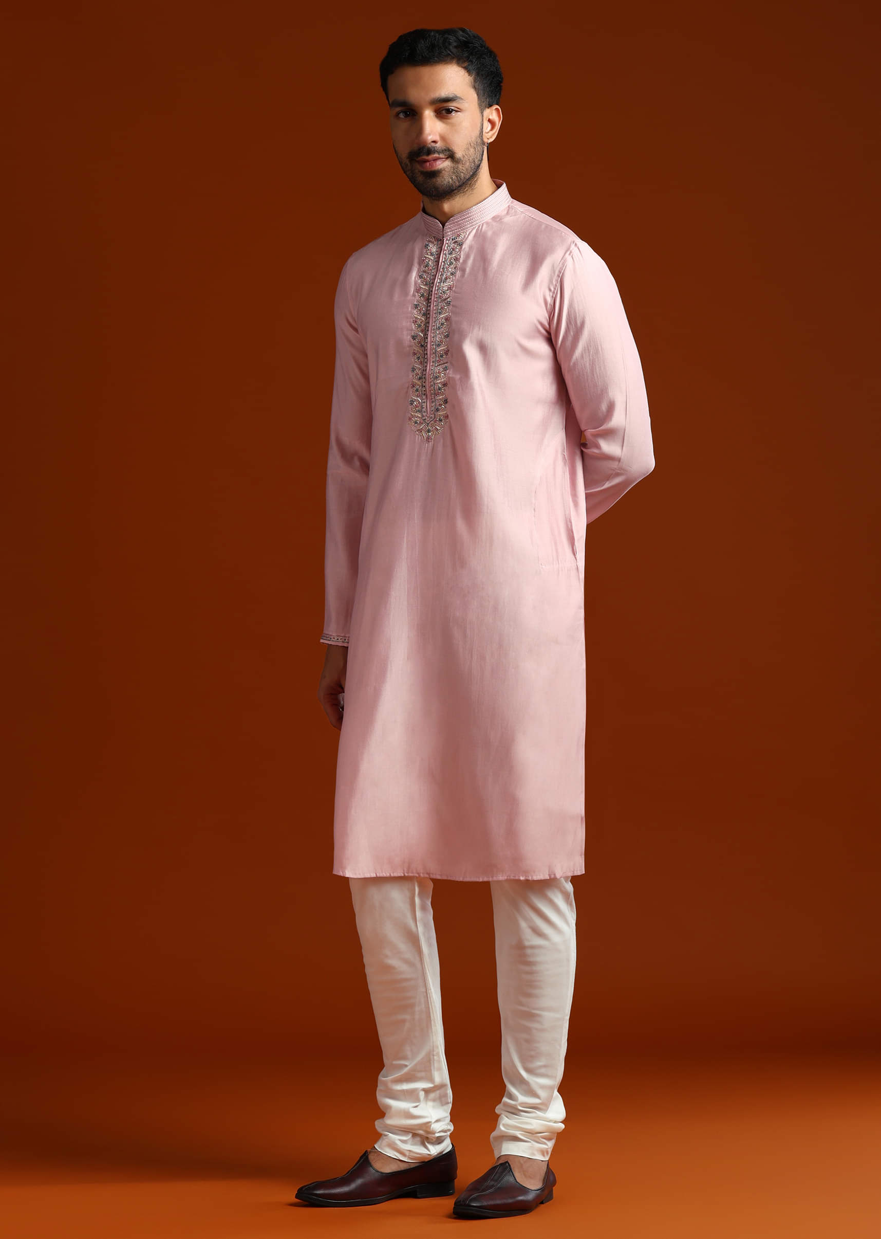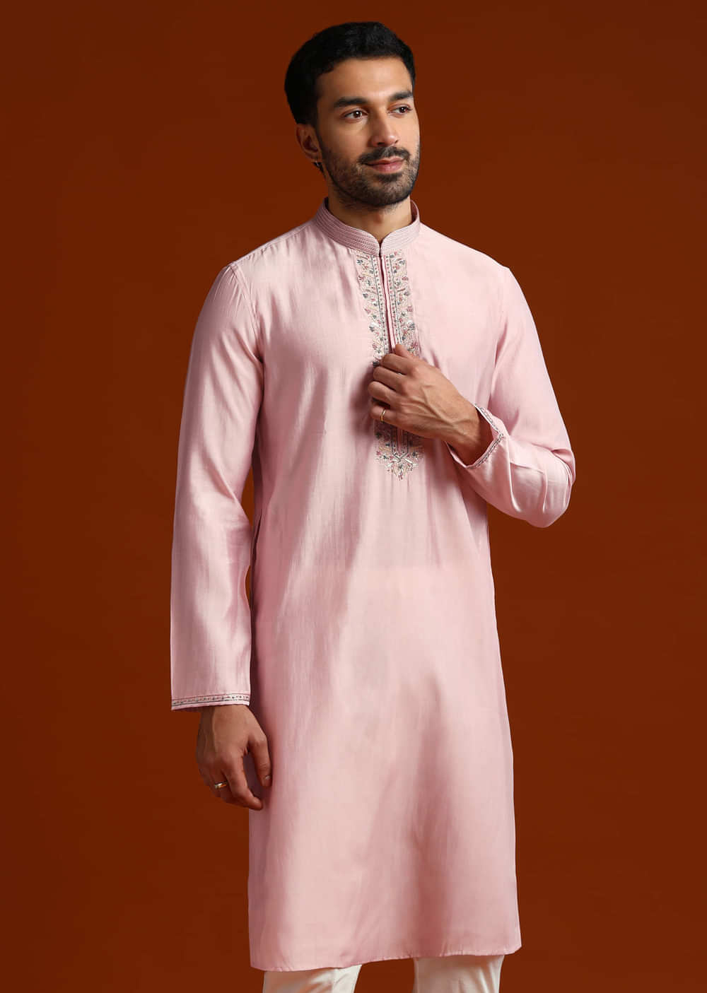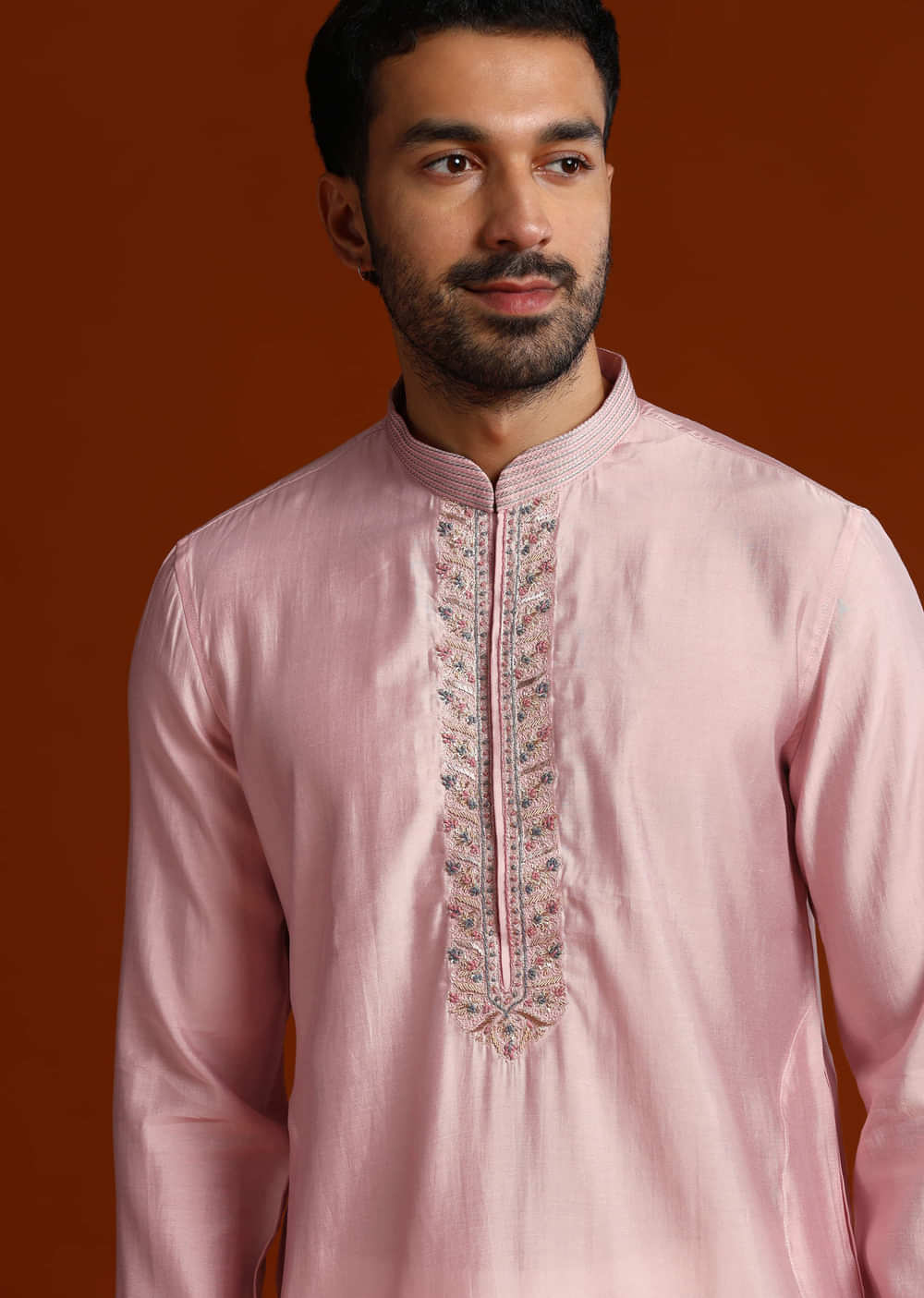 Pink Viscose Kurta Set For Men With Heavy Hand Embroidery