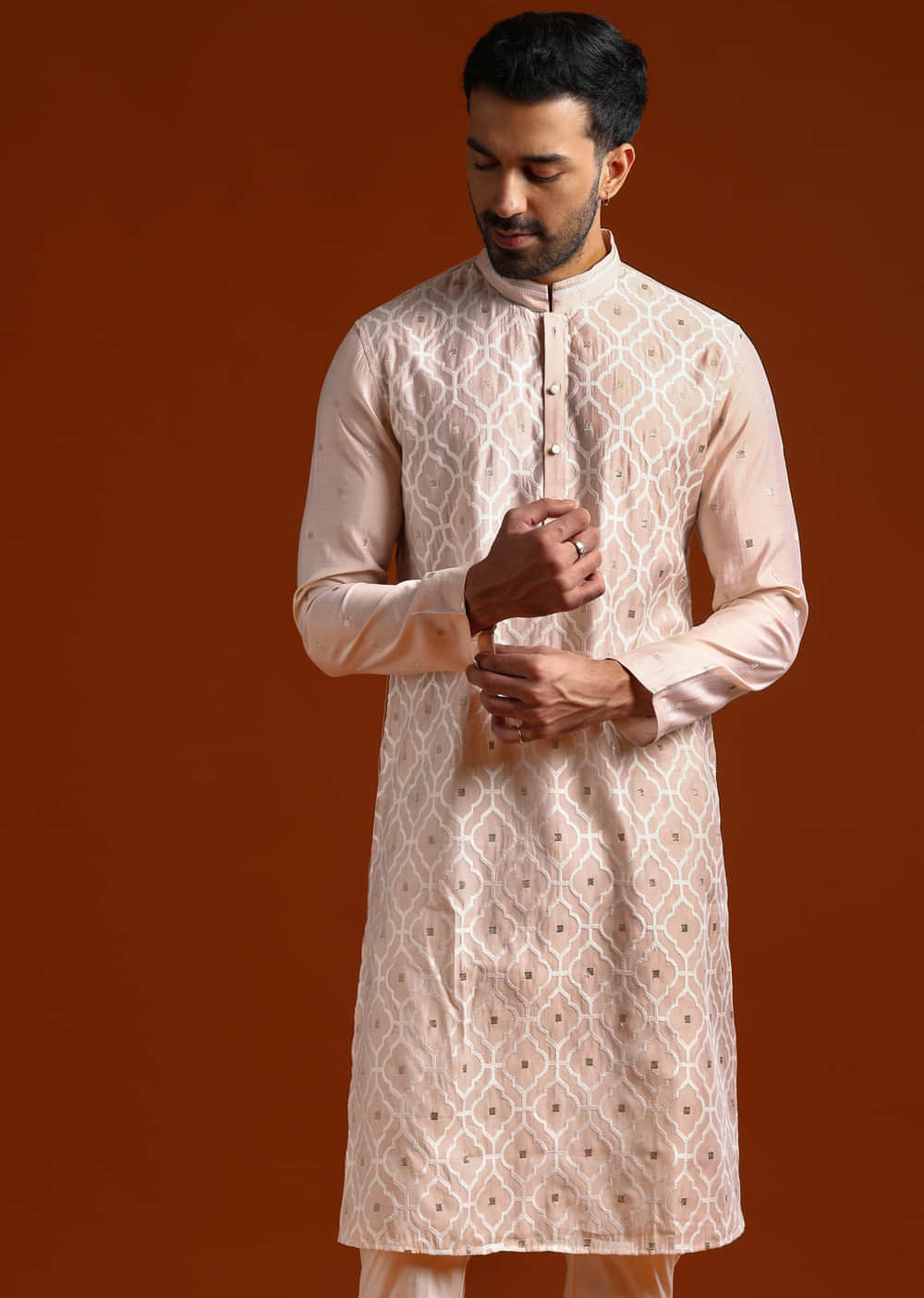 For gentle colour with polish, this pink viscose men’s kurta set draws crisp thread work along the front for definition. The shade reads flattering in daylight and evening light alike.... More Product Details