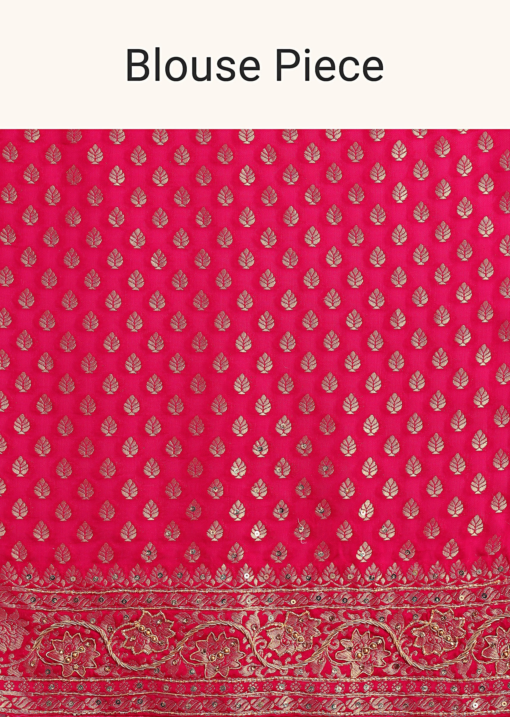 This pink zardosi work saree is your ticket to the fancy world. The heavy zardosi, cutdana, and stone embroidery create a dazzling display of intricate artistry. The unstitched blouse gives... More Product Details