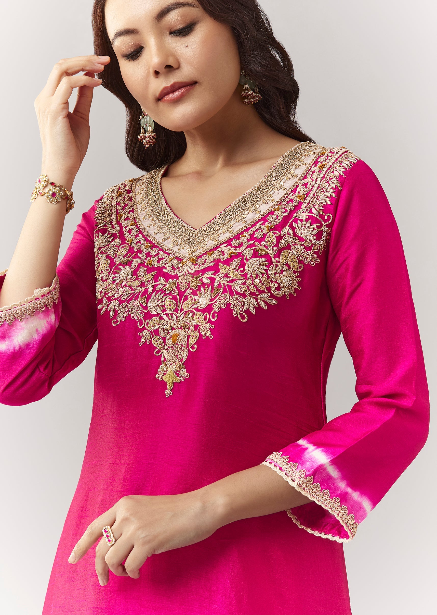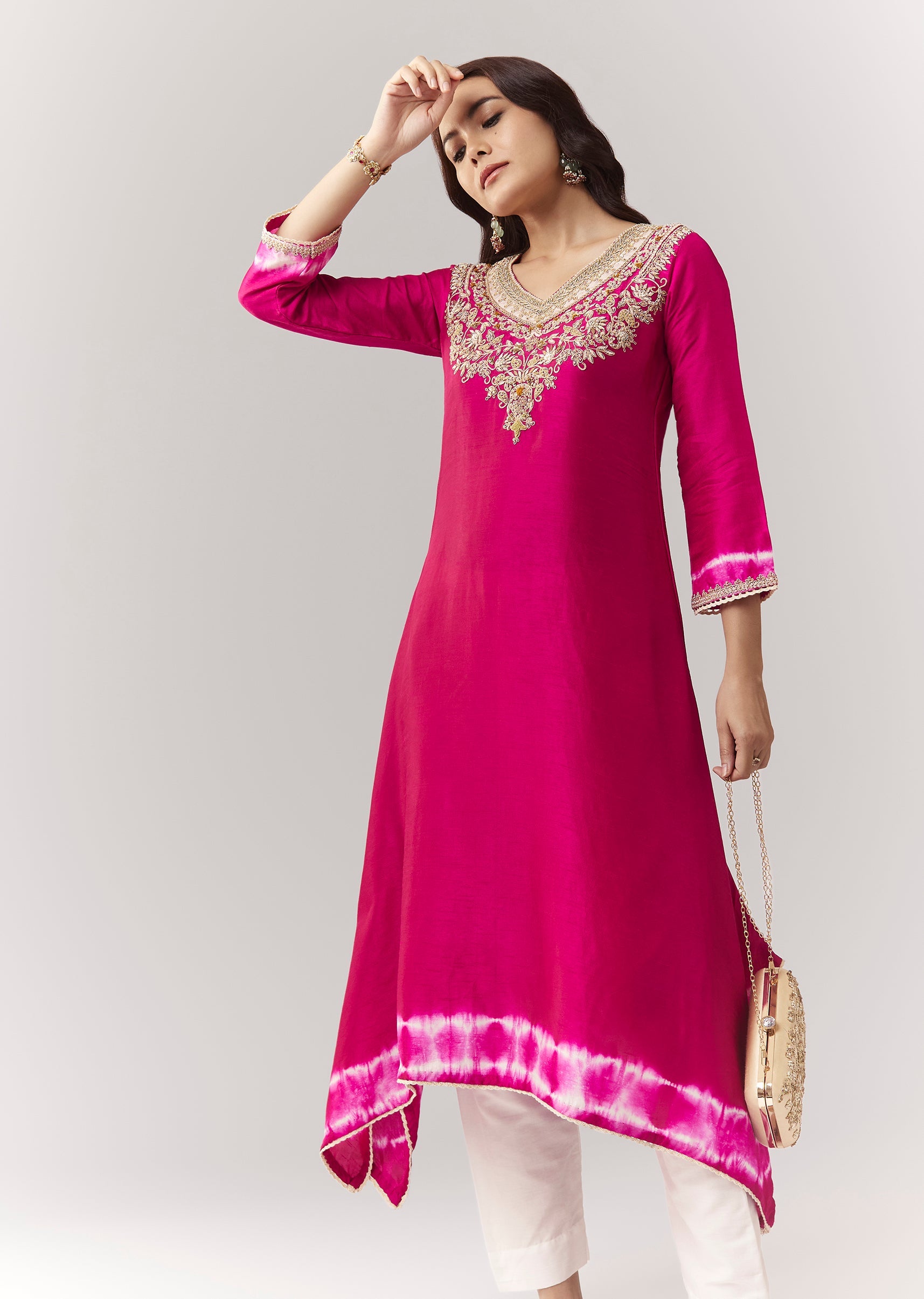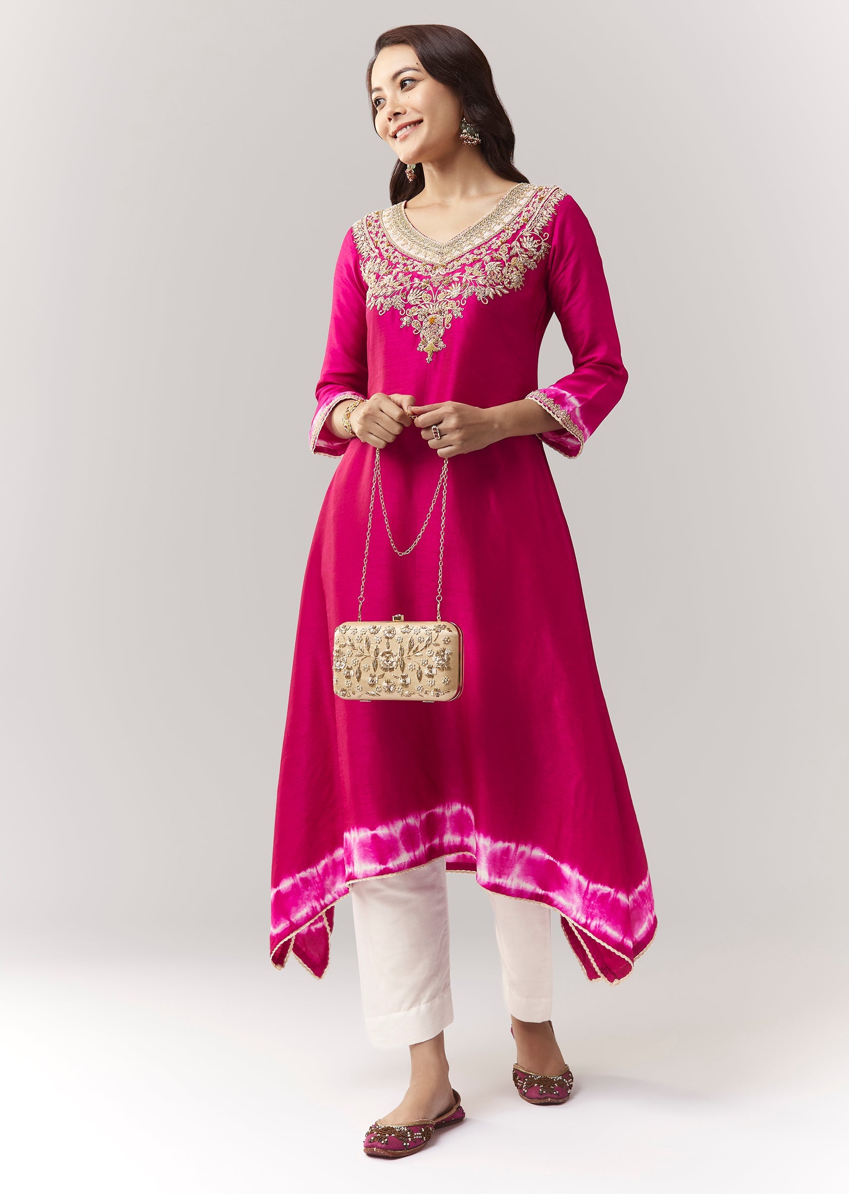 A vibrant pink asymmetric kurta with zardosi accents and leheriya border, paired with straight pants for a modern festive look. Awarded as the Most Trusted Brand, we're delivering styles you love, just as promised.