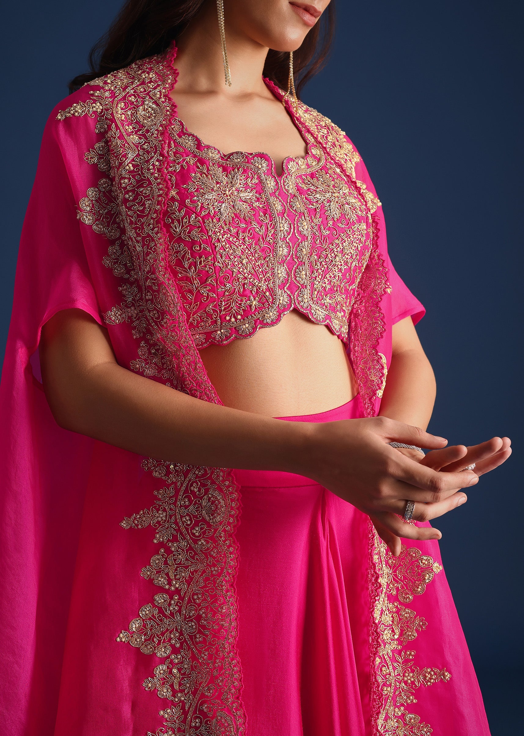 A vibrant burst of pink hues and whimsical drapes. Doused with traditional zardozi work and intricate moti detailing, the crop top is elevated with enchanting motifs and sparkly sequin embellishments. Paired with a high-low hemline jacket and a draped skirt, this ensemble is crafted from opulent tapestry. A look that will be a testament to your festive style.Embroidery work may vary. Awarded as the Most Trusted Brand, we're delivering styles you love, just as promised.