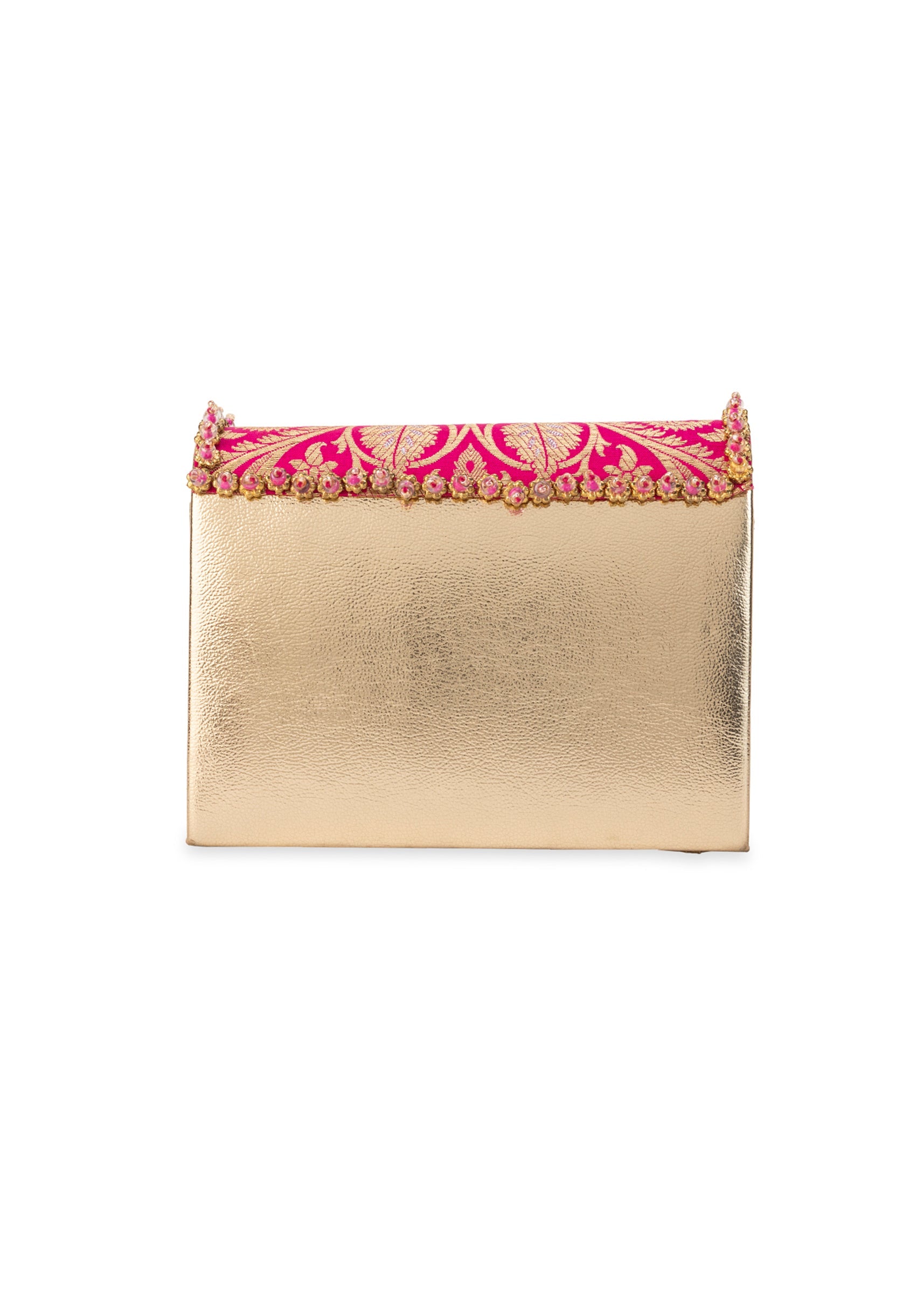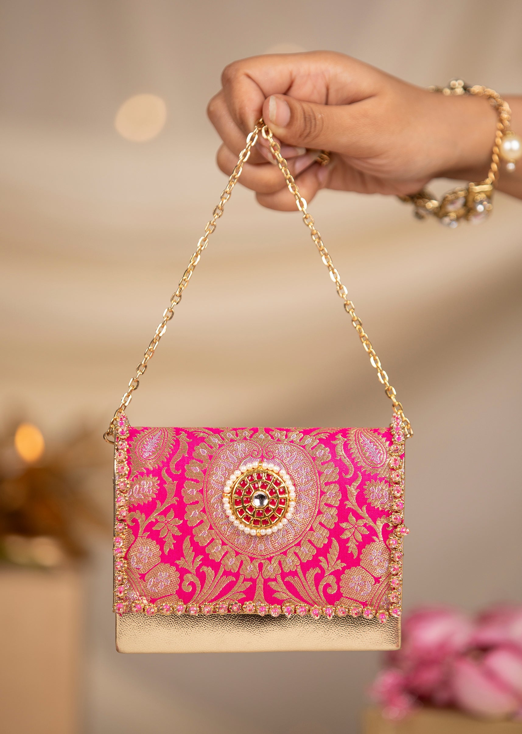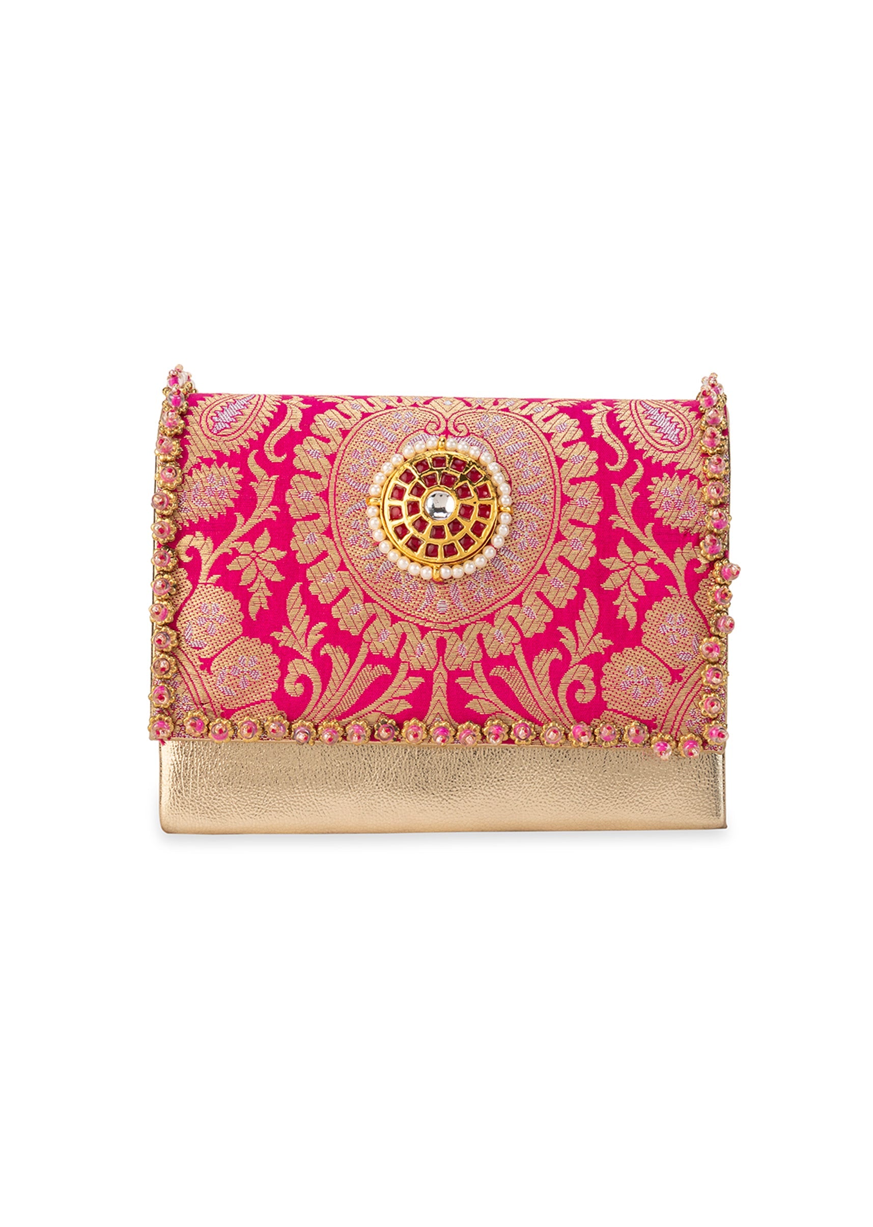 Pink Zari and Kundan Brocade Rectangular Flap Bag