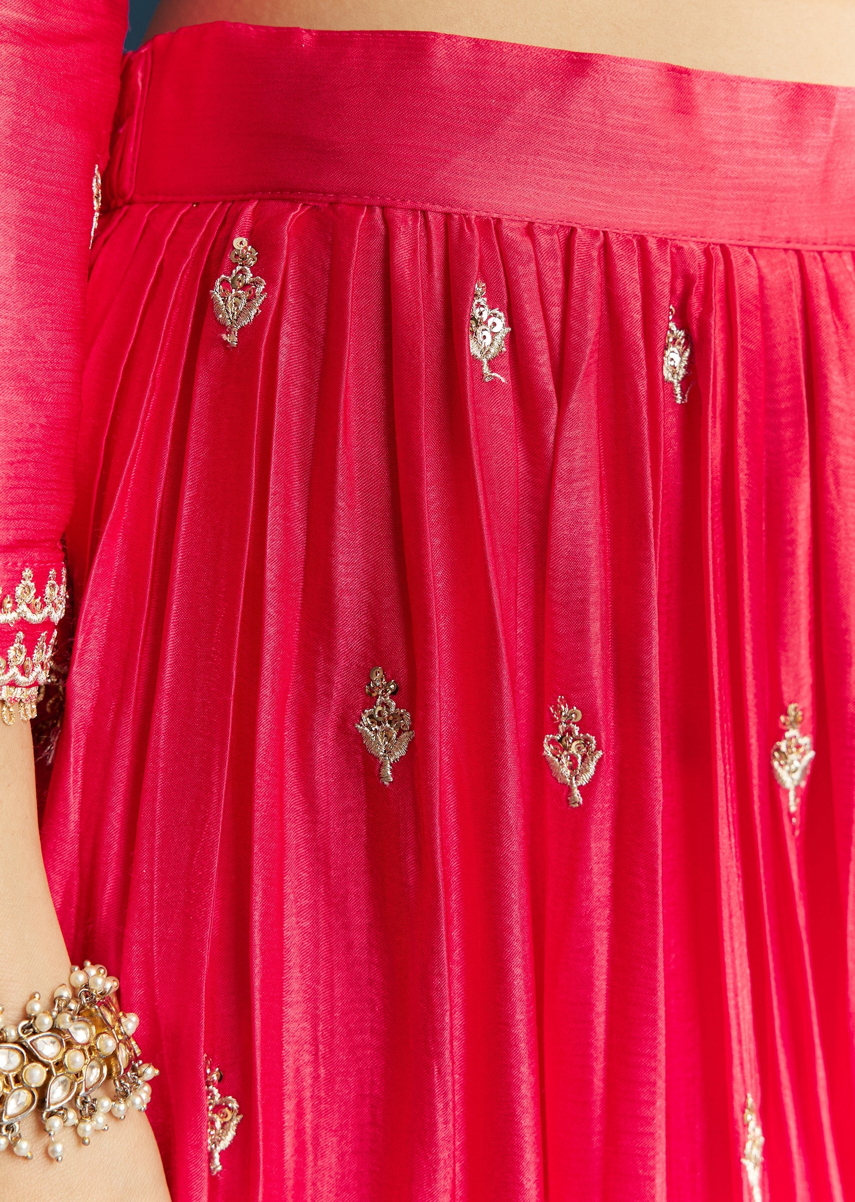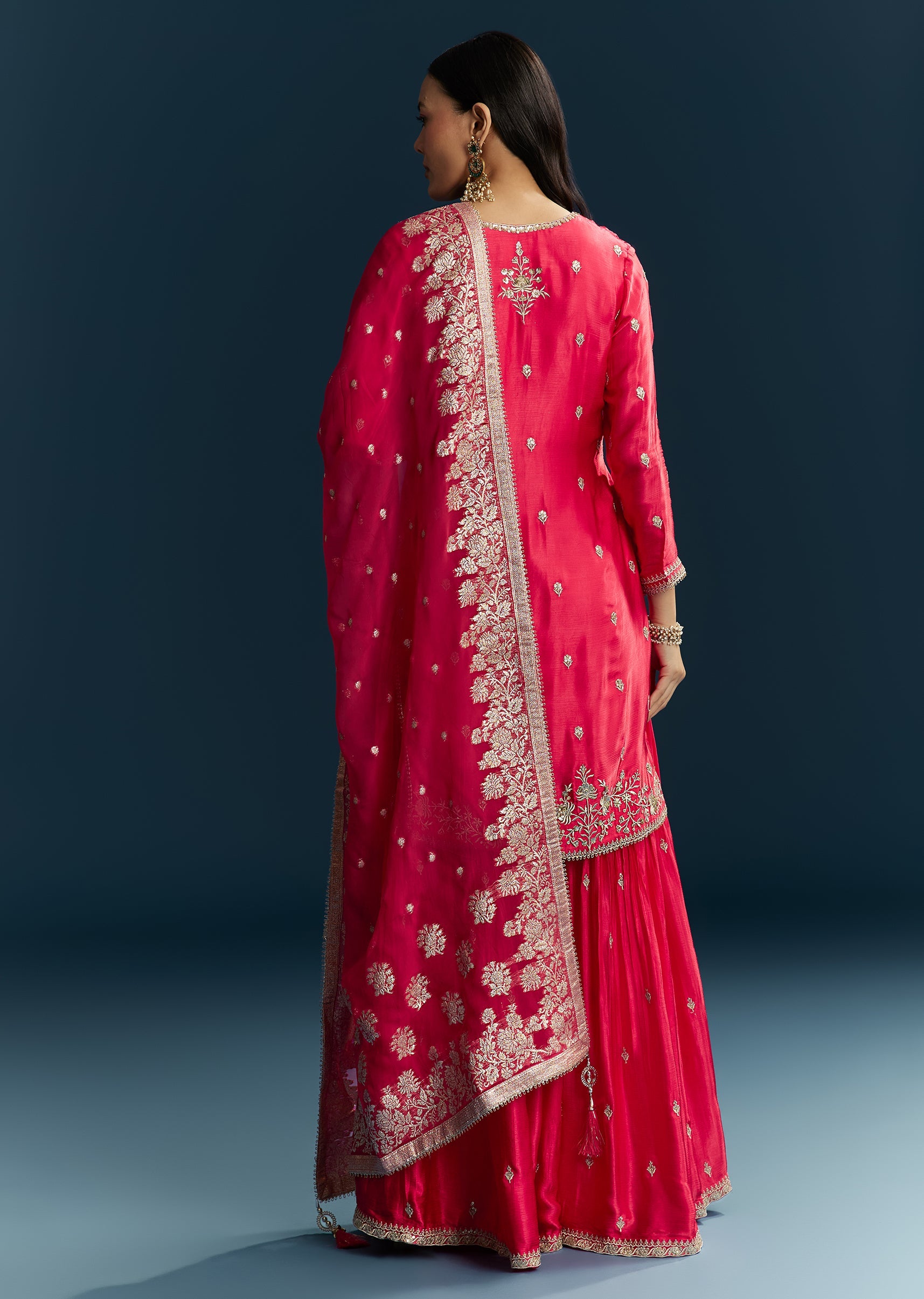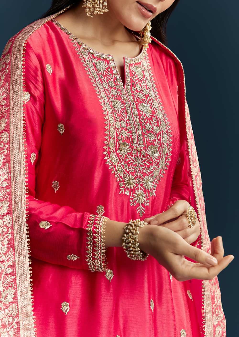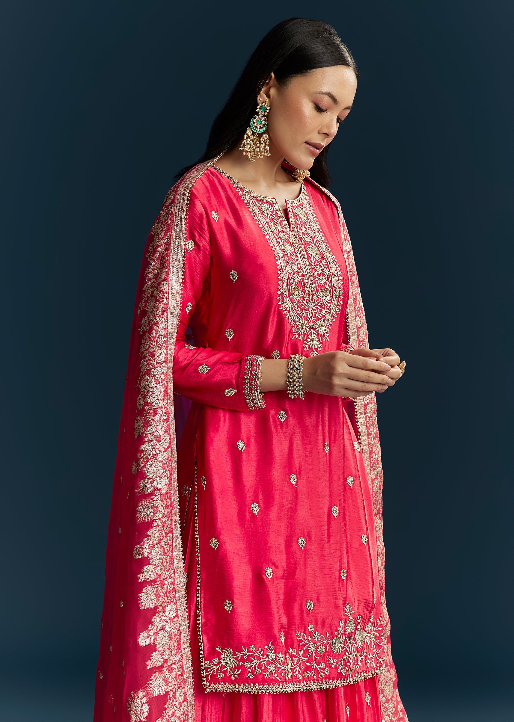 This radiant pink palazzo set features intricate zari work on a flowing satin kurta, matched with palazzos and a graceful dupatta. The rich hue and delicate detailing are perfect for... More Product Details