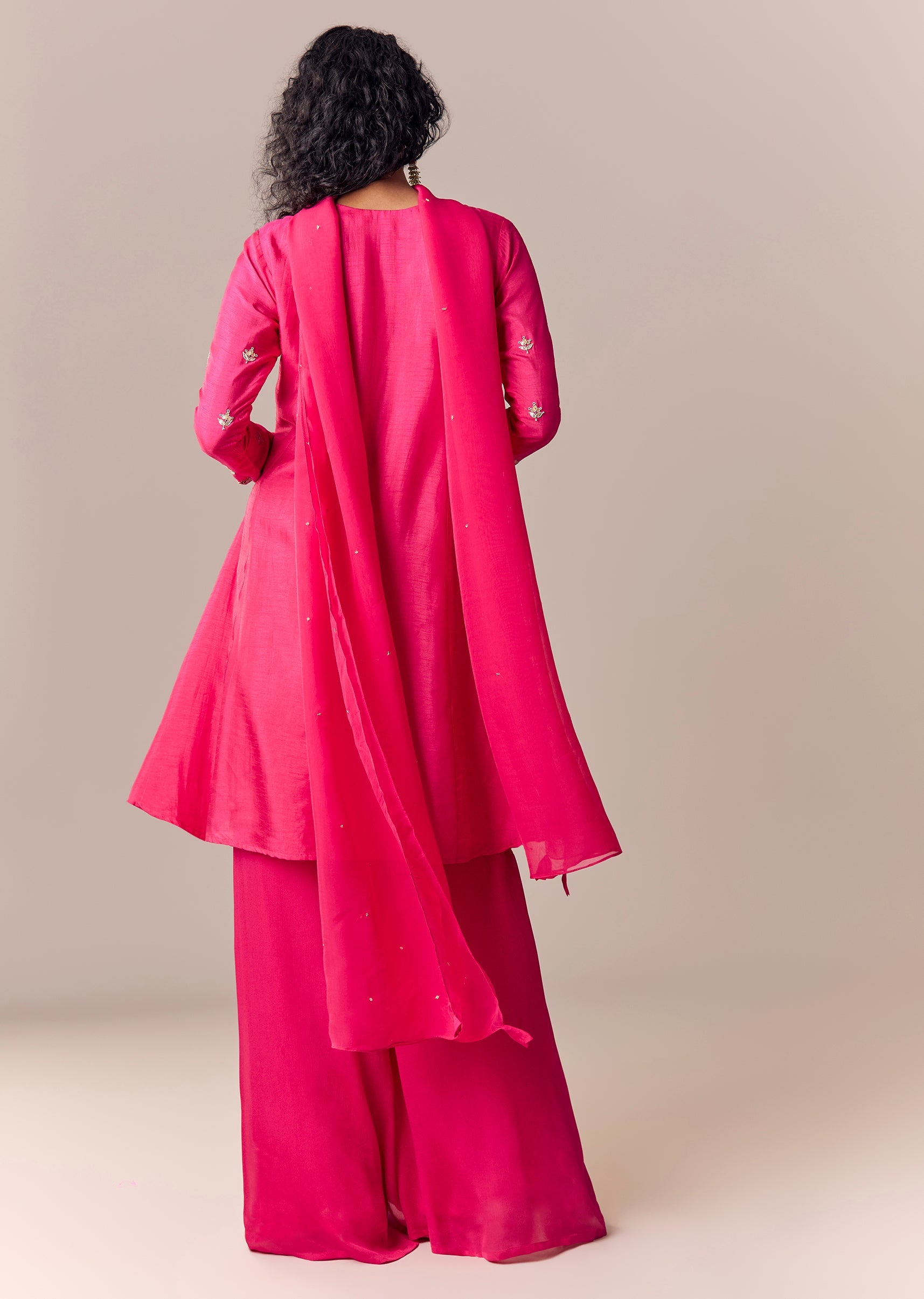 A minimal festive Anarkali set featuring zari thread embroidery on a silk-chinon base. Designed with full sleeves and round neckline; paired with palazzo pants (partially elasticated waist) and dupatta—great for... More Product Details