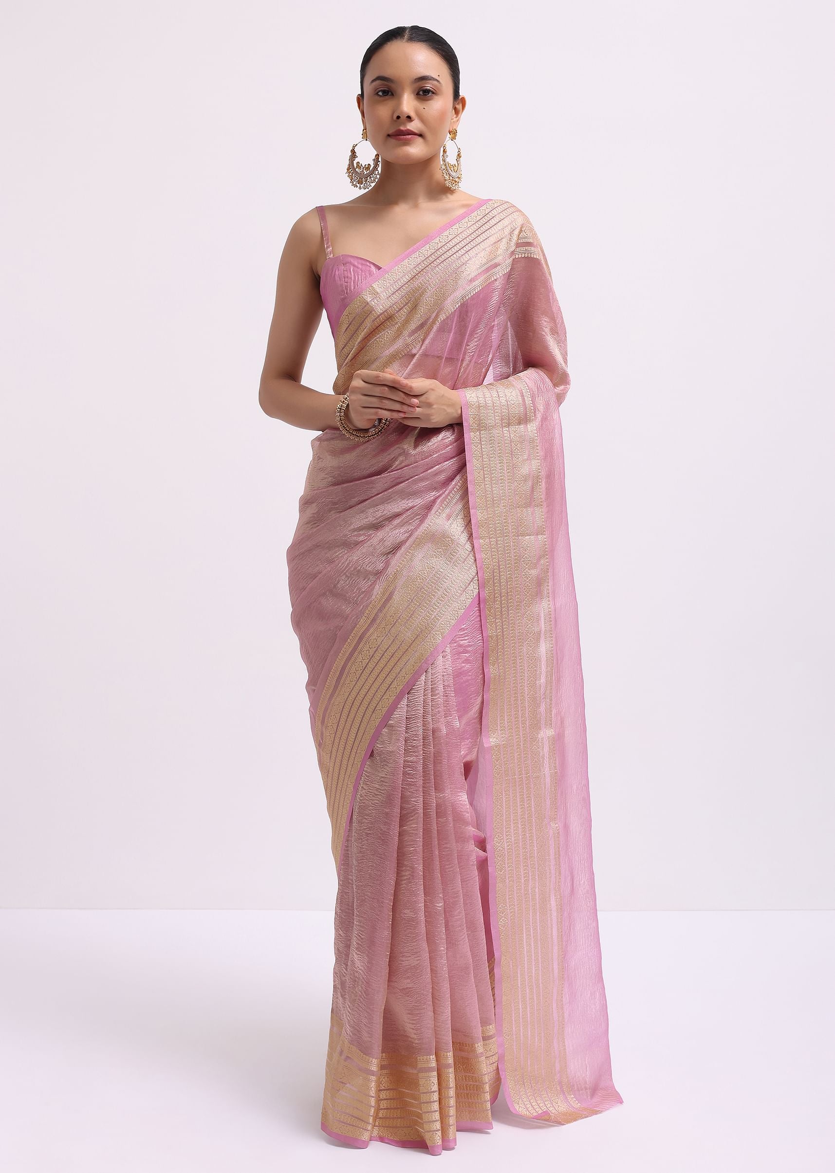 Pink Zari Woven Chanderi Saree With Unstitched Blouse
