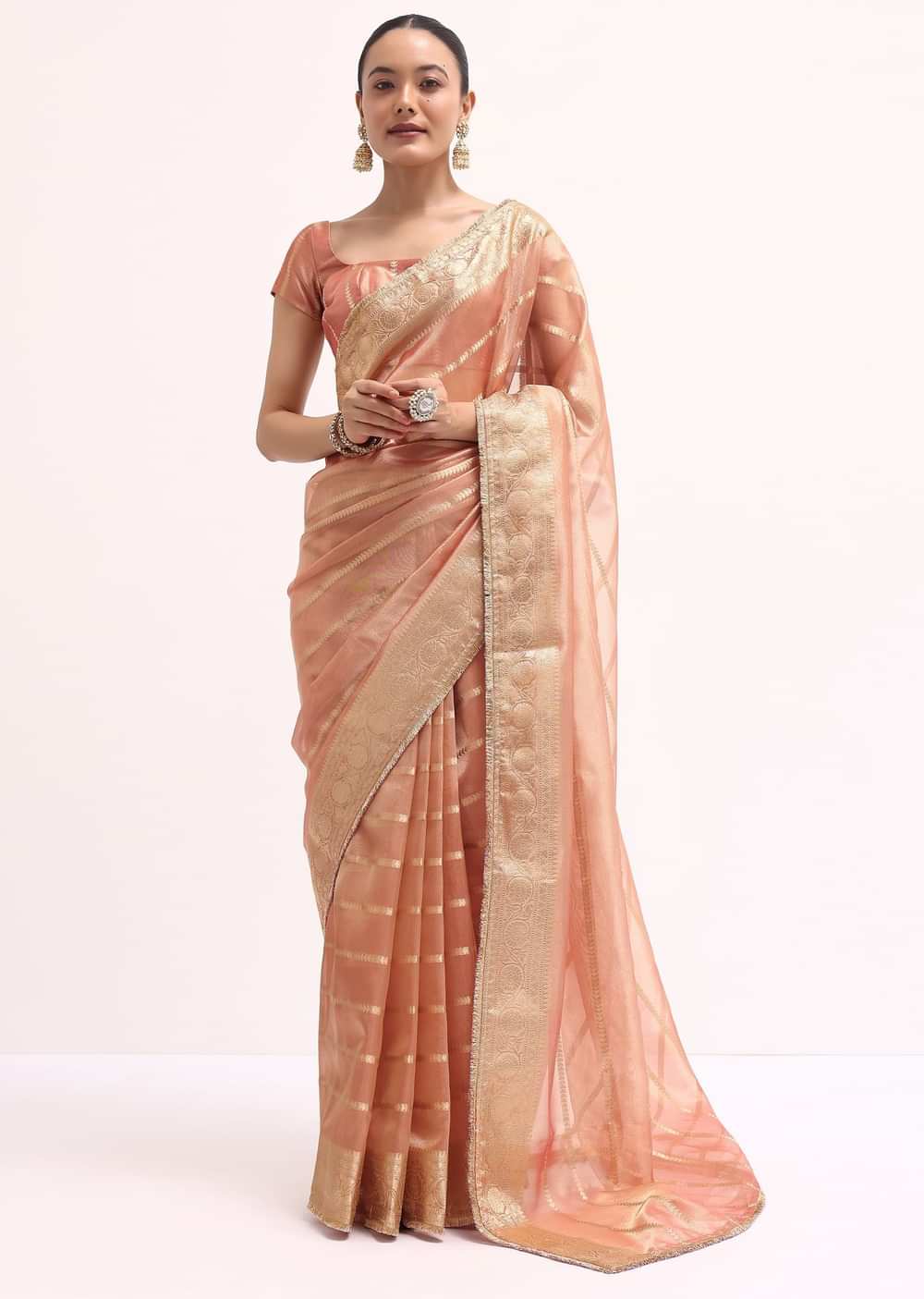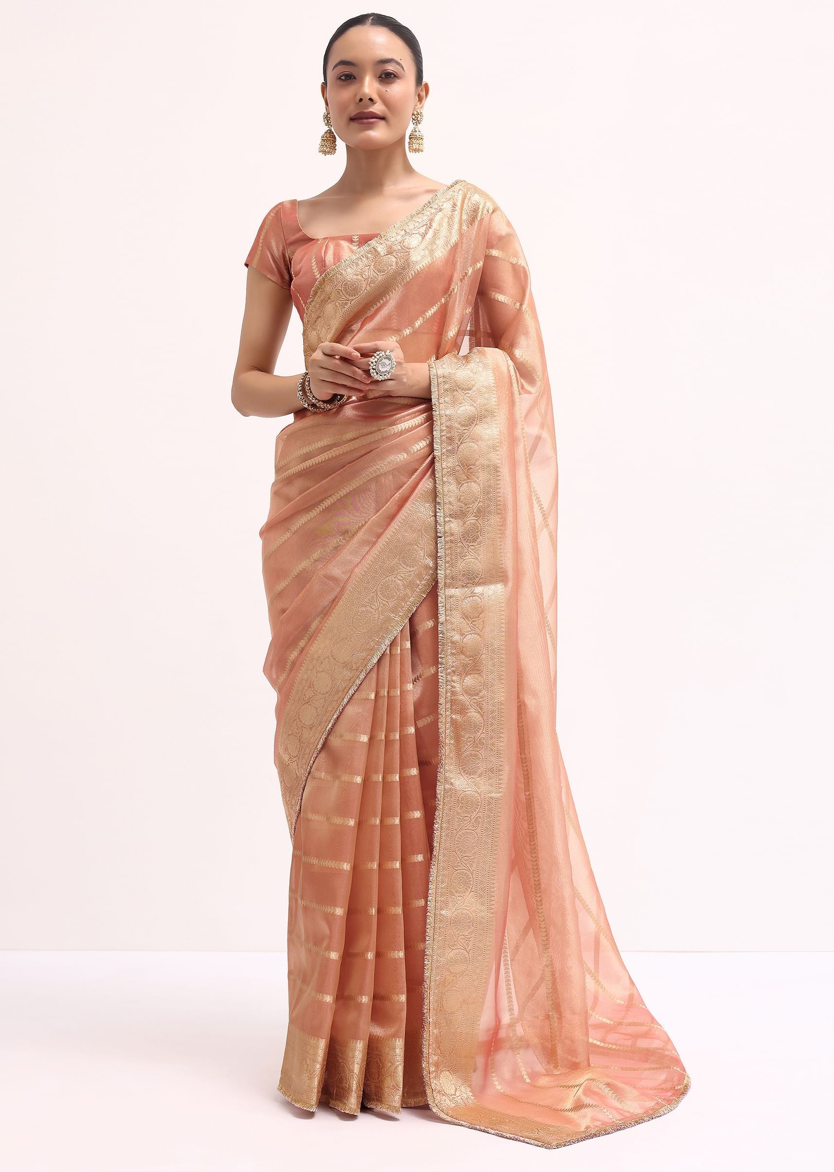 Discover the allure of our pinkish gold saree designed for weddings and festive events. This saree crafted from premium chanderi silk is adorned with a beautiful zari woven border pallu and elegant zari frills. It includes an unstitched blouse for a tailored fit. Awarded as the Most Trusted Brand, we're delivering styles you love, just as promised.