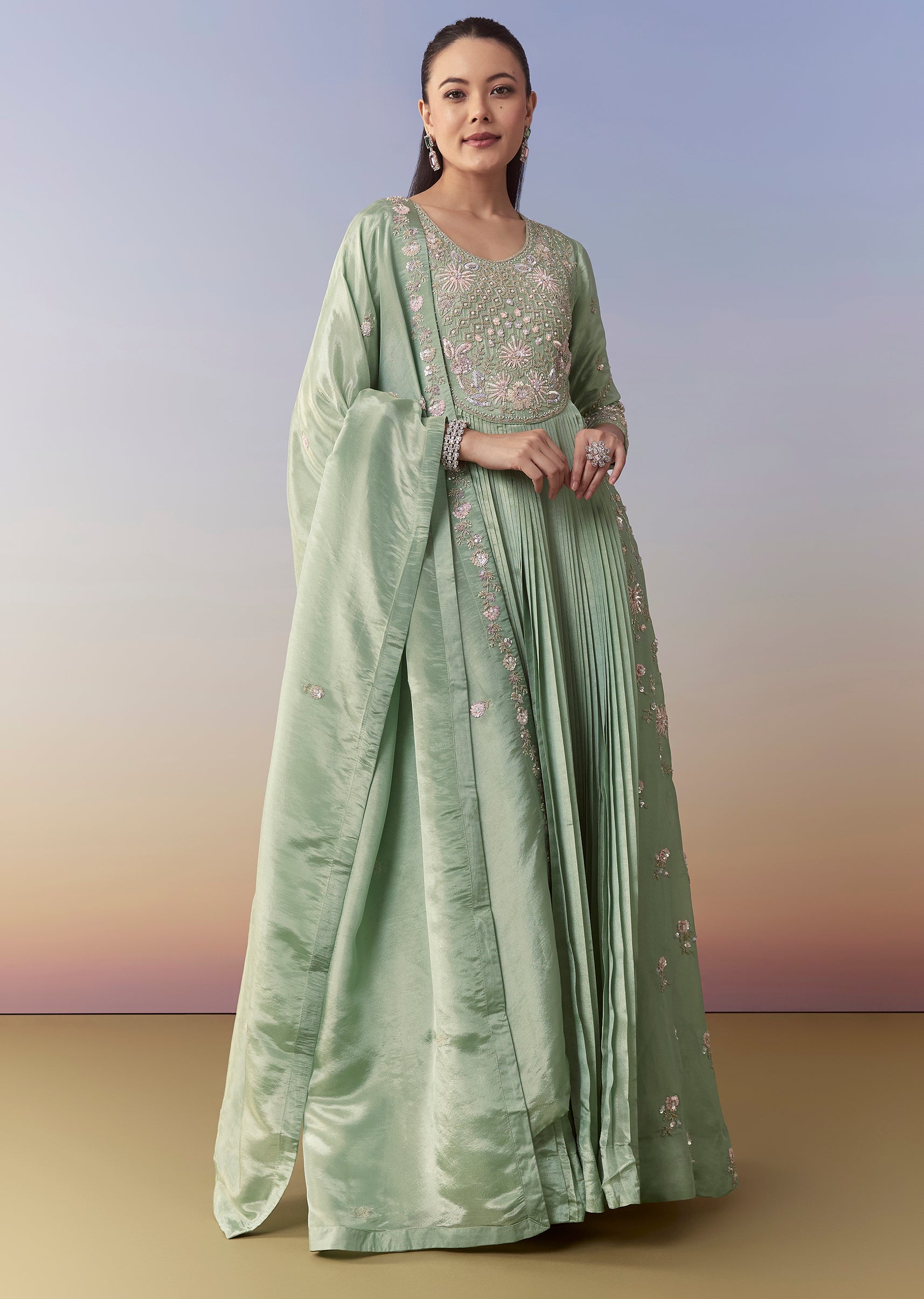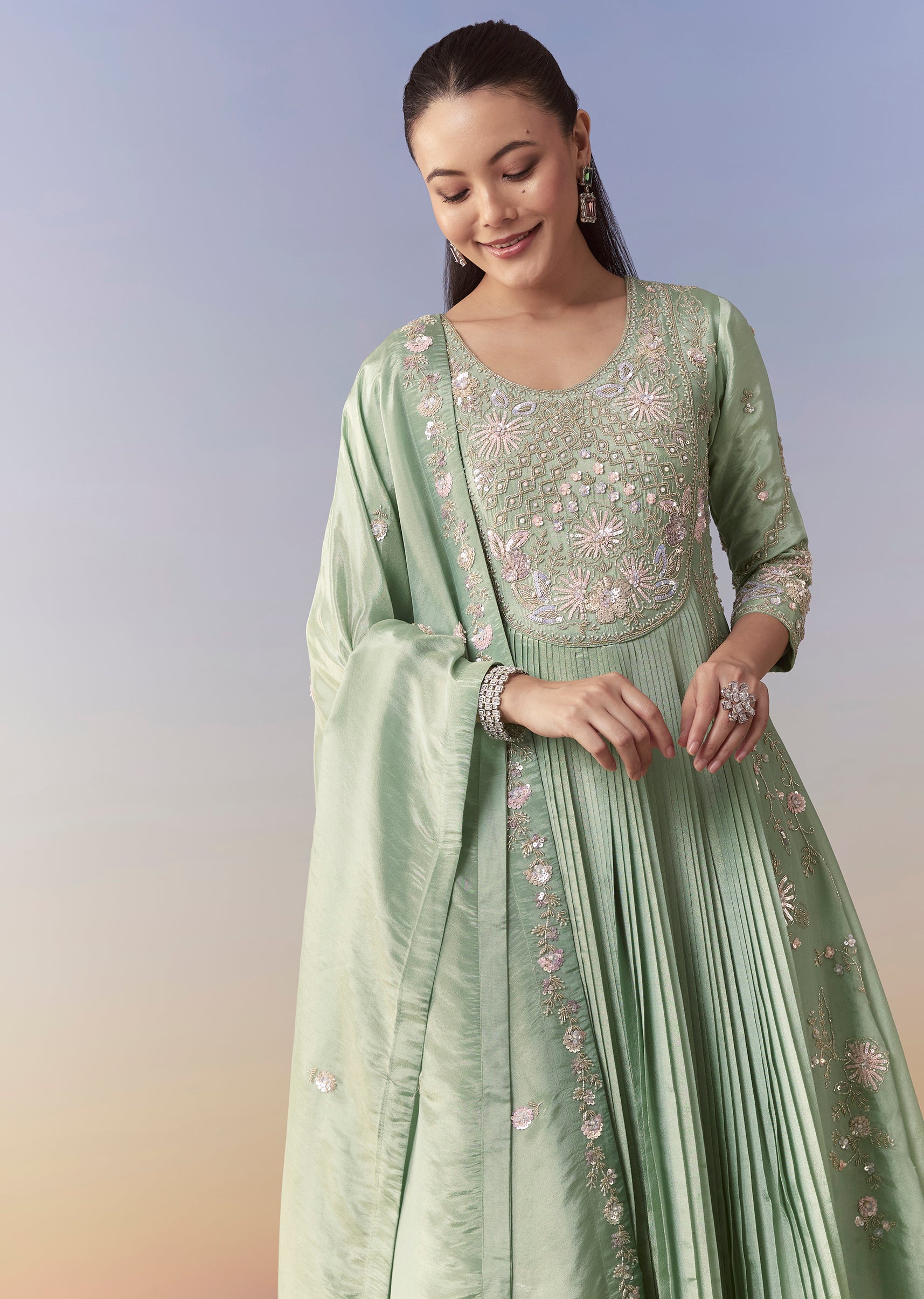 Step into understated elegance with this pista green anarkali set, adorned with sequins, cutdana, and bead work that adds a refined festive sparkle. The front pleating detail enhances the silhouette... More Product Details