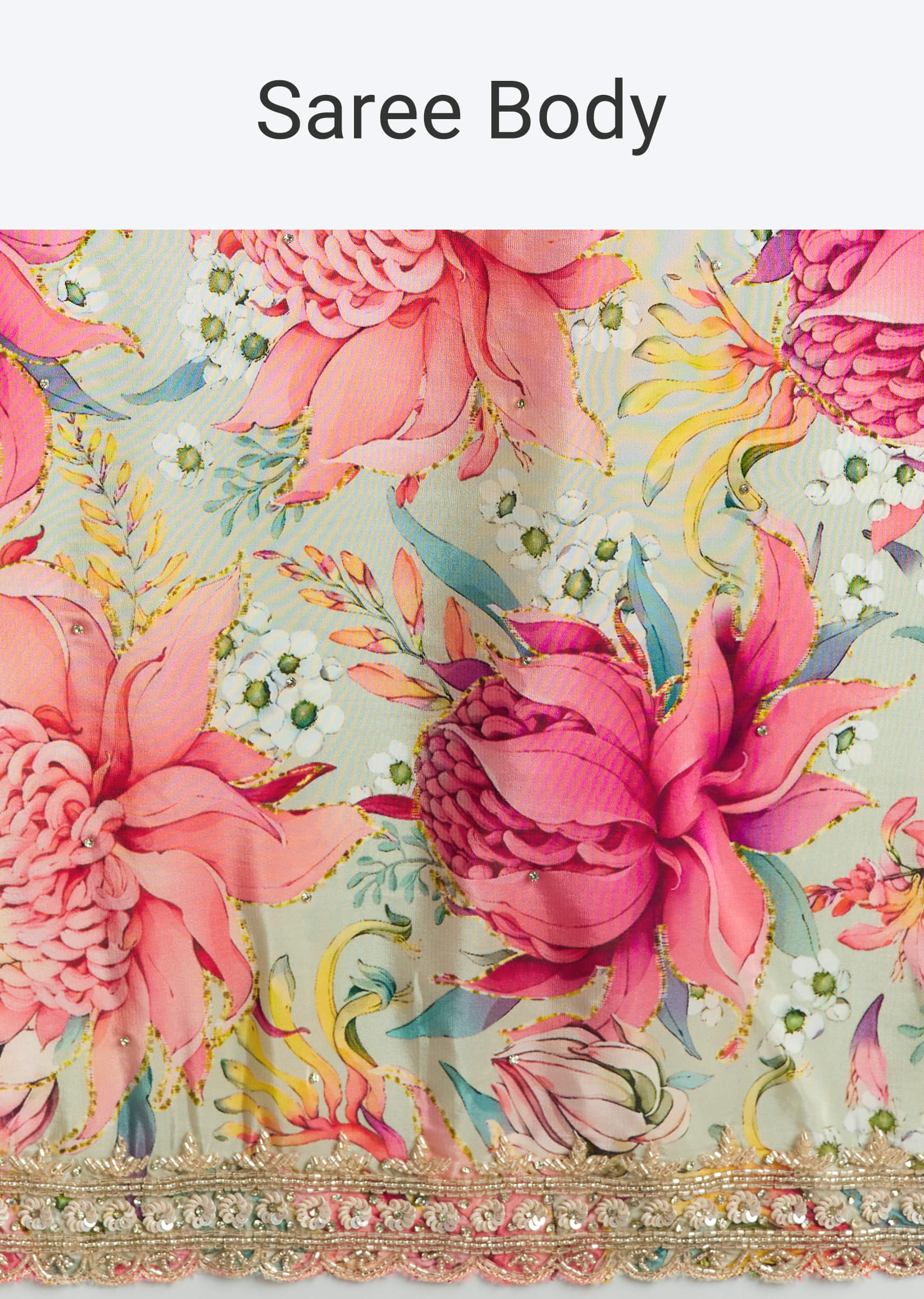 Pista Green Crepe Saree With Floral Print And Sequin Work