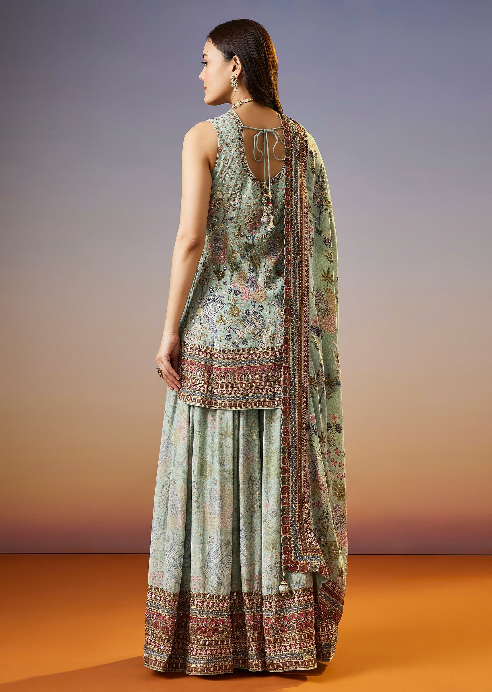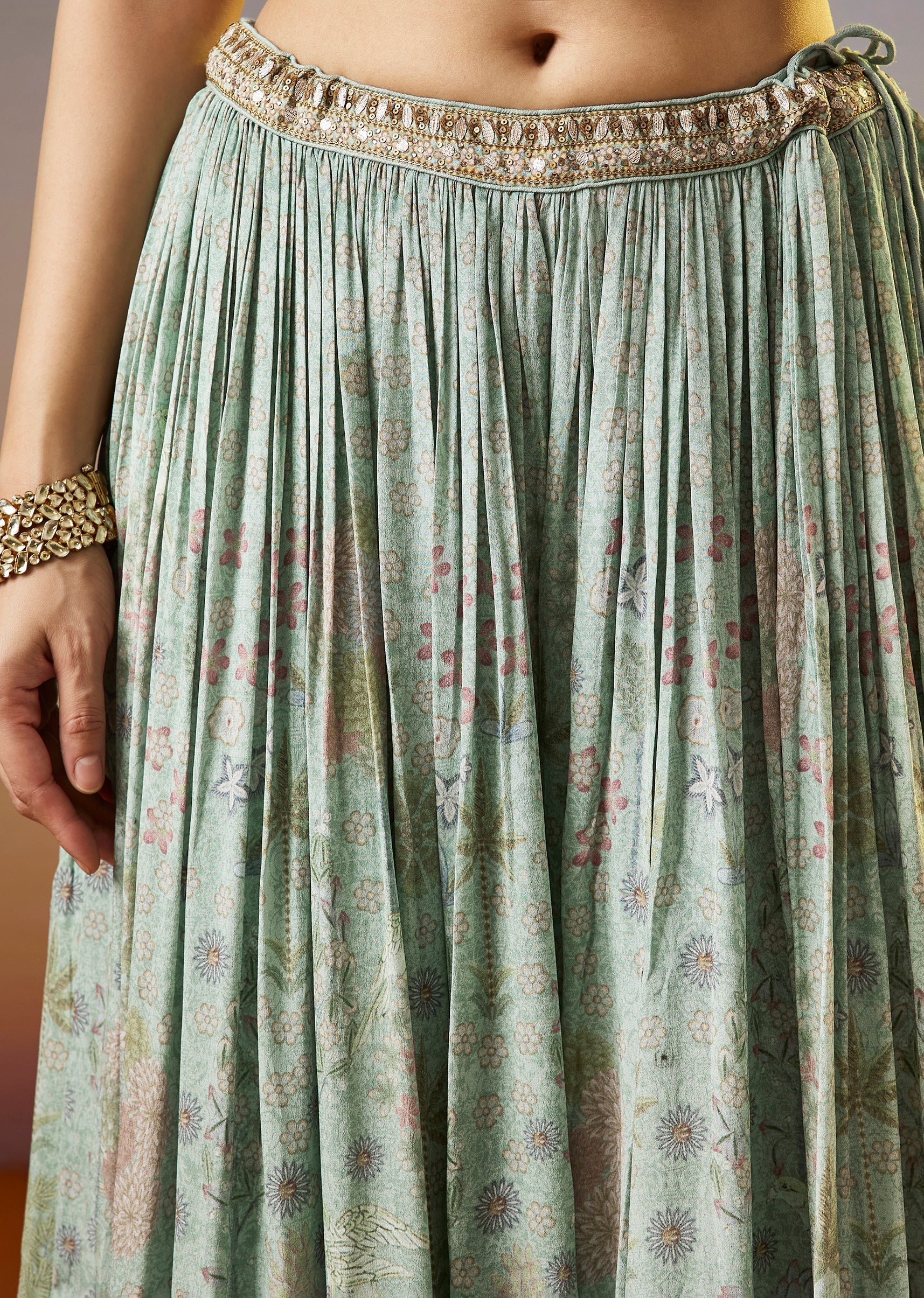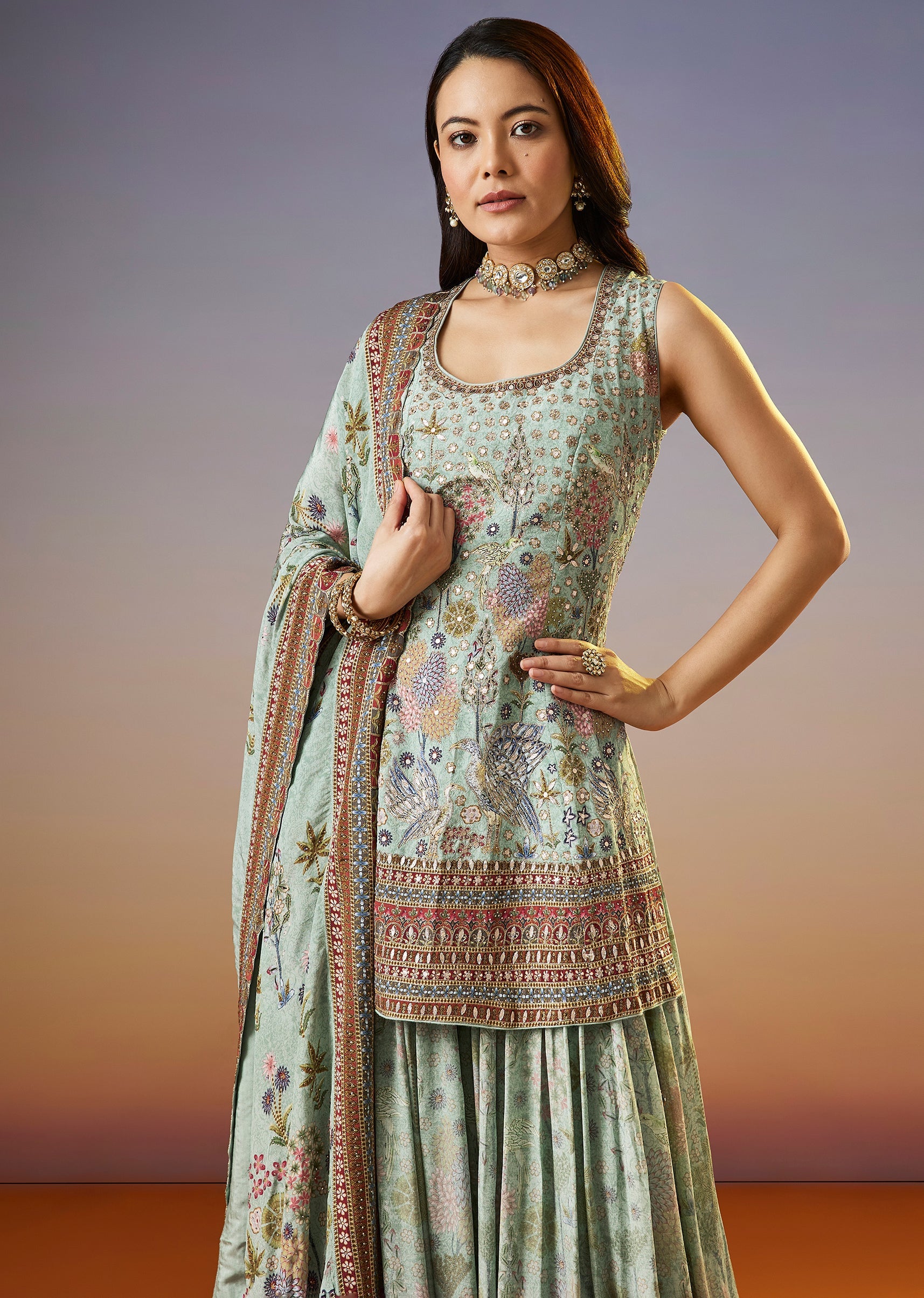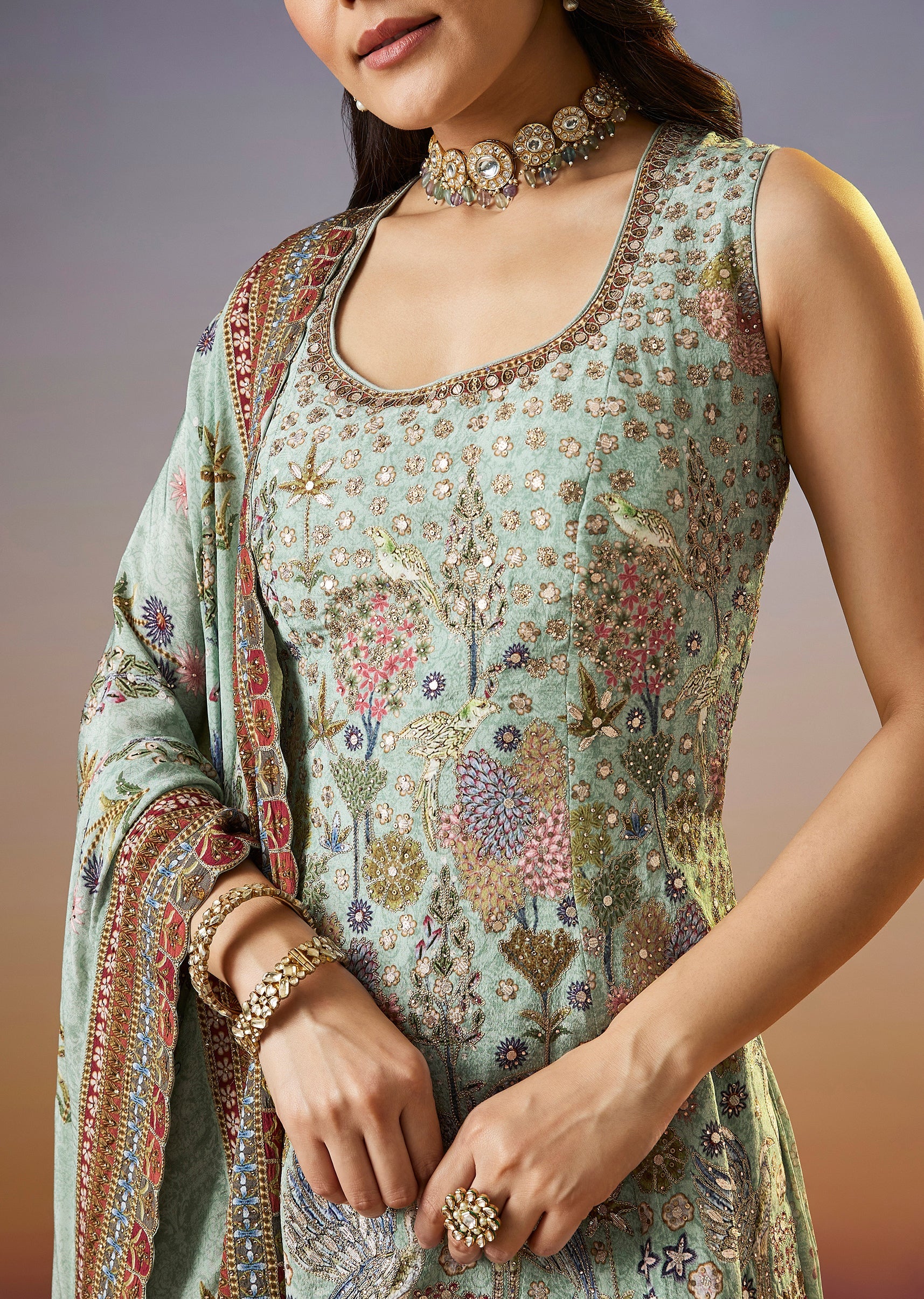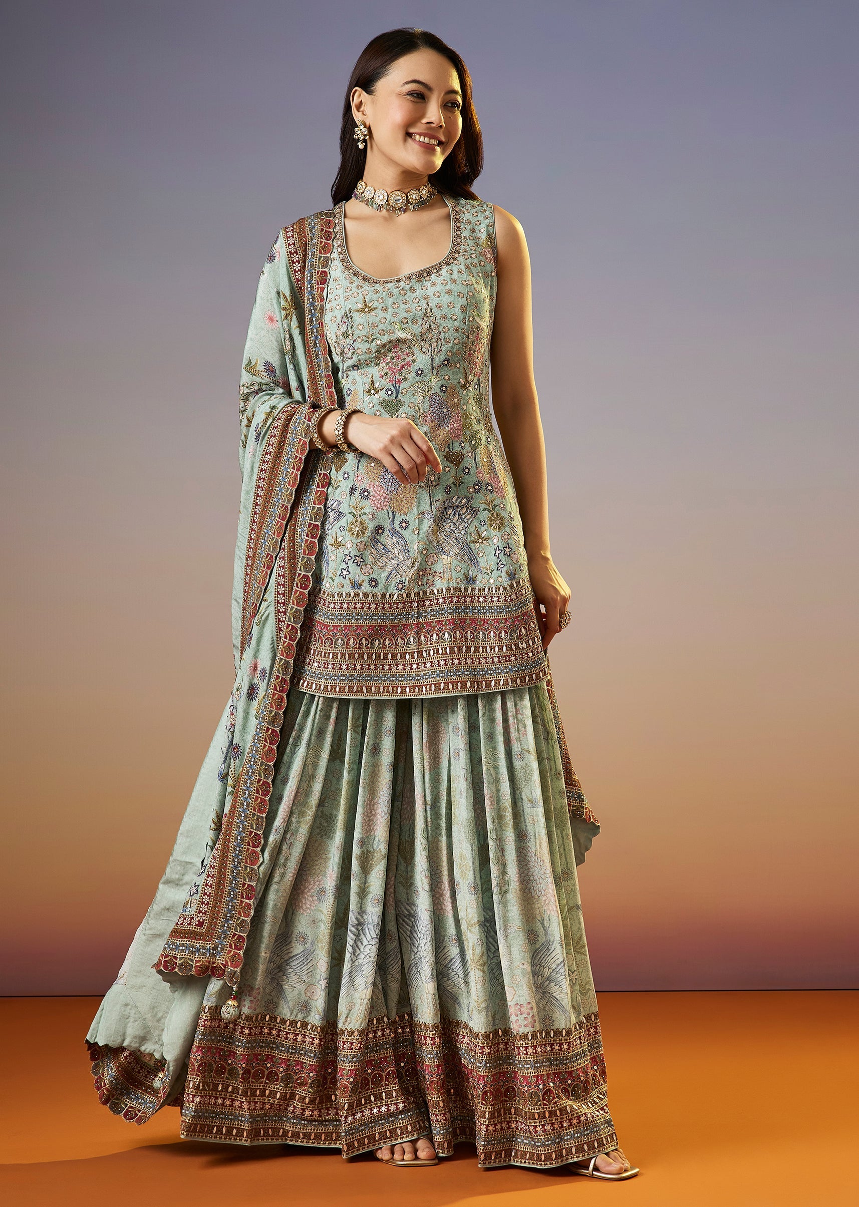 A fresh pista green palazzo suit featuring a floral printed kurta enhanced with zari and sequins work. Paired with a matching palazzo and dupatta, this festive set brings together soft... More Product Details