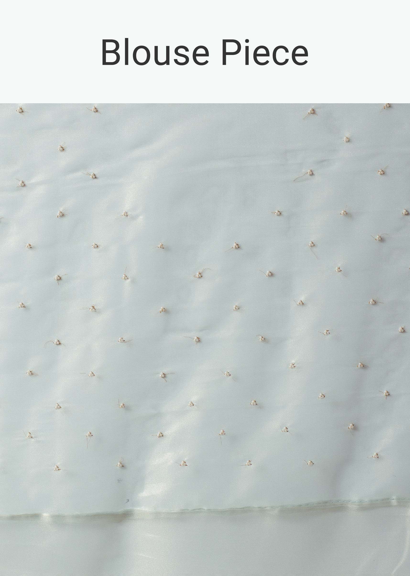 Indulge in the epitome of luxury with our exquisite pista green saree. Crafted in opulent tissue fabric, the saree features a captivating foil print all over, lending a mesmerizing shimmer to your every movement. The intricate pearl and bead embroidery border work adds a touch of regal charm, enhancing the overall allure of the saree. The saree comes with an unstitched blouse with a similar embroidery buttis. NOTE - The blouse worn by the model is for styling purpose only. EVENT - Perfect for festive celebrations. Awarded as the Most Trusted Brand, we're delivering styles you love, just as promised.
