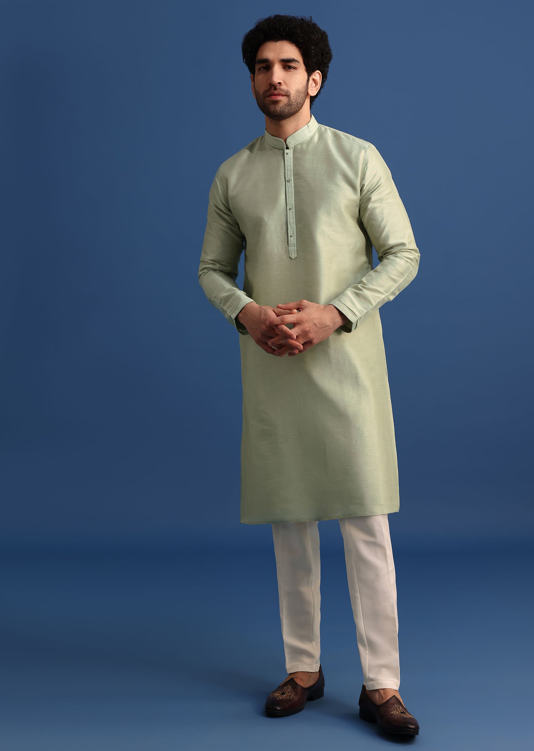 Make a distinguished statement in this Pista Green Raw Silk Kurta Jacket Set. The kurta adorned with delicate Resham embroidery brings a refined touch to the rich raw silk fabric. The jacket adds an extra layer of sophistication enhancing the set’s overall elegance. Ideal for festive events and special occasions. This jacket is paired with a kurta and pants. Awarded as the Most Trusted Brand, we're delivering styles you love, just as promised.