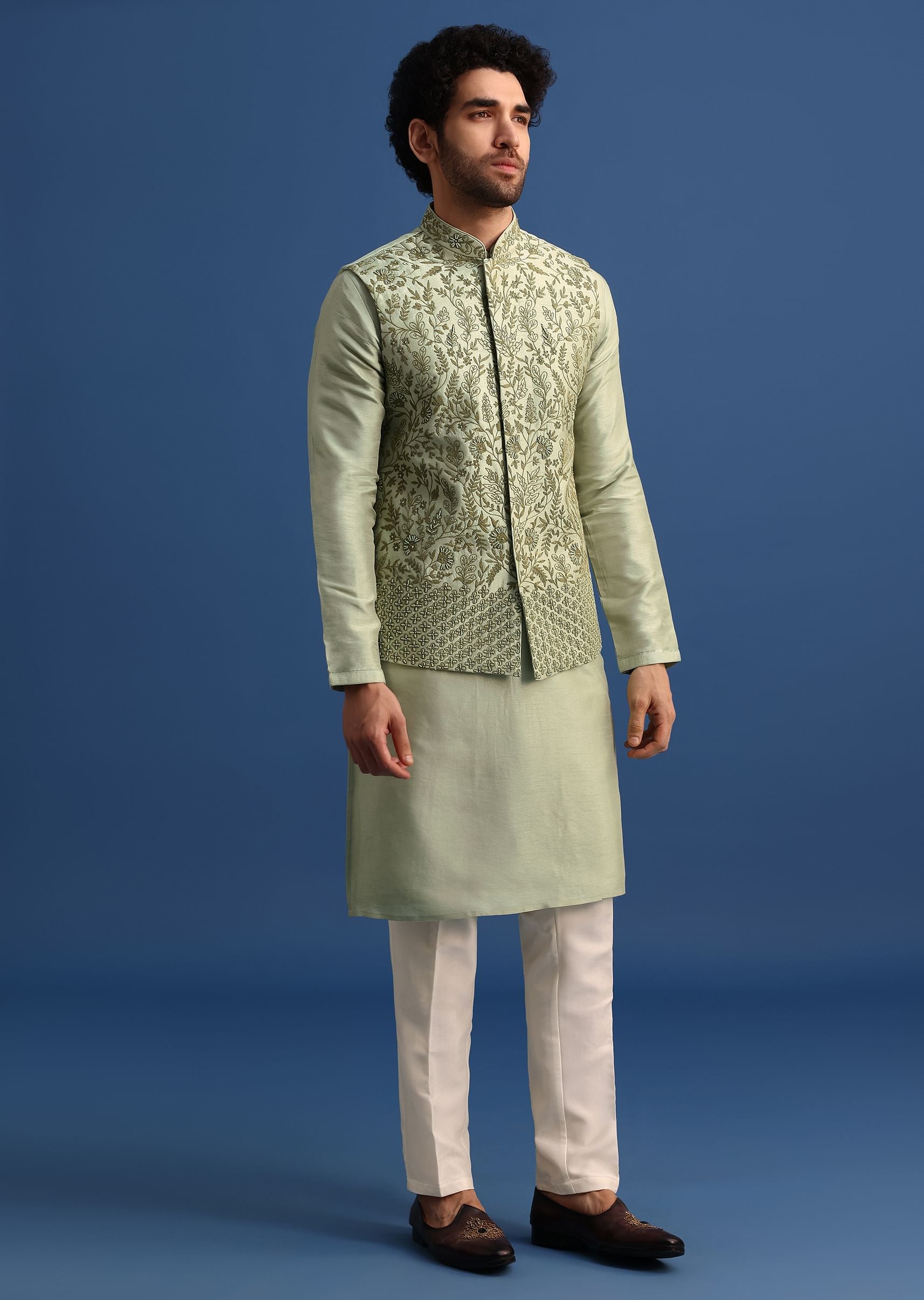 Pair the kurta jacket set with traditional footwear like mojaris or juttis.