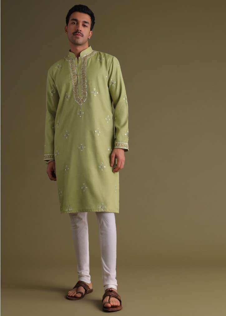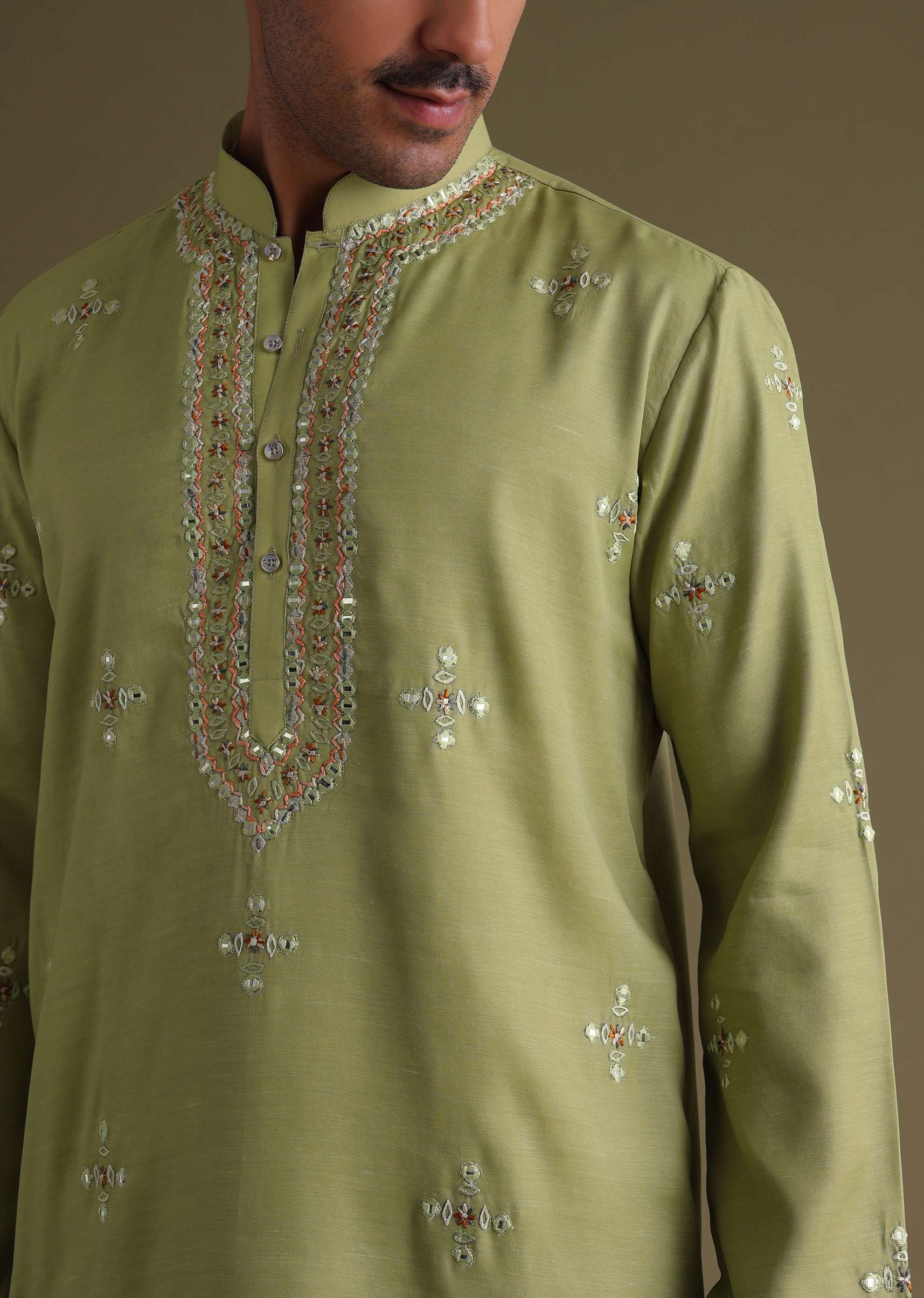 Pista Green Kurta Set In Silk With Mirror Embroidery