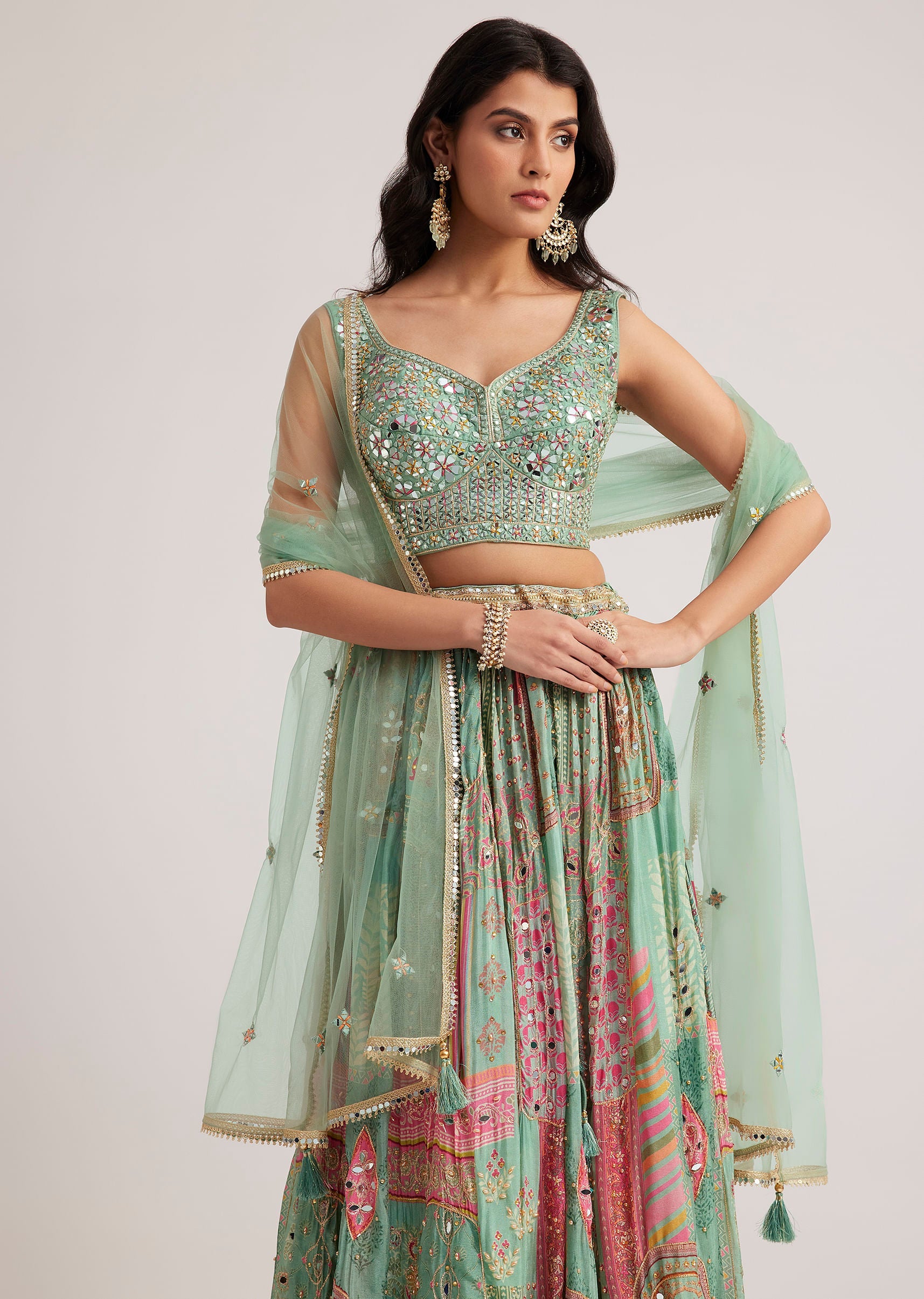 Pista Green Mirror And Zari Embroidered Lehenga Set
