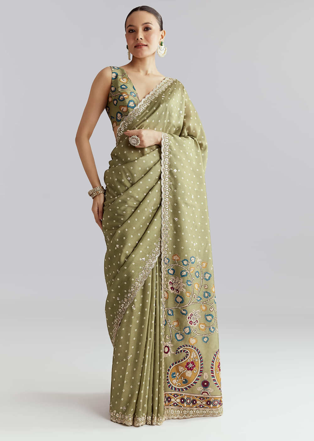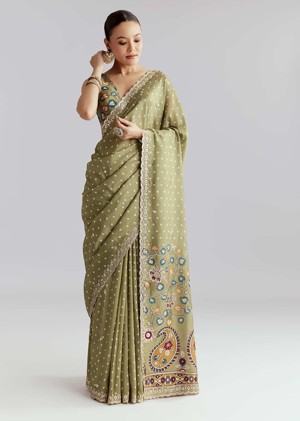 Soft to the touch and easy to drape, this pista green muslin embroidered saree pairs a gentle print with a scalloped edge for a feminine profile. Mirror, gota, zari and sequins build a hand worked sparkle that stays comfortable. You feel delicate, festive and ready for festive celebrations. Awarded as the Most Trusted Brand, we're delivering styles you love, just as promised.