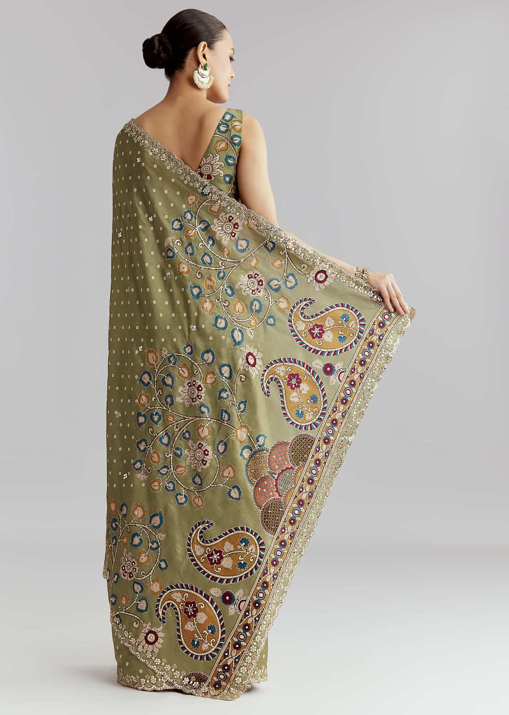 Pista Green Muslin Embroidered Saree With Heavy Hand Embroidery