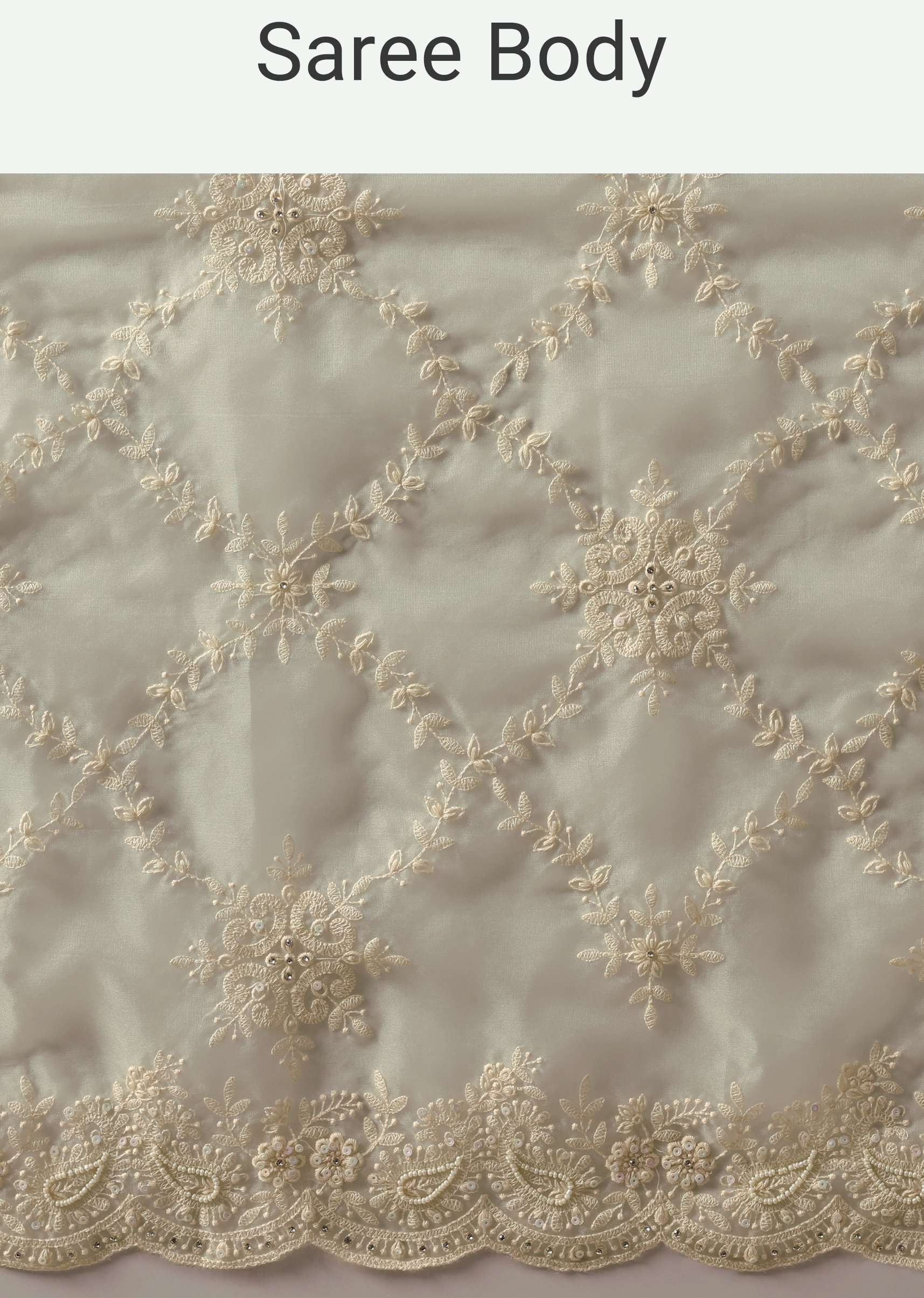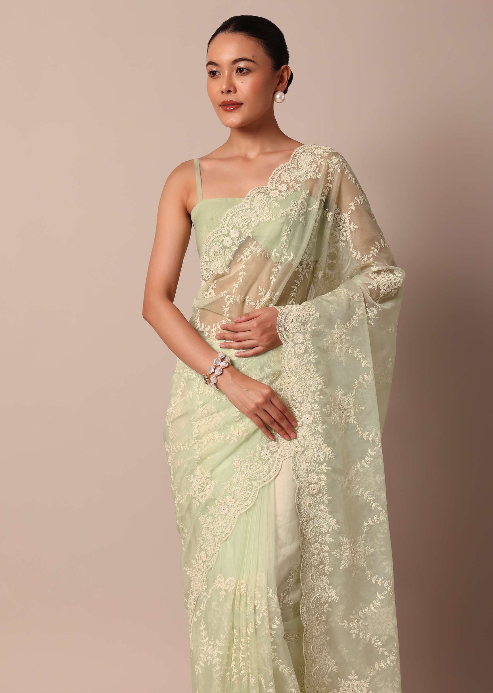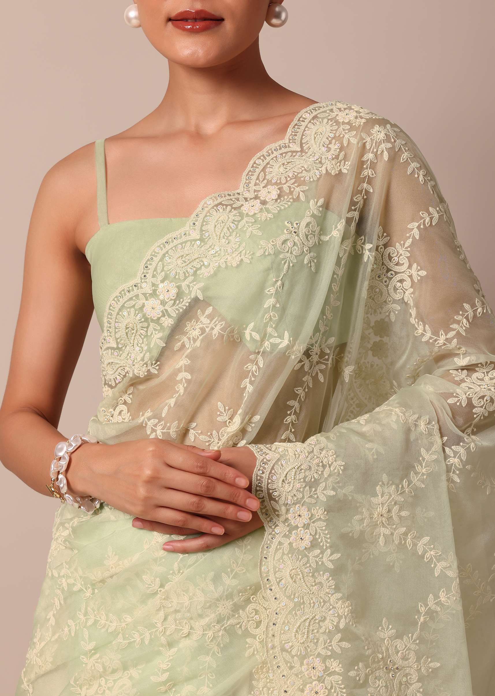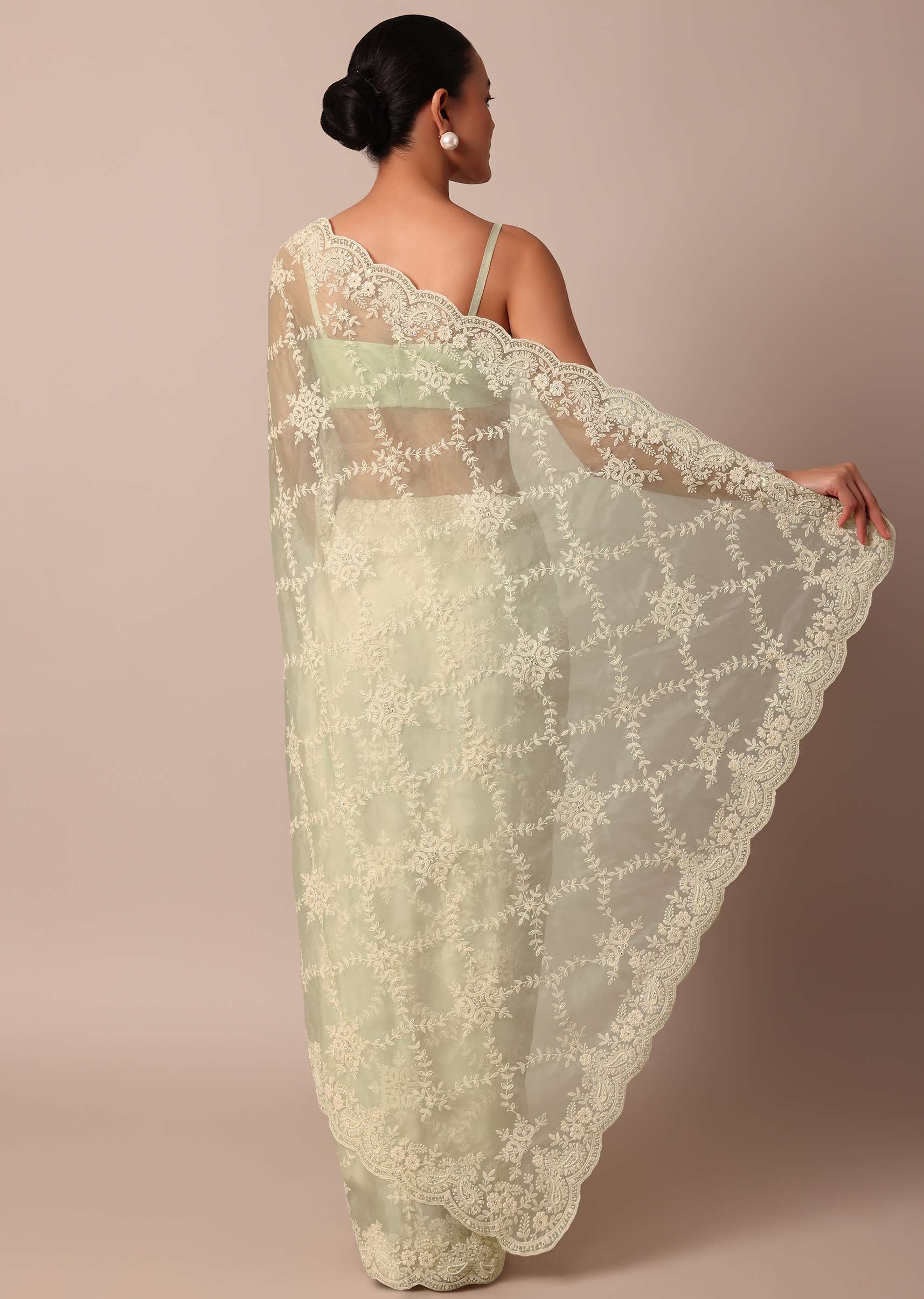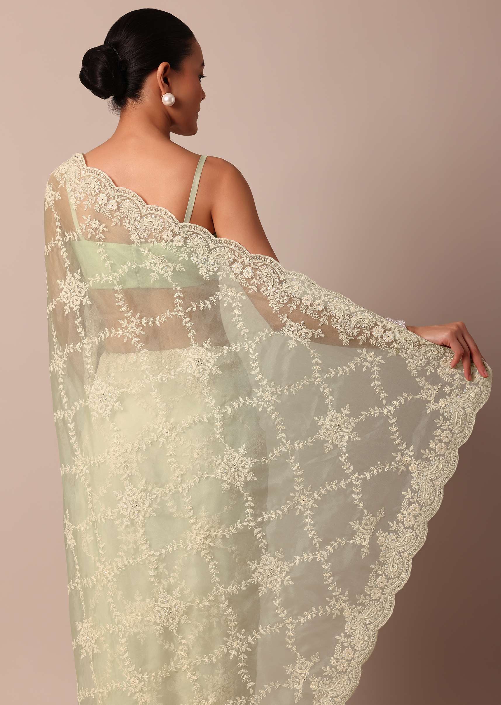 Pista Green Organza Silk Chikankari Saree With Floral Thread Jaal Work And Unstitched Blouse Fabric
