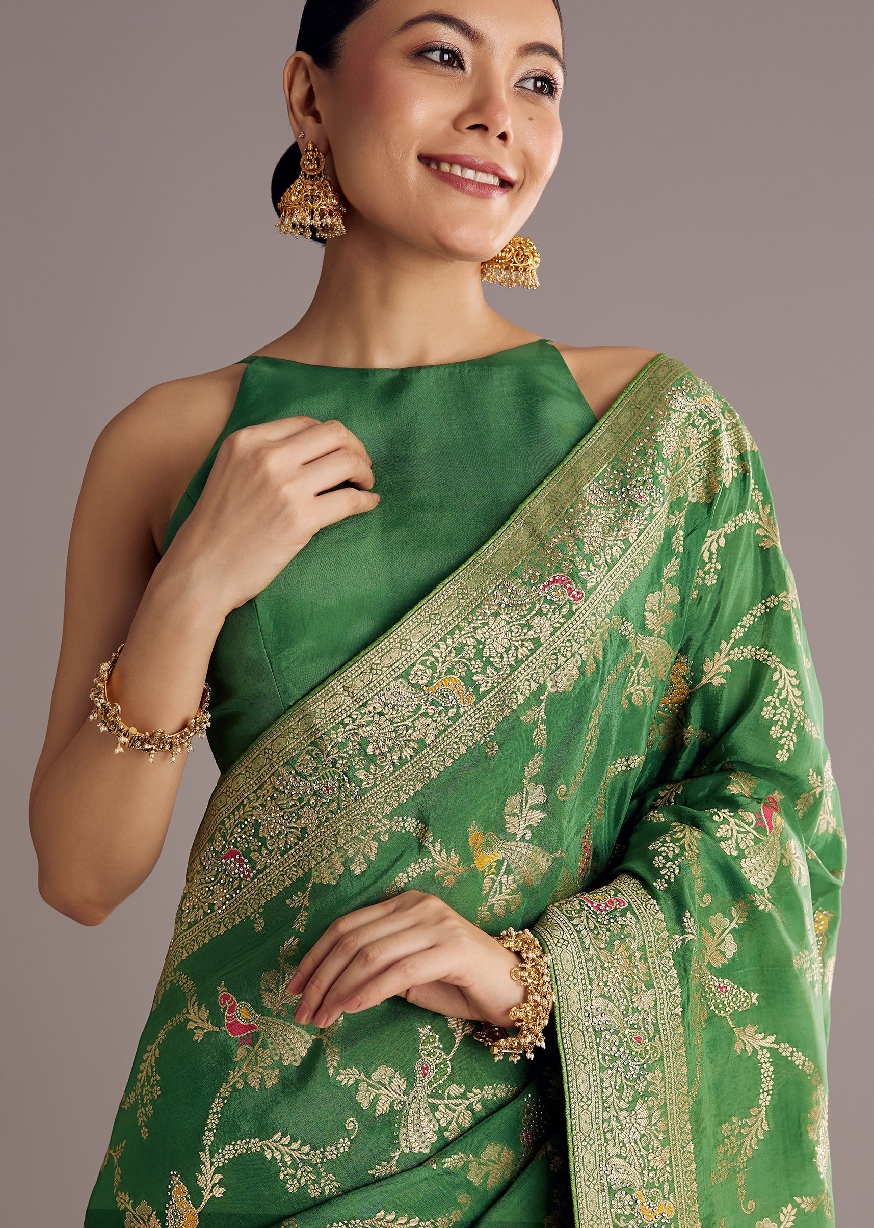 Pista Green Saree With Zari Jaal Weave And Stone Embellishments