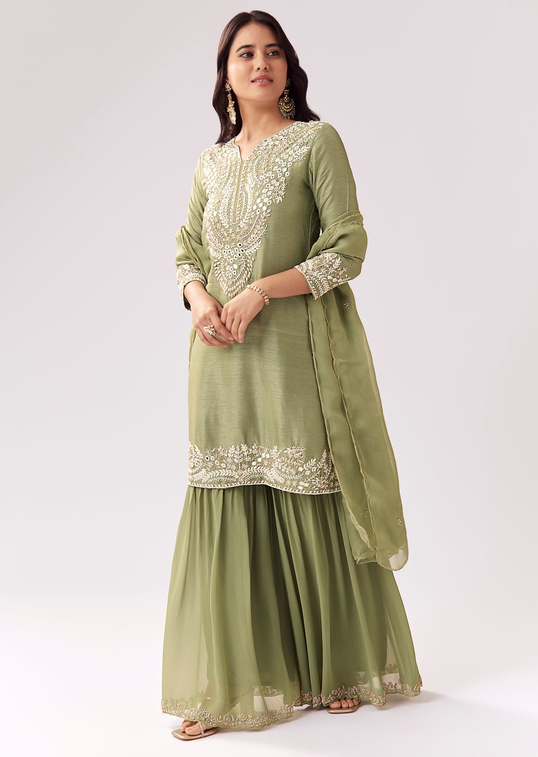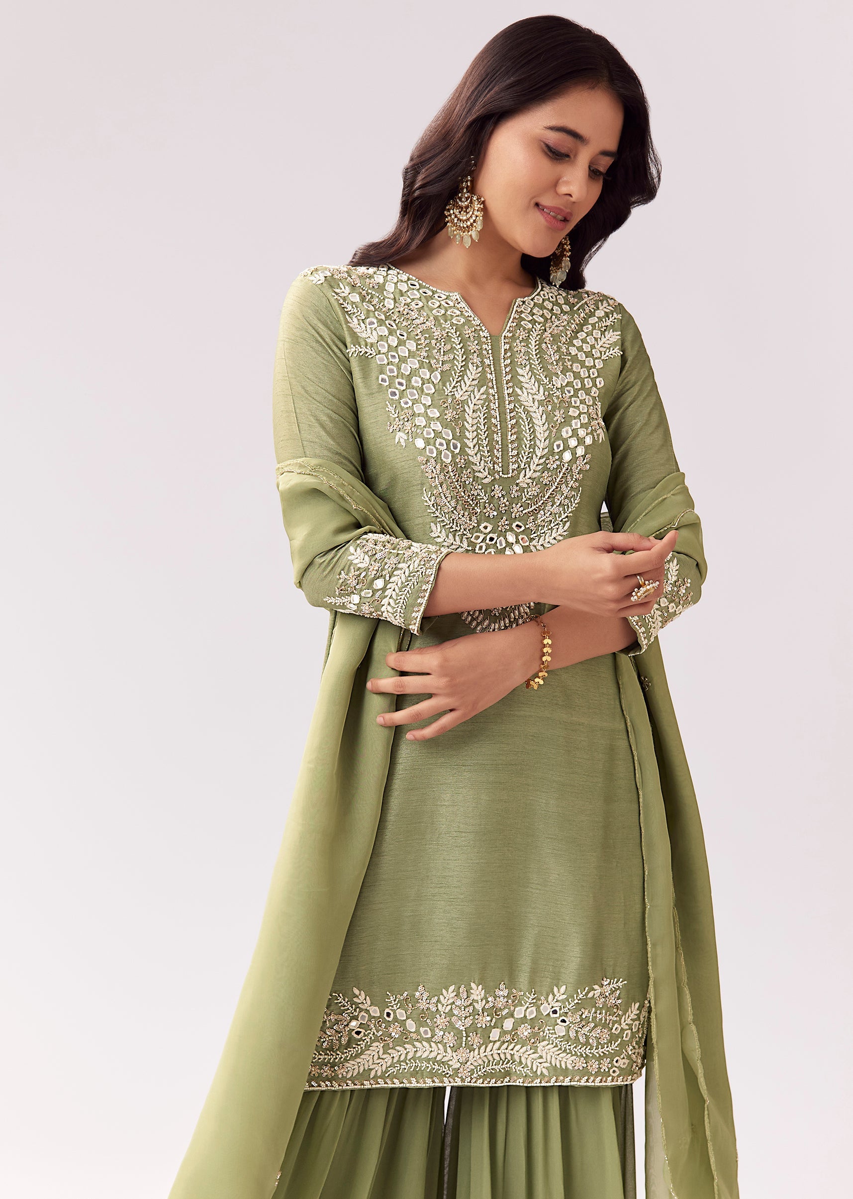 This sharara suit blends a soft pista green shade with festive embellishment including mirror, sequins, and moti work. The kurta is styled in a straight silhouette with 3/4 sleeves and... More Product Details