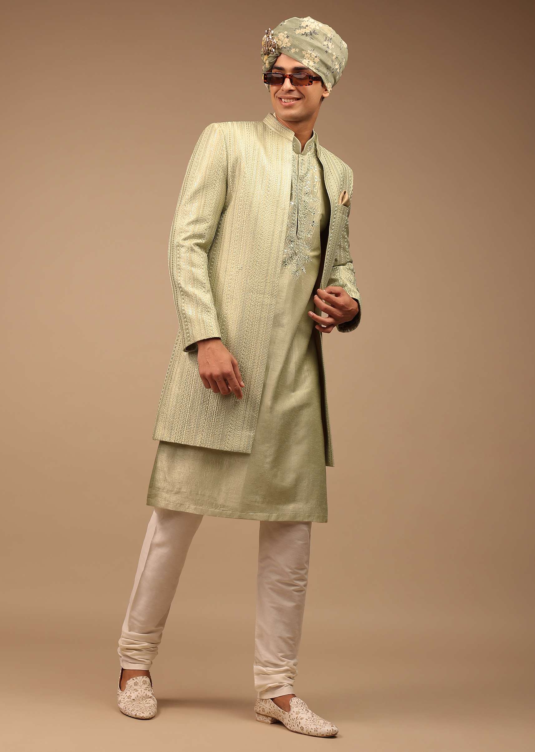 Pista Green Sherwani With Intricate Resham And Mirror Work