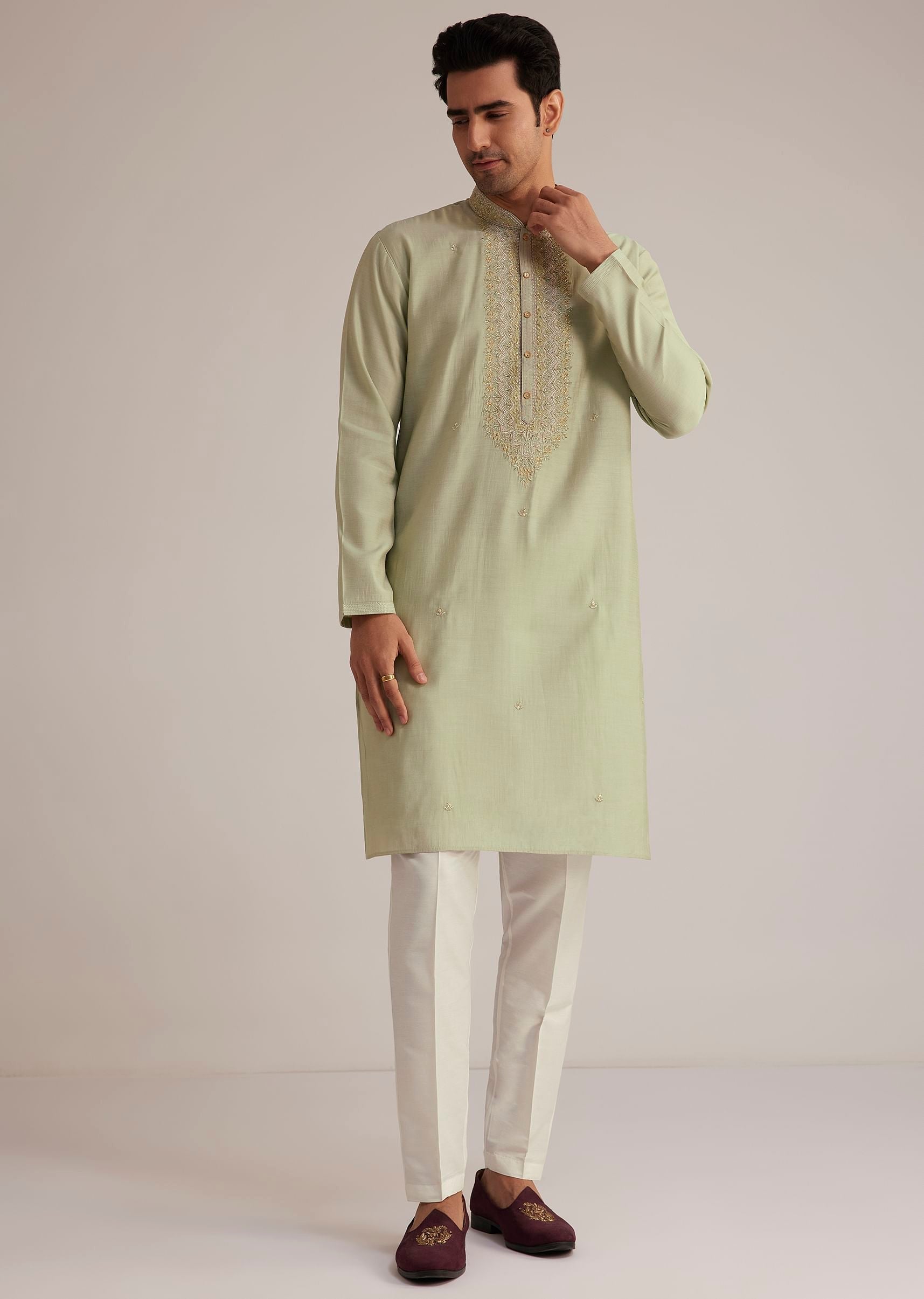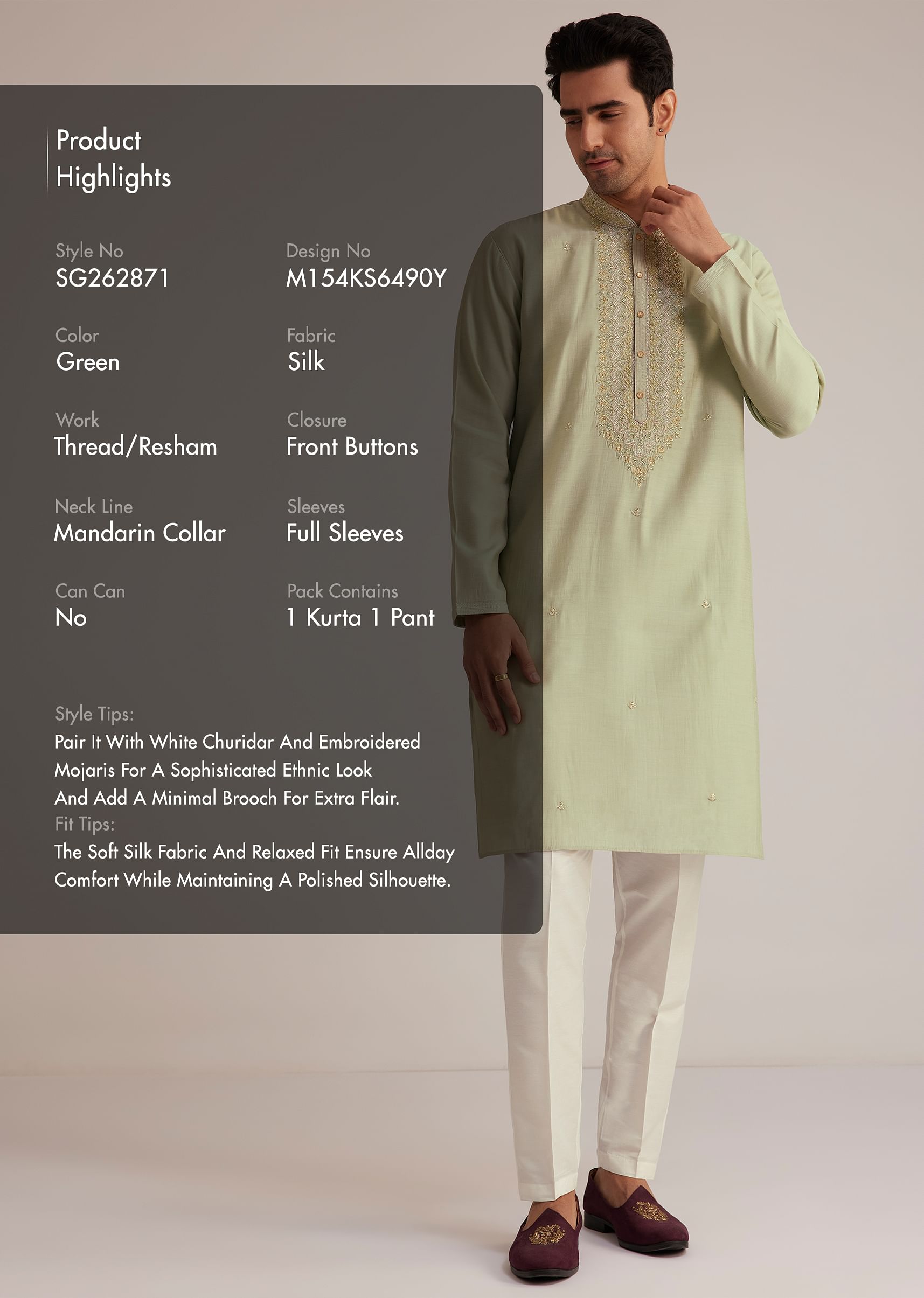 - Embrace Understated Elegance With This Pista Green Silk Kurta, Adorned With Fine Thread Embroidery On The Placket.