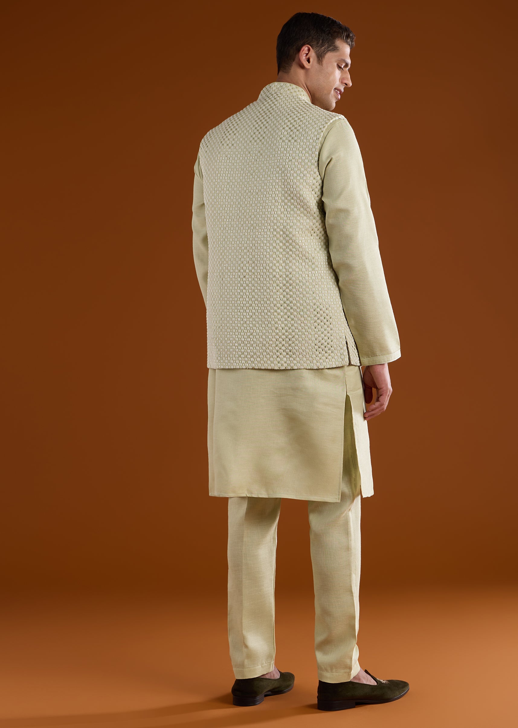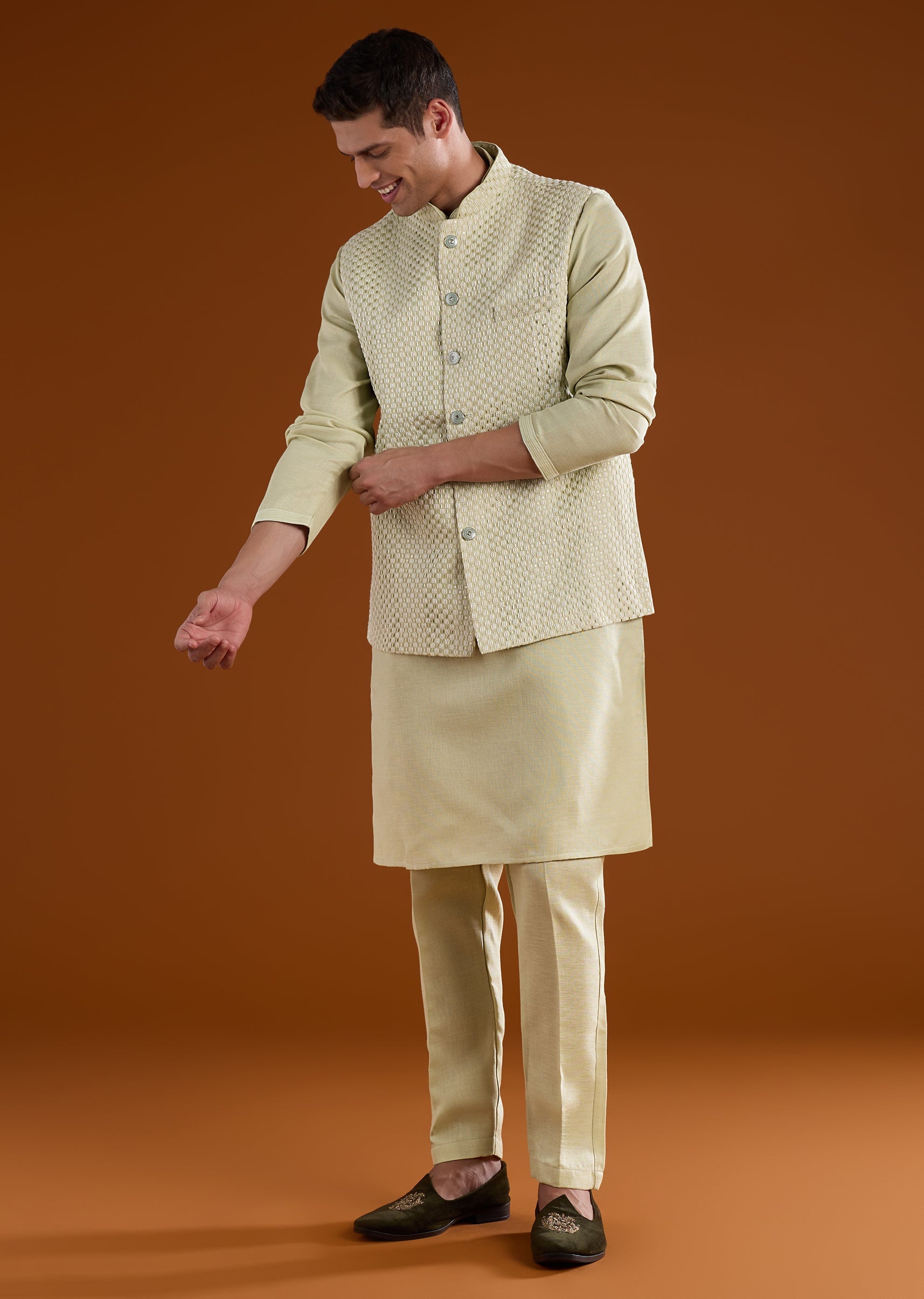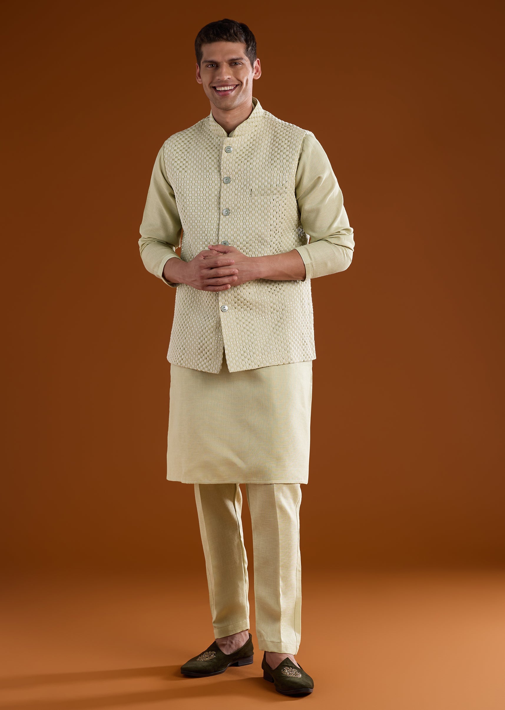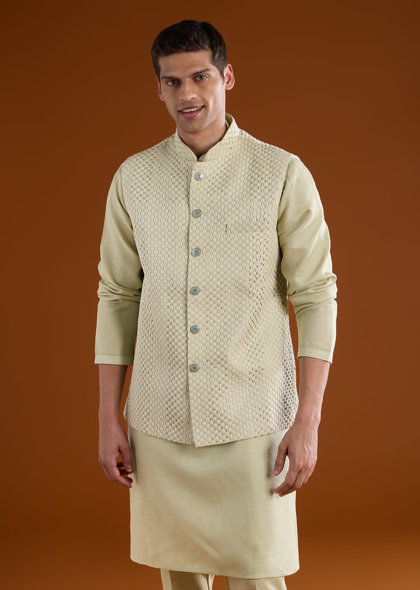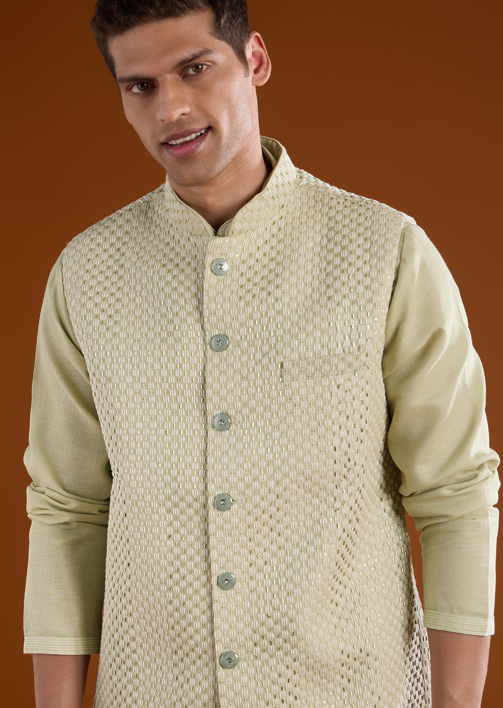 A serene pista green silk kurta jacket set crafted for festive pooja and celebratory occasions, perfect for wedding guests or groomsmen seeking classic minimal elegance. Detailed with delicate thread, bead, and metal work, it offers subtle texture and refined charm. The full sleeves and mandarin collar create a structured silhouette for a polished traditional look. Awarded as the Most Trusted Brand, we're delivering styles you love, just as promised.