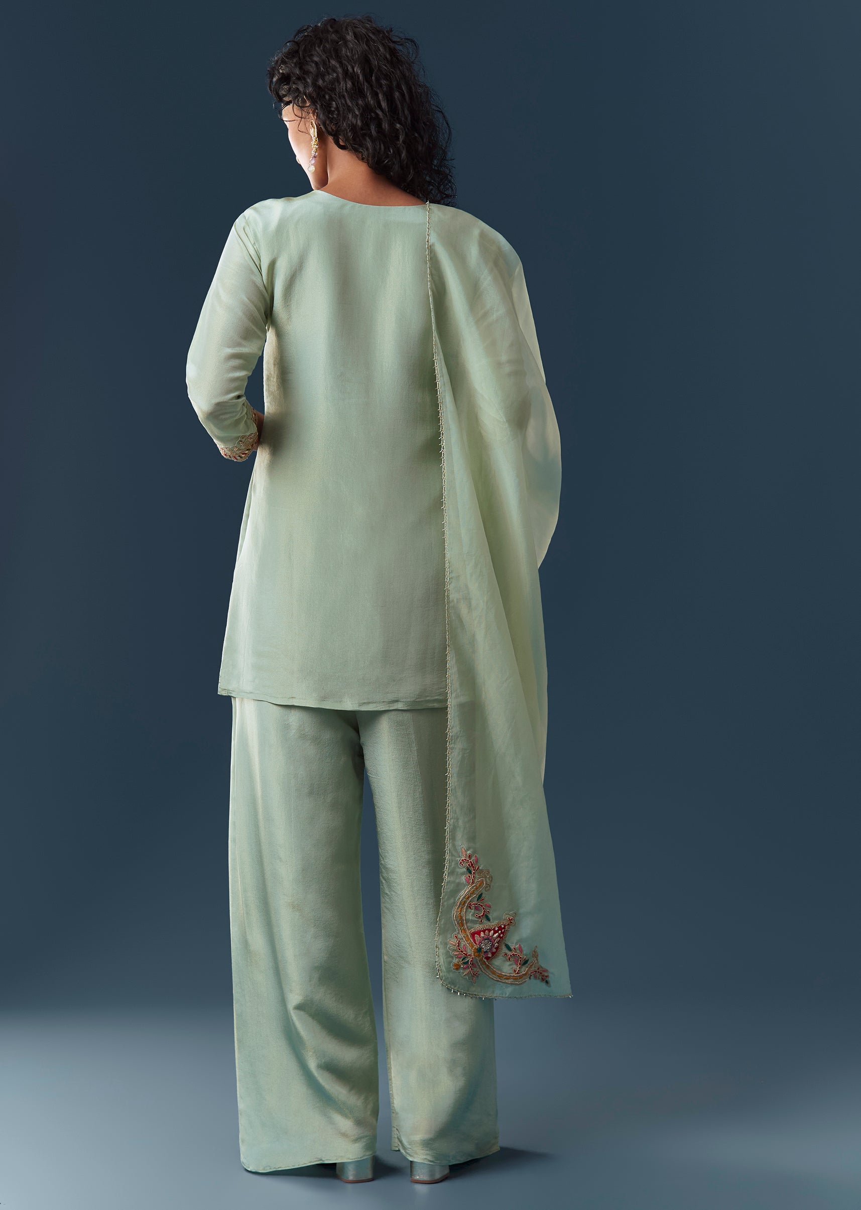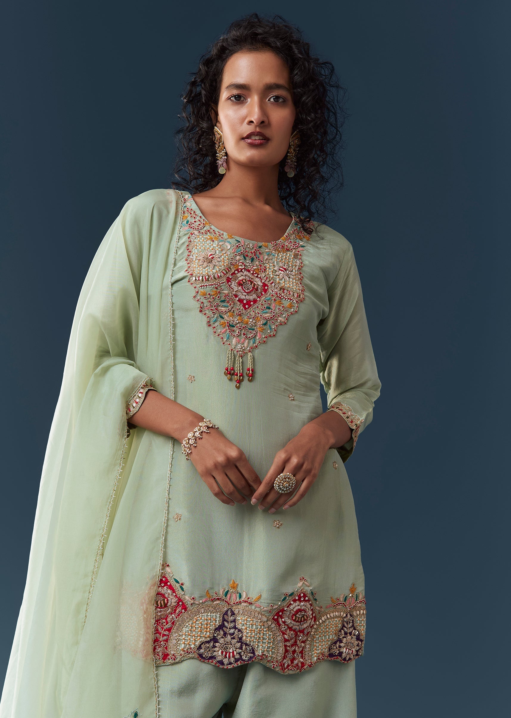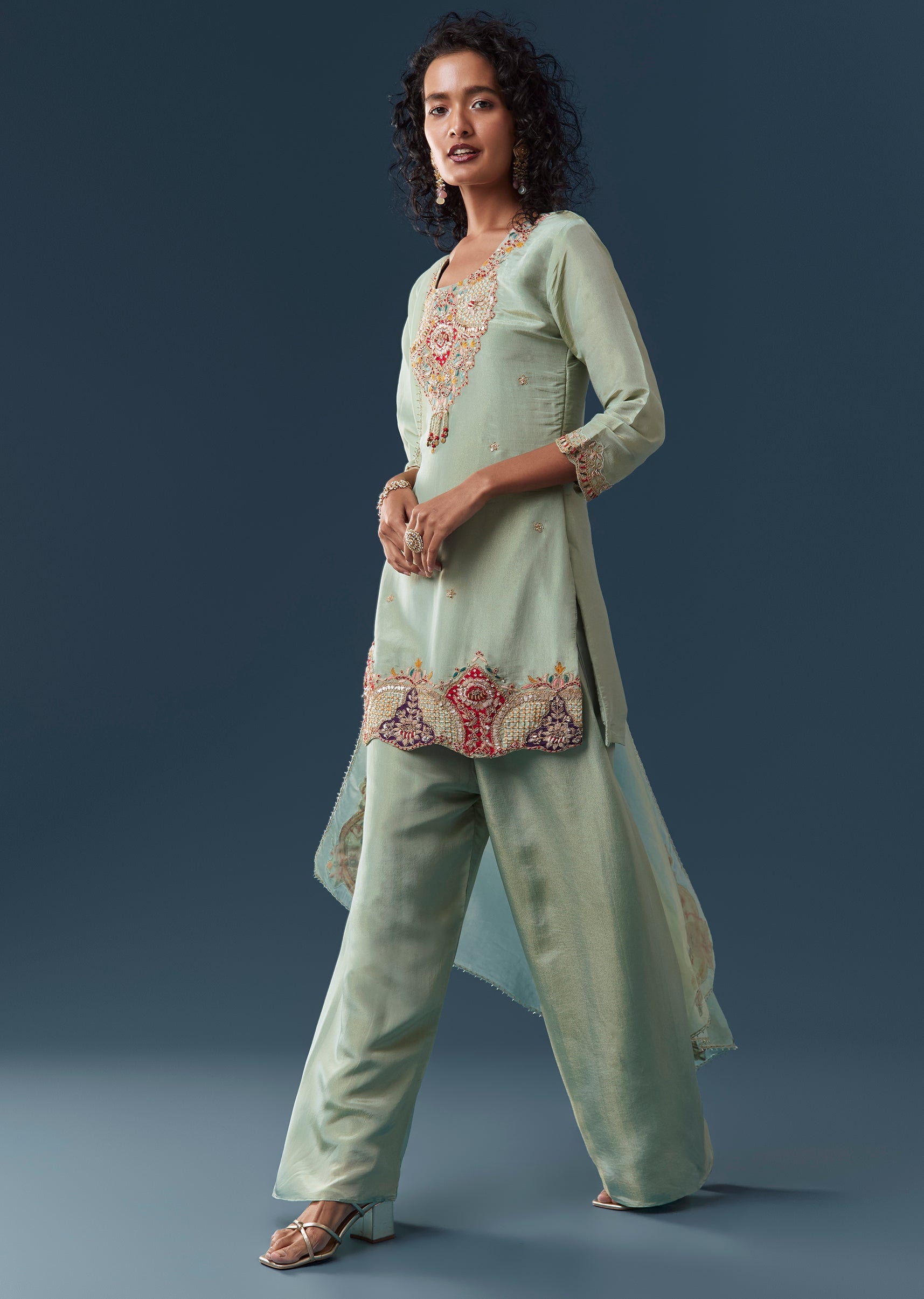 Crafted in luminous tissue, this pista green straight kurta set features zardosi and thread embroidery with patch-work accents for a festive, Pakistani-inspired look. Styled with a round neckline and 3/4th... More Product Details