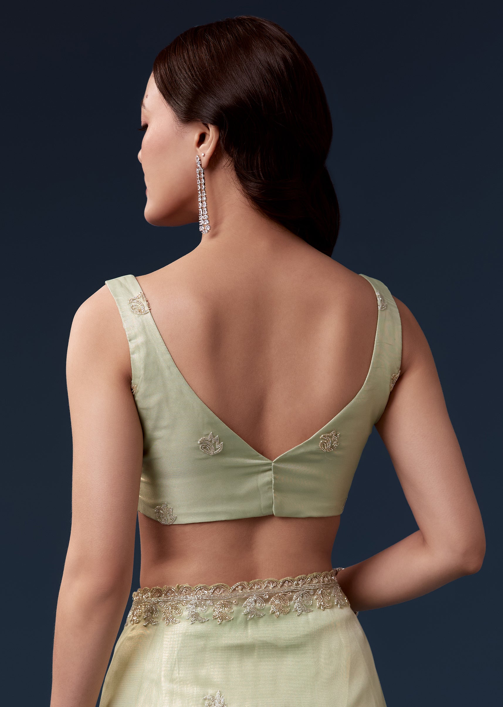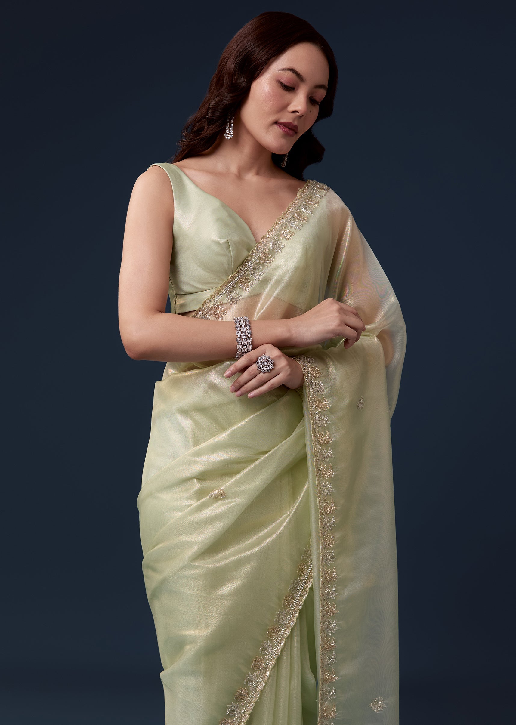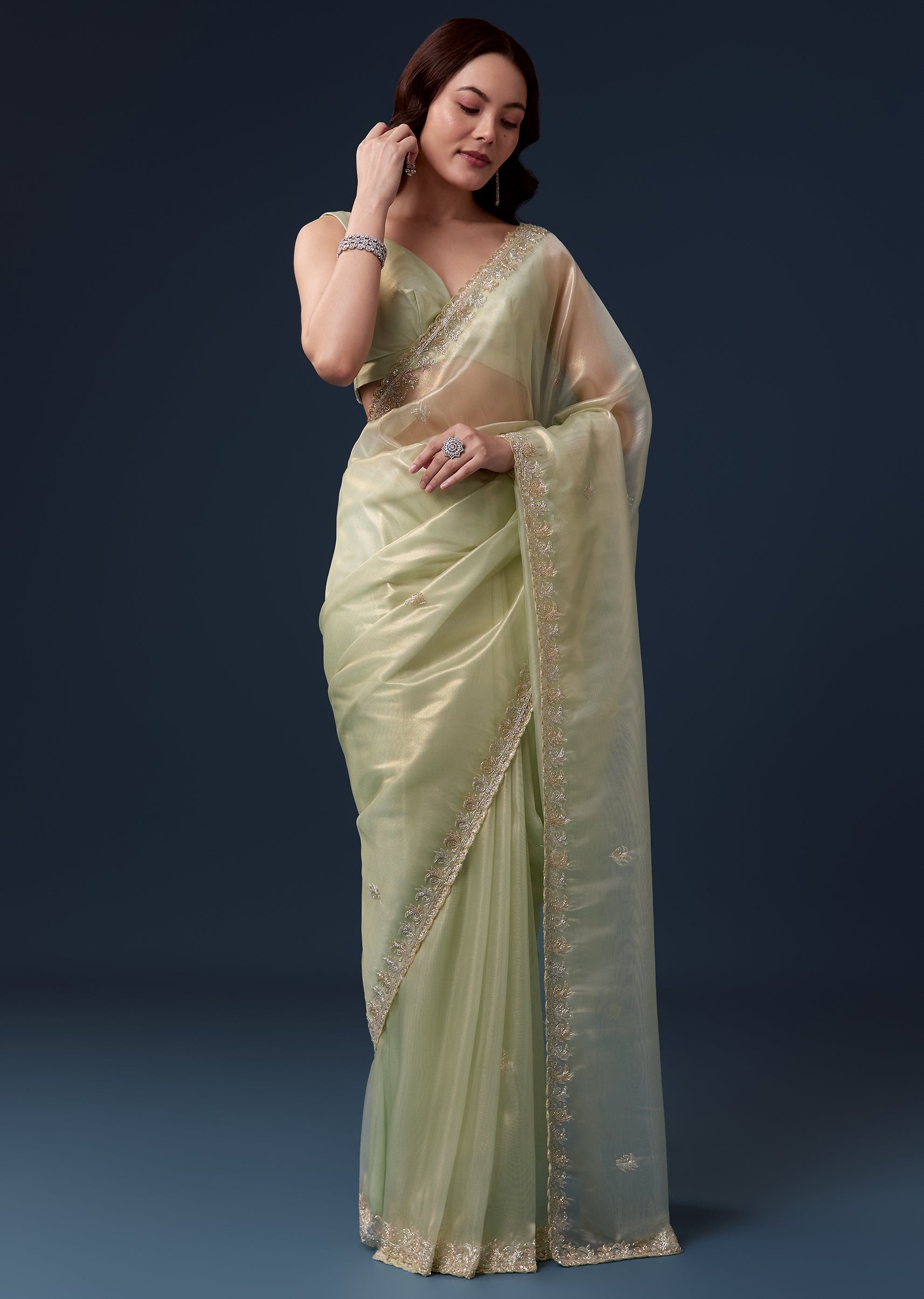 Pista Green Tissue Saree With Cutdana Beads And Sequin Embroidery