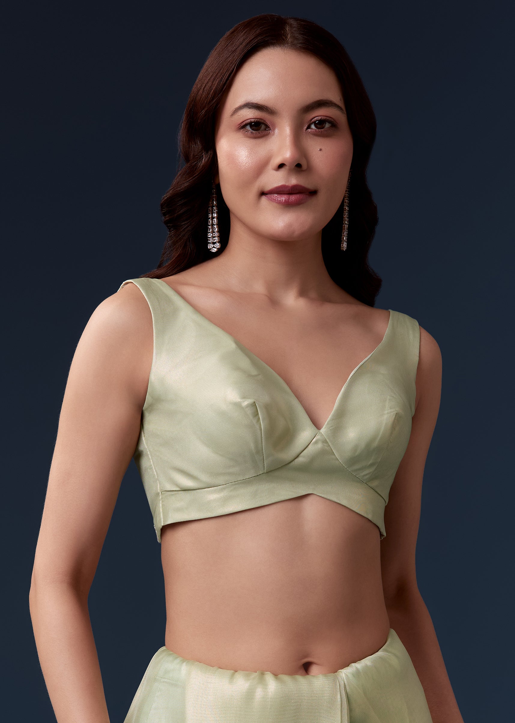 Soft, refreshing, and festive, this pista green tissue saree is perfect for mehendi and reception celebrations as a wedding guest. The delicate pastel hue is enhanced with a scalloped embroidered... More Product Details