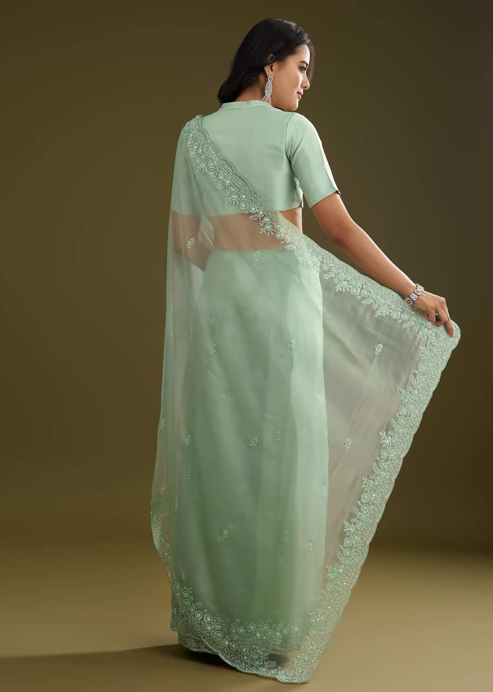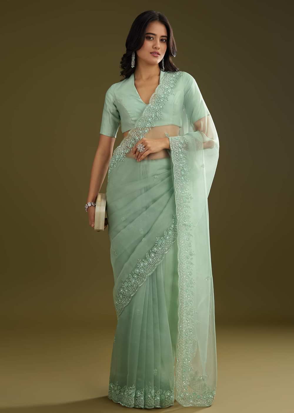 This pista green saree in elegant tissue fabric is tissue saree in pista green with scallop border embroidered with sequins and cutdana. A timeless addition for celebrations and special occasions. Awarded as the Most Trusted Brand, we're delivering styles you love, just as promised.