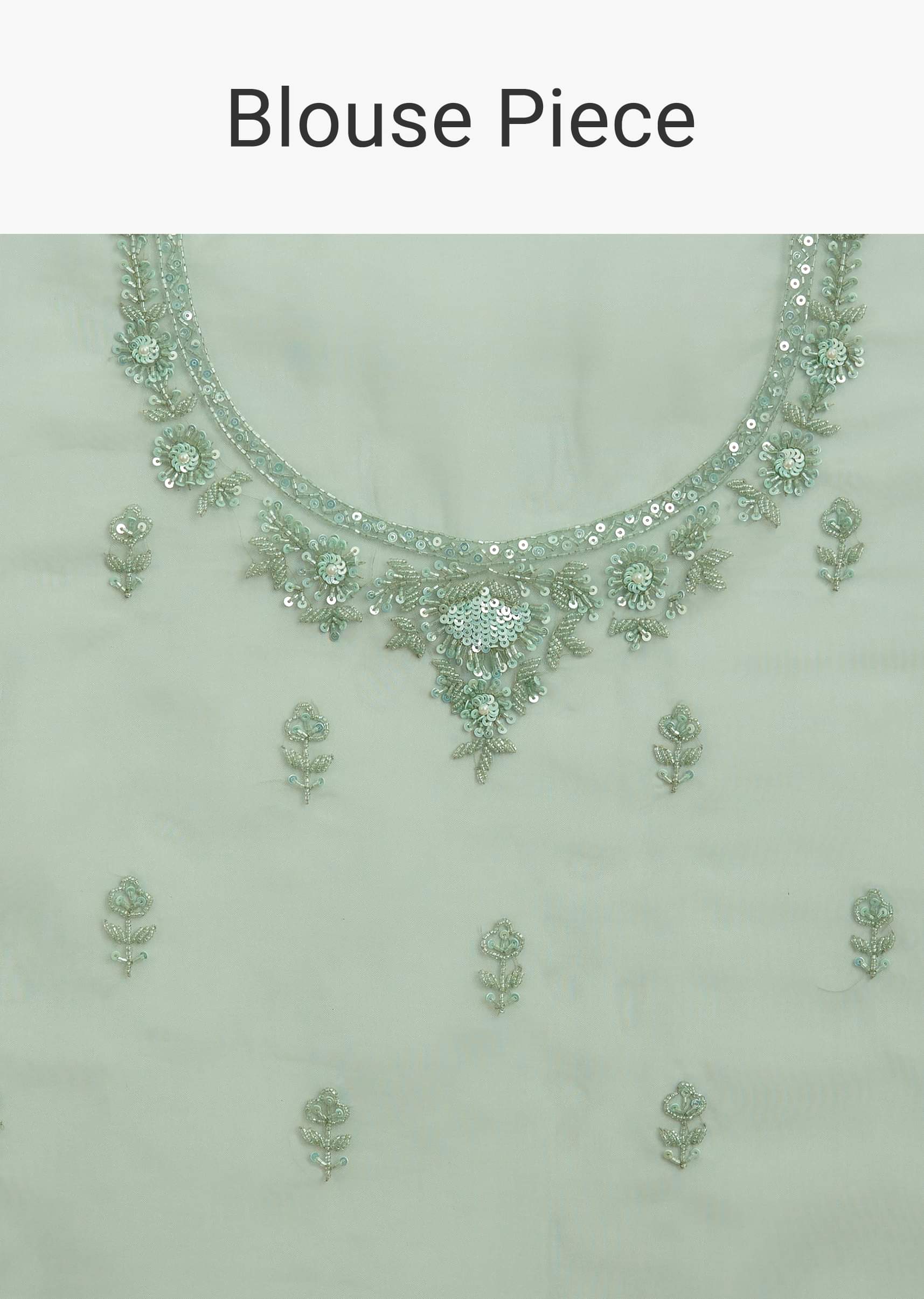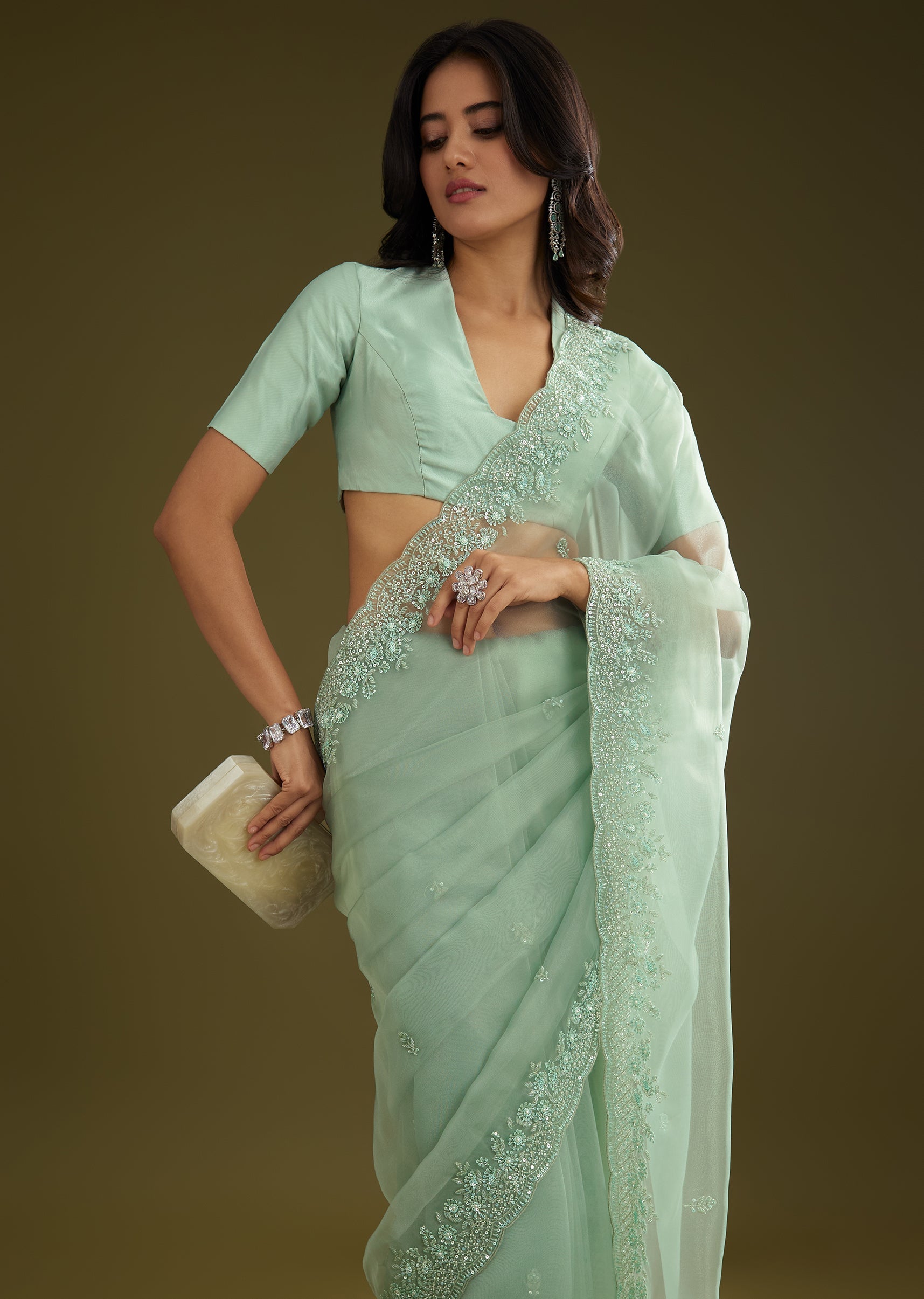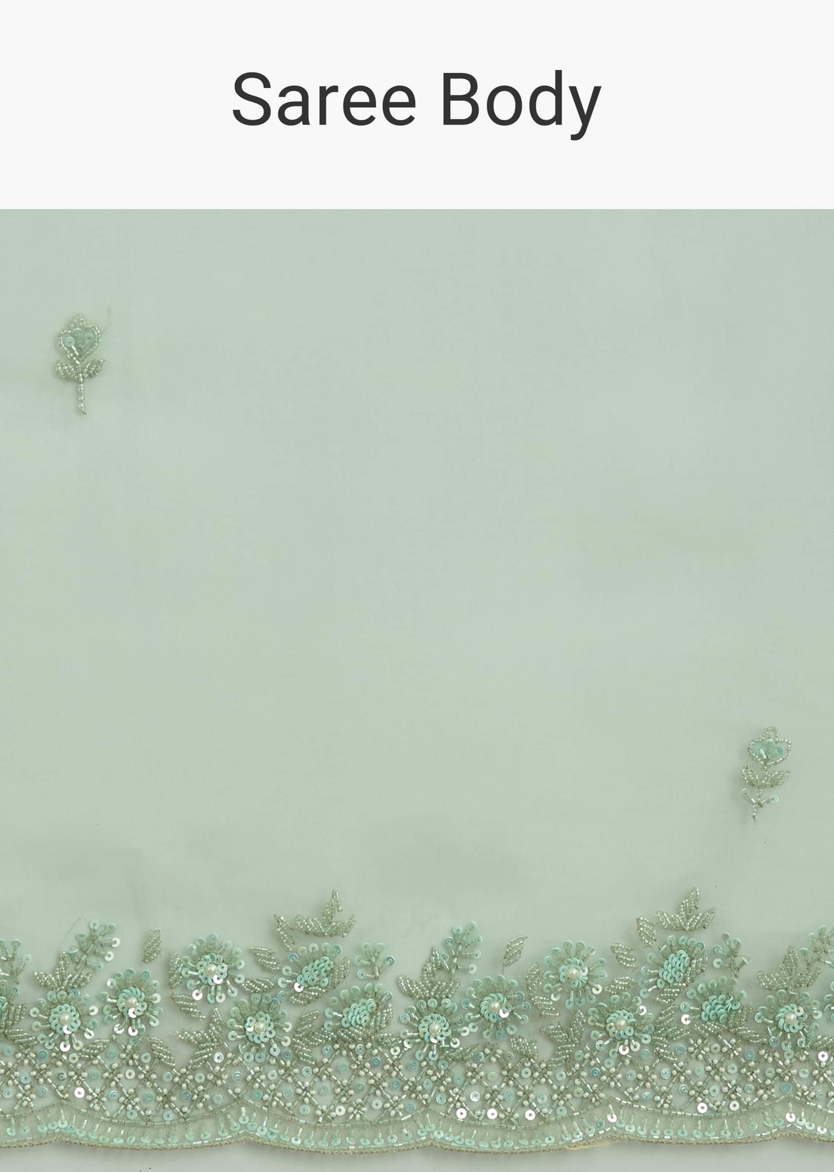 Pista Green Tissue Saree With Embroidered Scallop Border