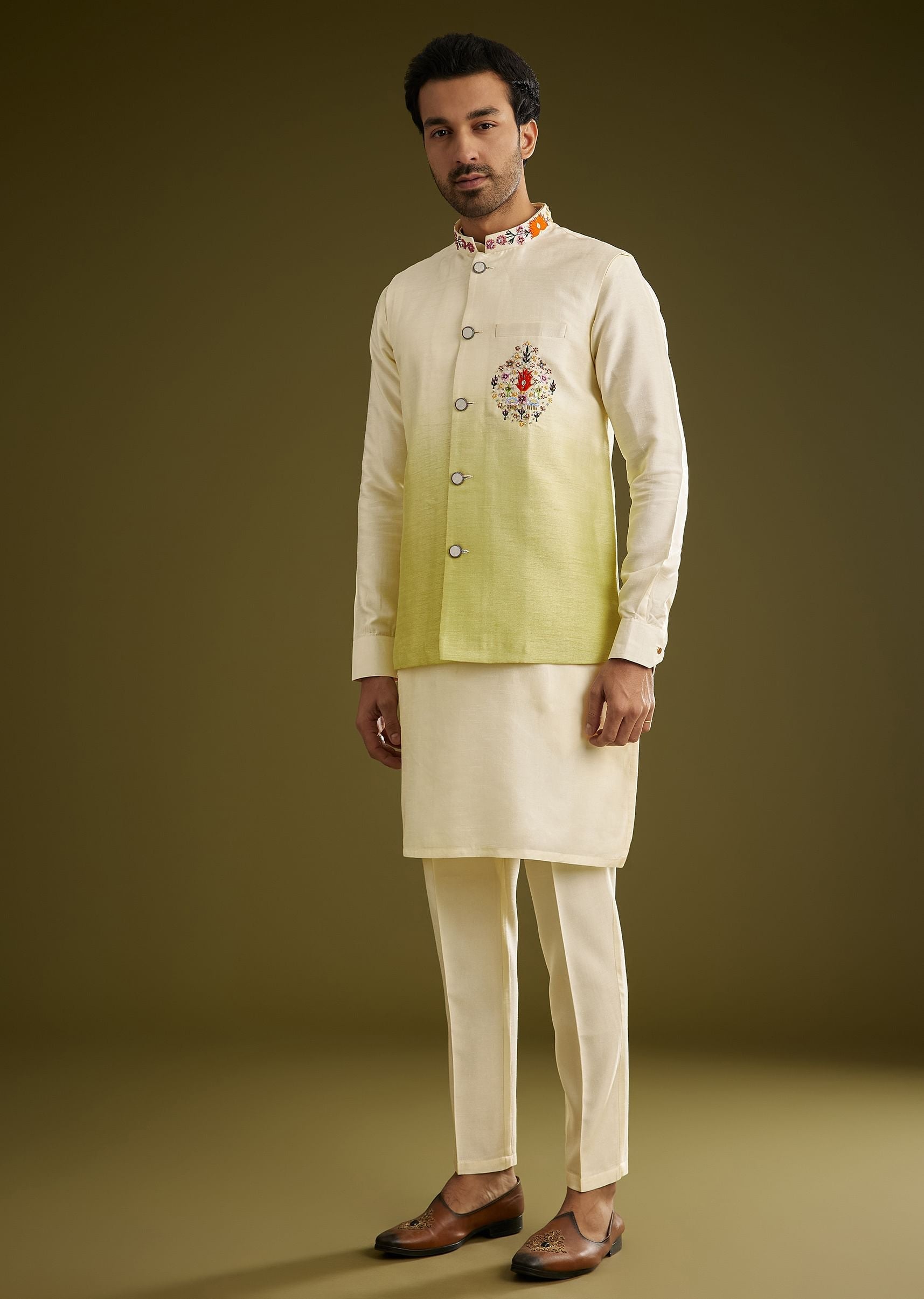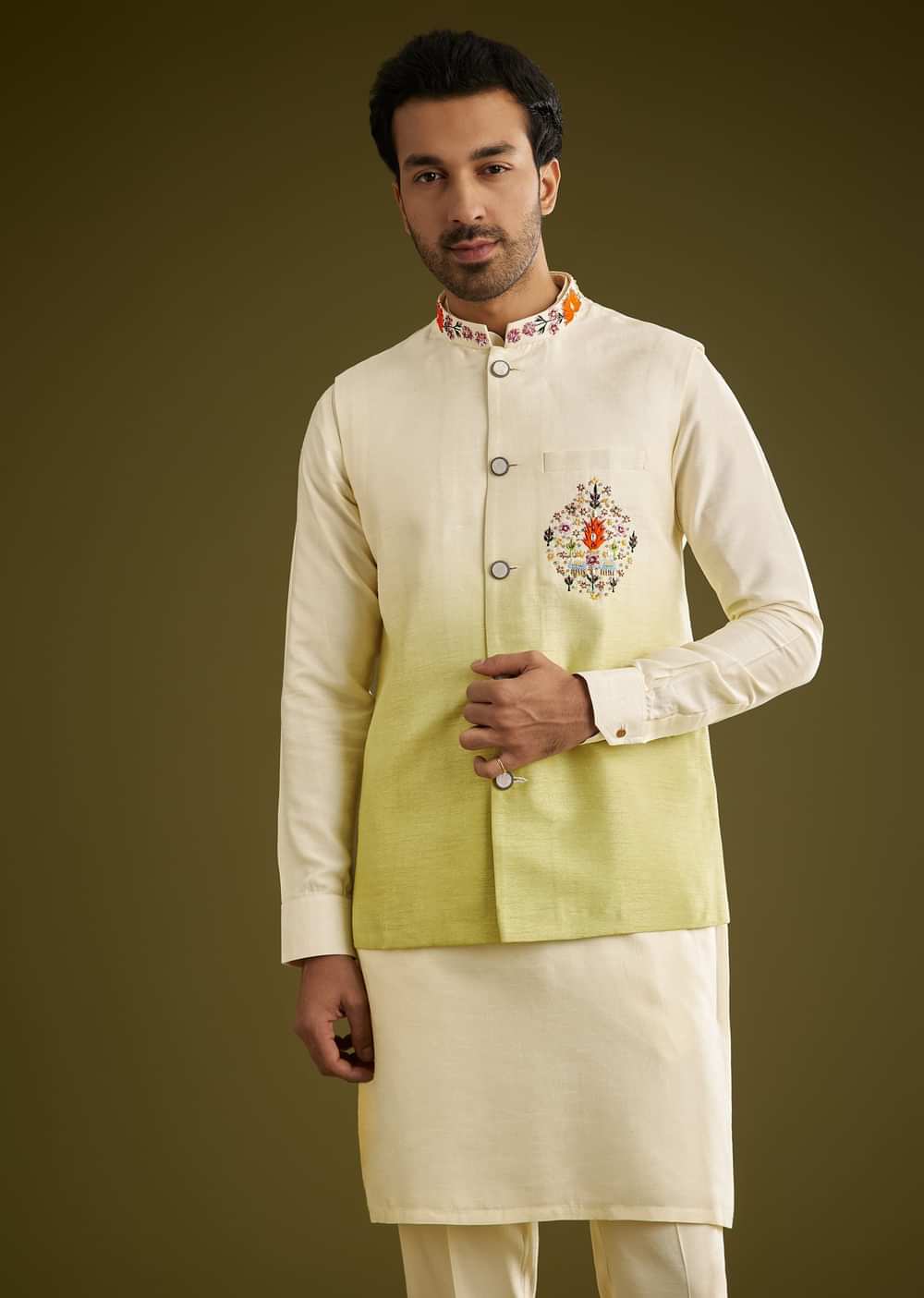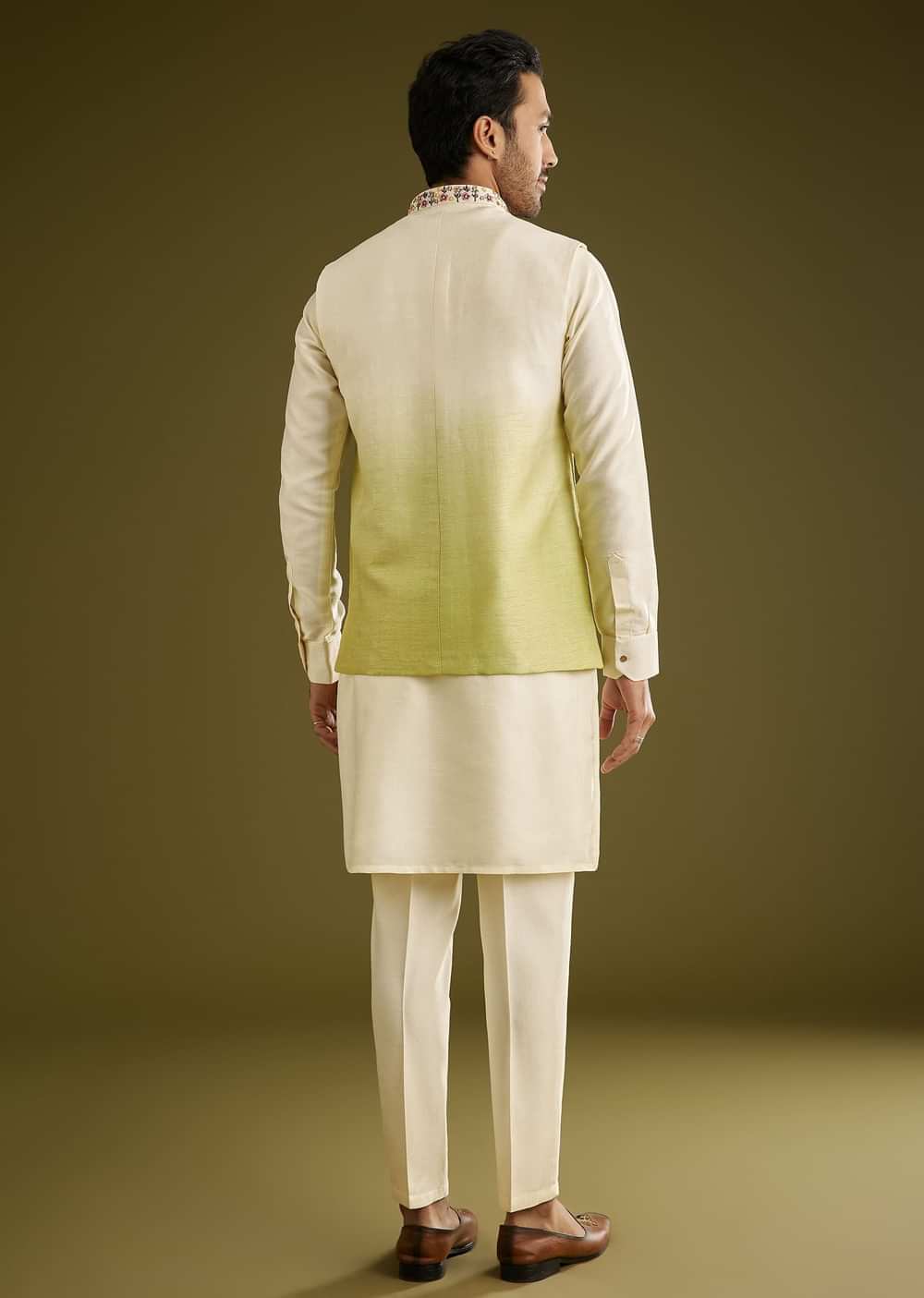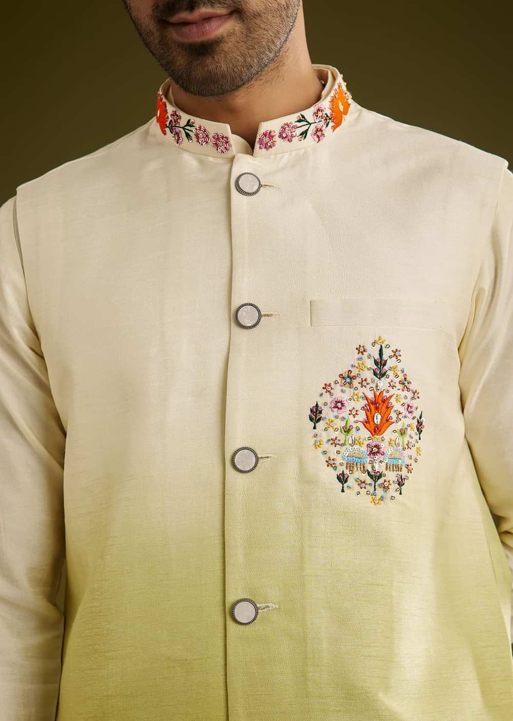 Pista Ombre Green Silk Kurta Jacket Set With Thread Work