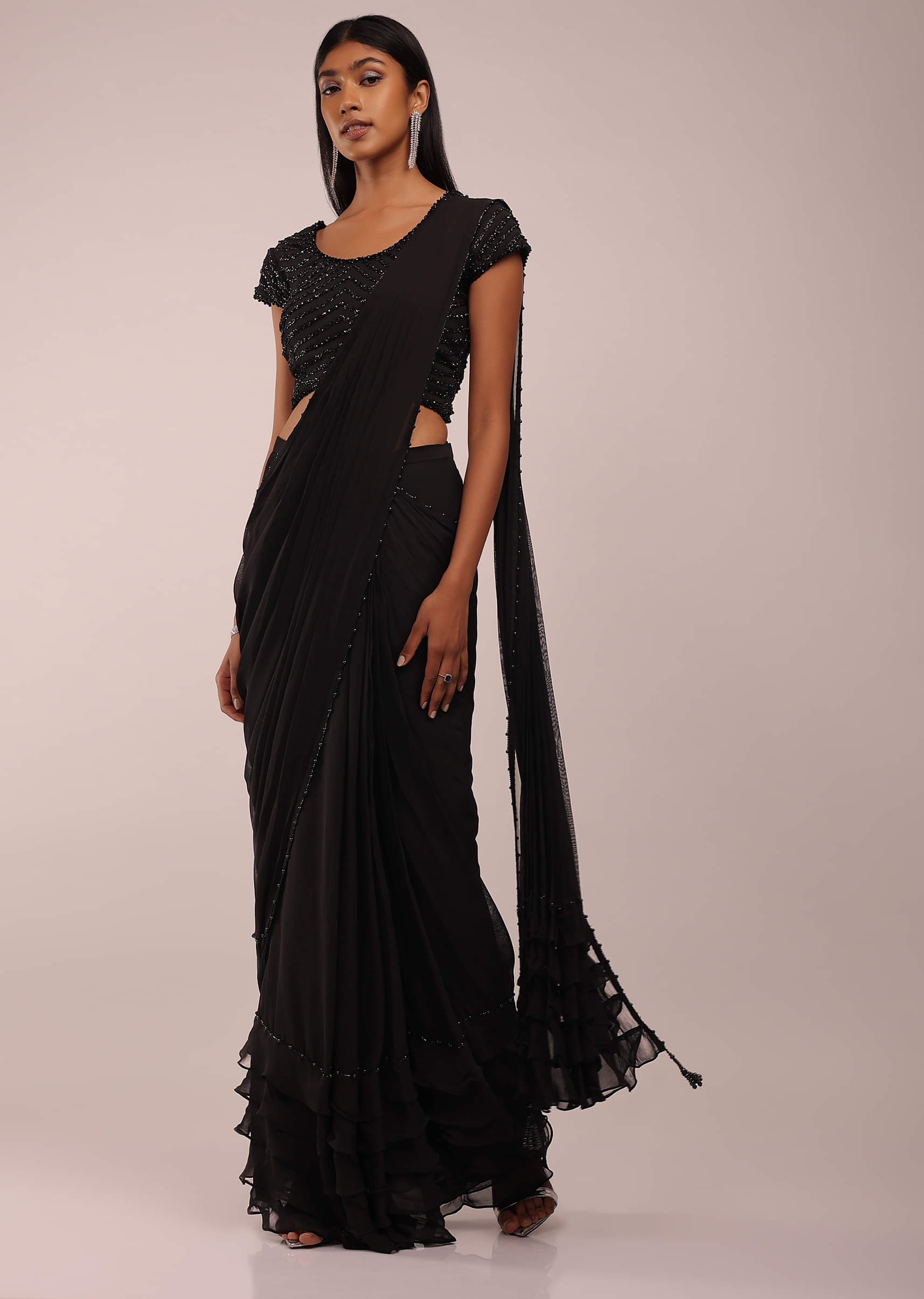 Pitch Black Saree With Three Tones Of Layered Frills On The Bottom Embellished In Stones And Sequins With A Tassel On The Pallu Corner