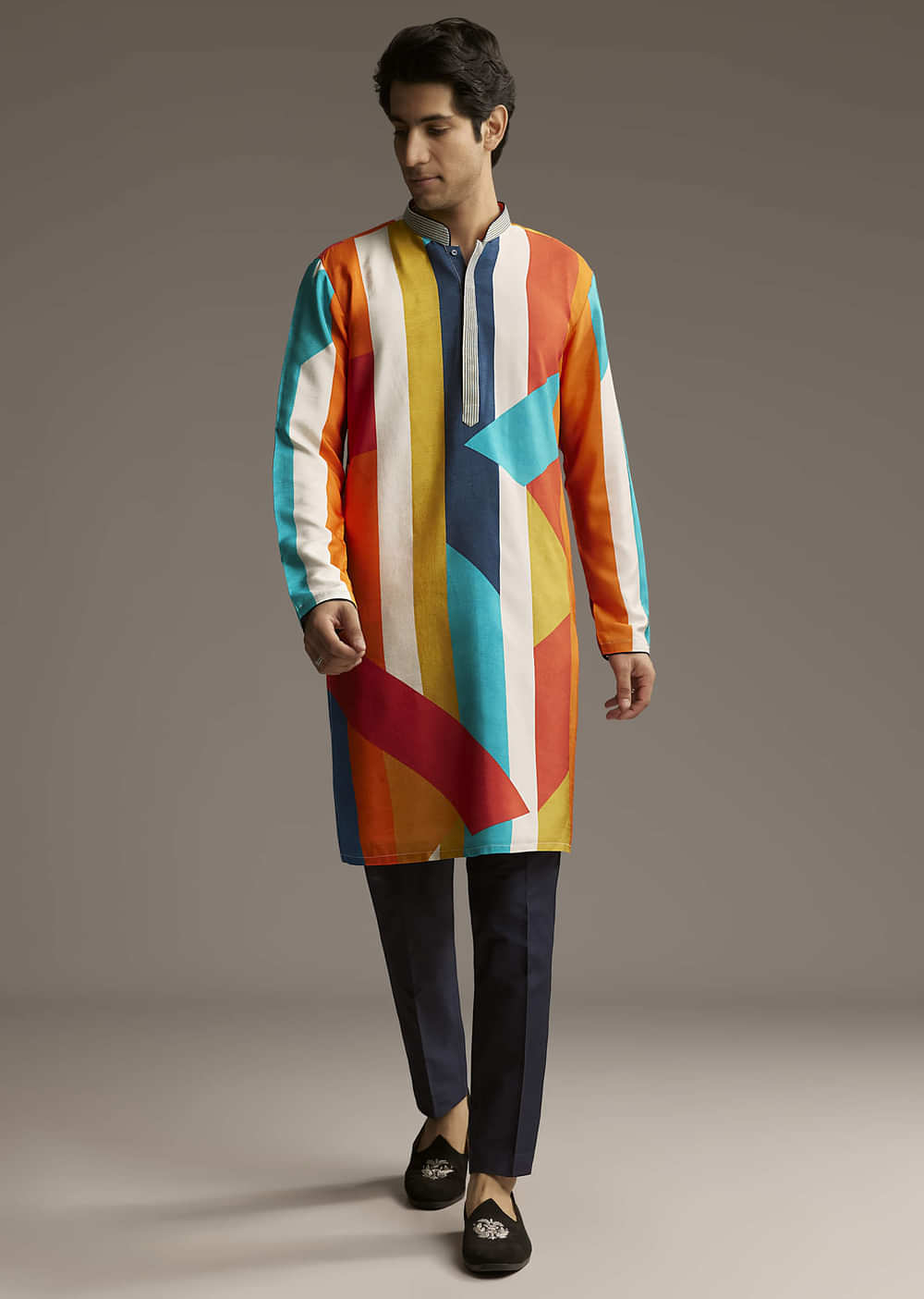 Poppy Multicolour Silk Kurta Set For Men With Print