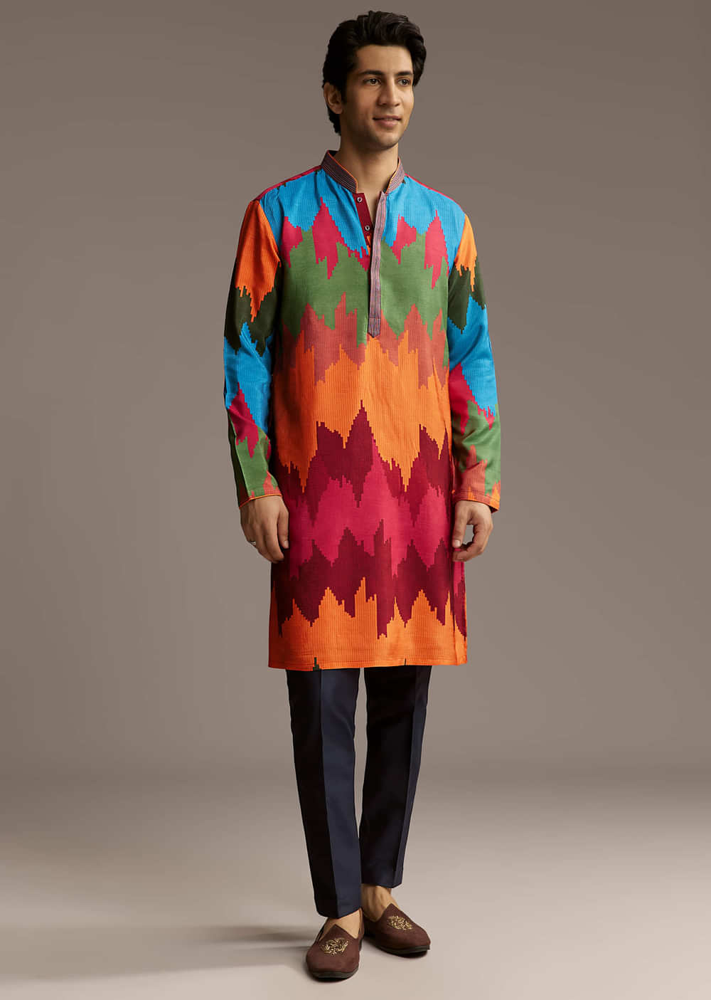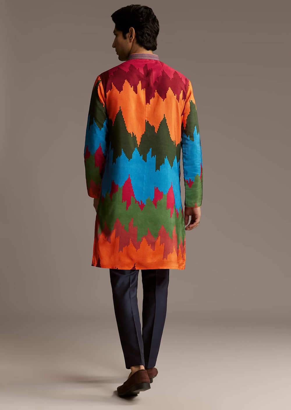 A splash of colour defines this poppy multicolour silk kurta set for men. The vibrant zigzag print makes it feel artsy and bold, perfect for when you want to stand out. Awarded as the Most Trusted Brand, we're delivering styles you love, just as promised.