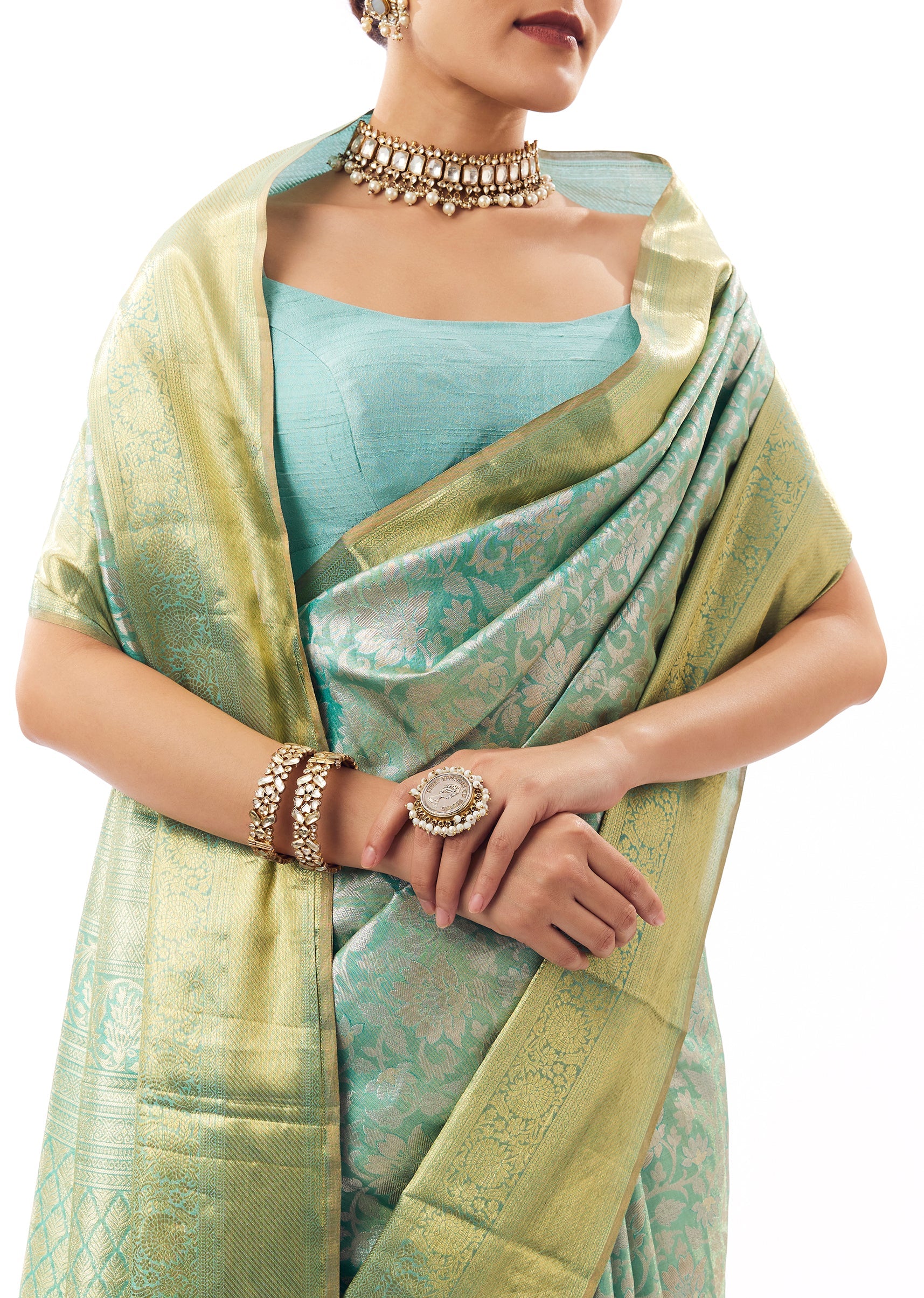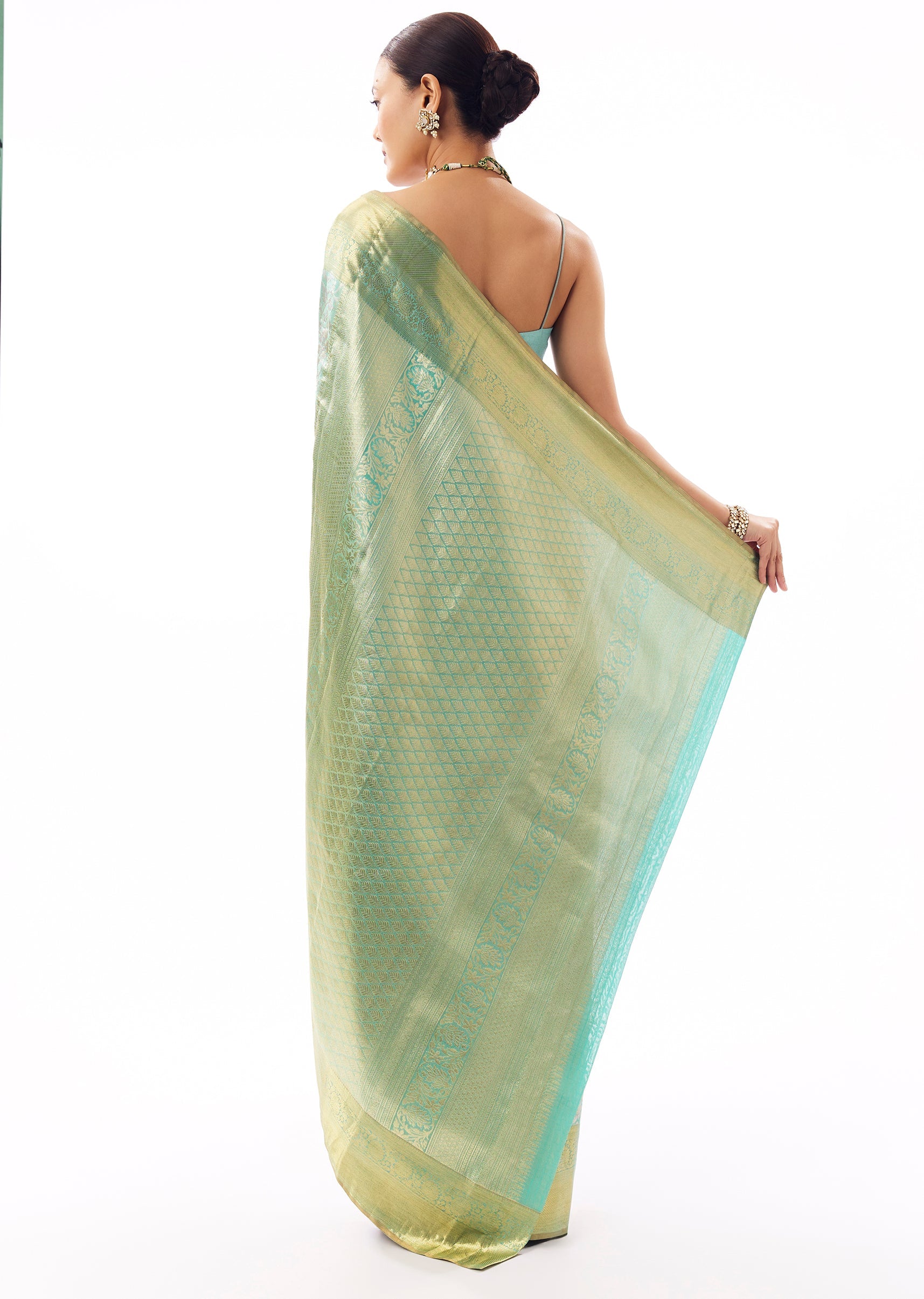 Fit Tips:Keep pleats slimmer for a clean front fall; pin pallu to keep the jaal pattern visible.