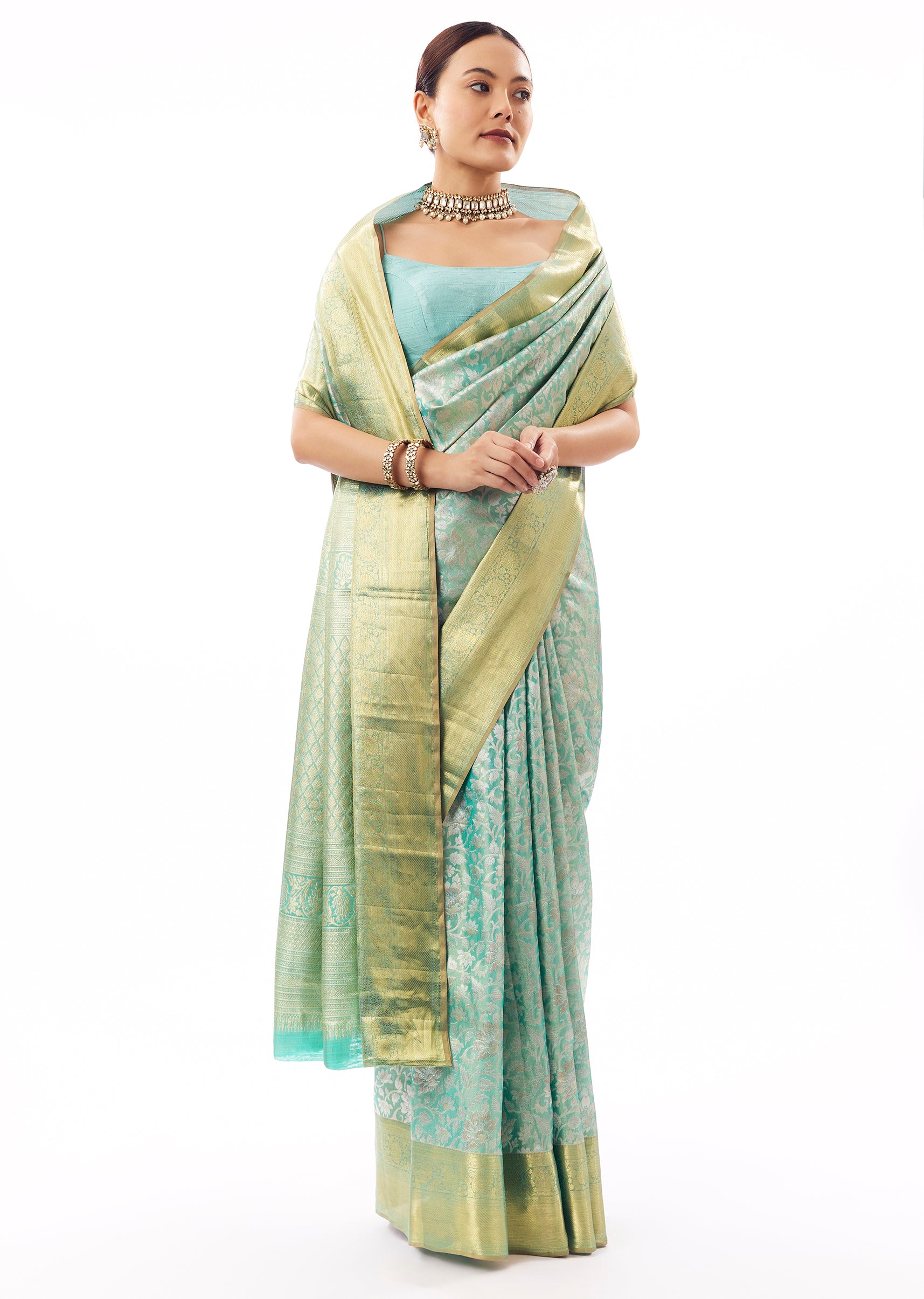 Fit Tips:Keep pleats slimmer for a clean front fall; pin pallu to keep the jaal pattern visible.
