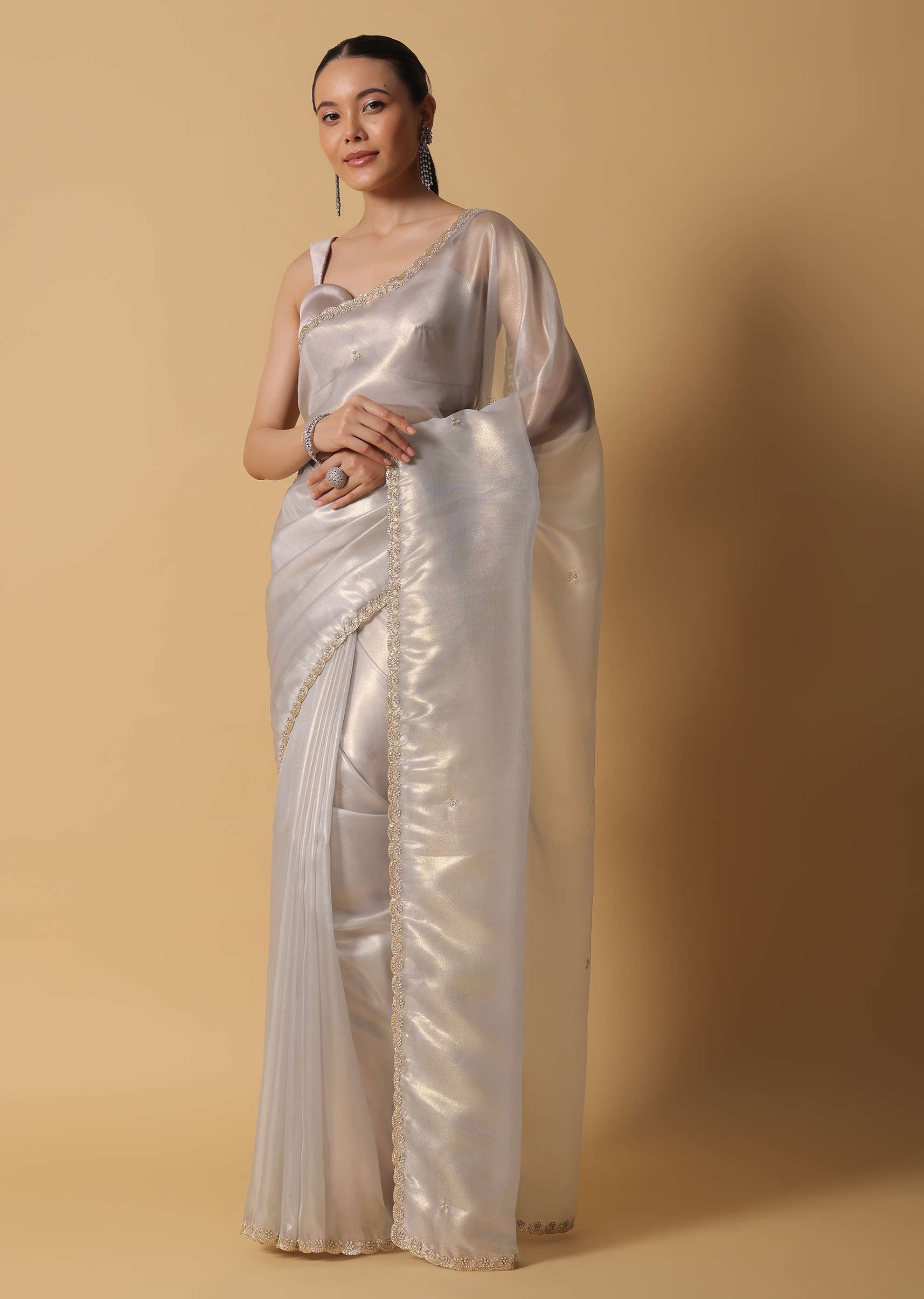 Experience pure opulence with our stunning powder green saree. Adding to its grandeur, the saree is adorned with a foil print along with intricate pearl and cut dana embroidery on the borders. The saree comes with an unstitched blouse with a similar embroidery buttis. NOTE - The blouse worn by the model is for styling purpose only. EVENT - Perfect for festive celebrations and wedding receptions. Awarded as the Most Trusted Brand, we're delivering styles you love, just as promised.