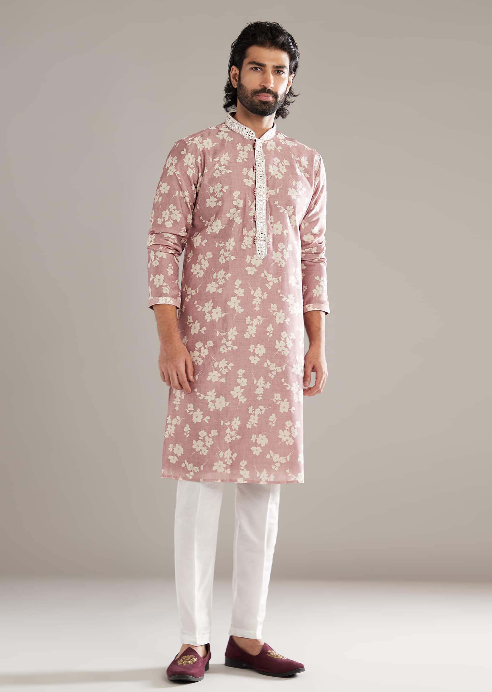 Powder Pink Kurta Set For Men With Floral Print And Mirror Work