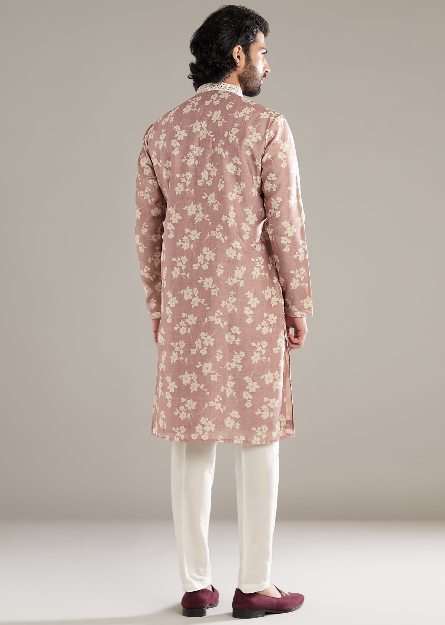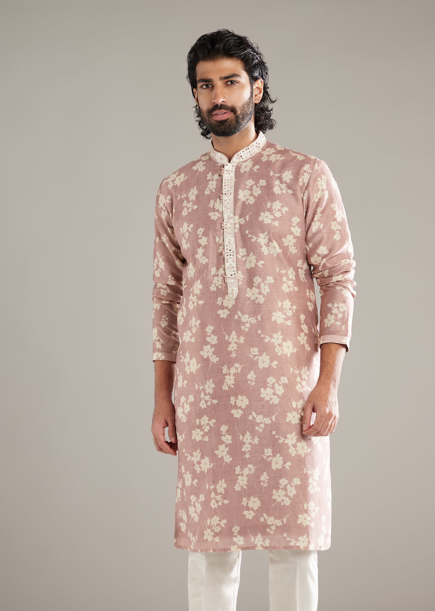 This powder pink linen blend men’s kurta set lays a soft floral print over a clean base, finished with potli buttons and mirror work along the placket and collar for... More Product Details