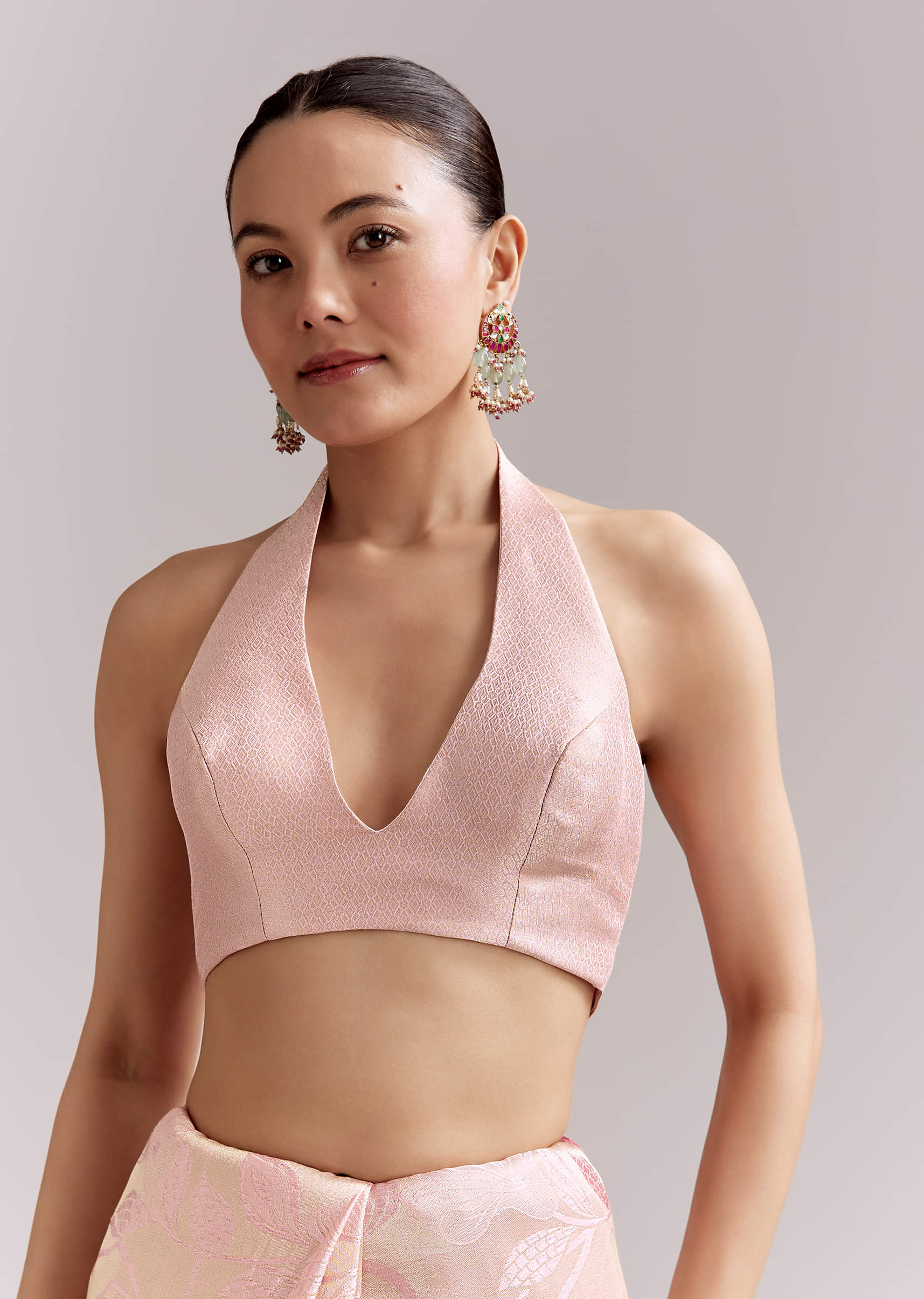 A gentle sheen follows you as this powder pink satin saree glides from hallway to photos without fuss. Chain-stitch lifts the print; delicate touches of zari, zardosi, sequins, and beadwork... More Product Details
