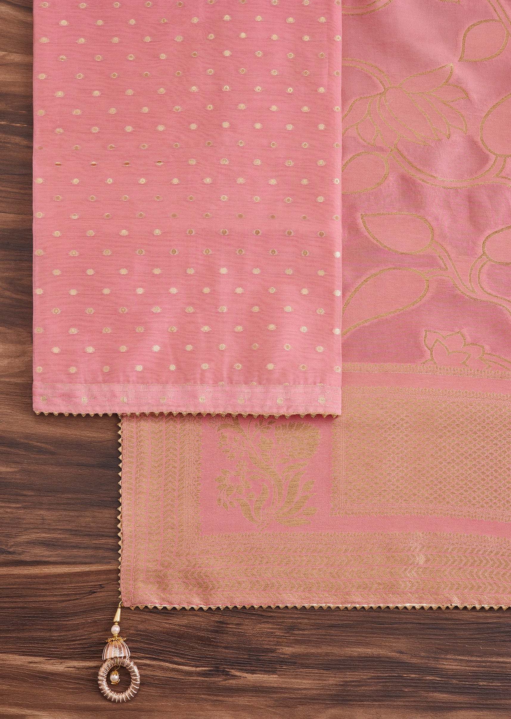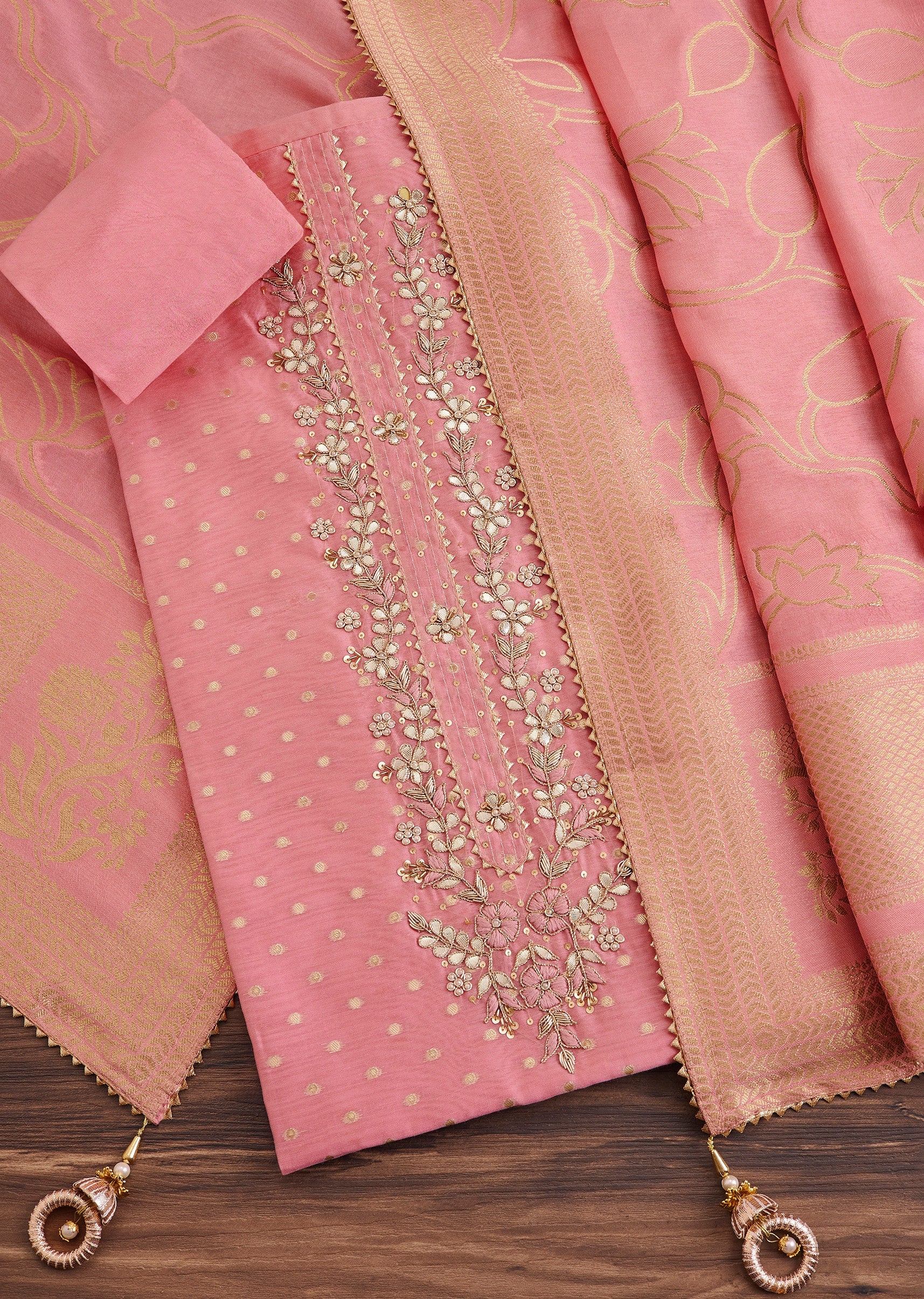 Crafted from lightweight chanderi, this pink unstitched suit features intricate embroidery that enhances its soft pastel charm. Complete with matching bottom fabric and dupatta. Awarded as the Most Trusted Brand,... More Product Details